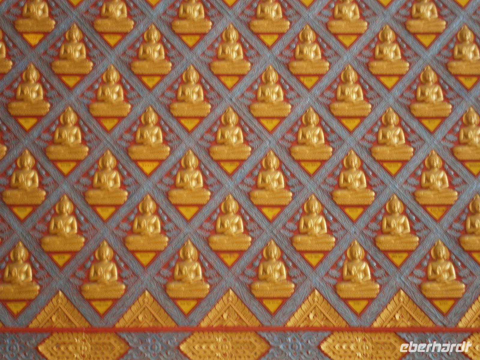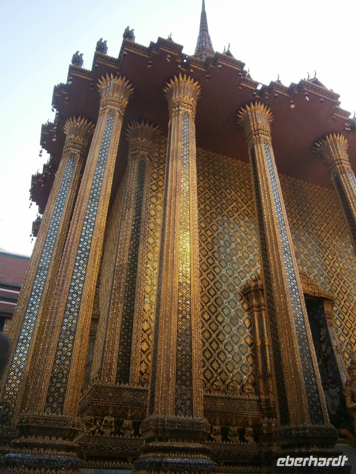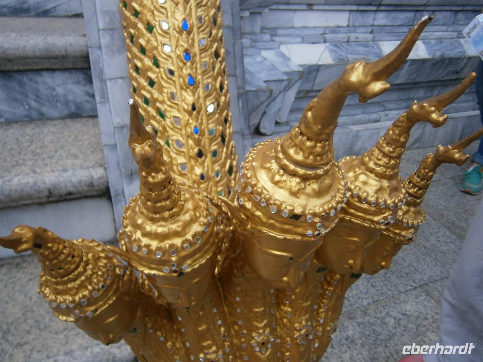 Im Tempel Wat Phra Keao, offiziell Wat Phra Sri Rattana Satsadaram, bestaunen wir den Smaragd-Buddha. Die kleine Statue sitzt auf einem goldenen Thron, der bereits während der Zeit des Königs Rama I. hergestellt wurde. Um seine Bedeutung zu unterstreichen, setzte man ihn zusätzlich auf eine Basis von 11 Meter Höhe.