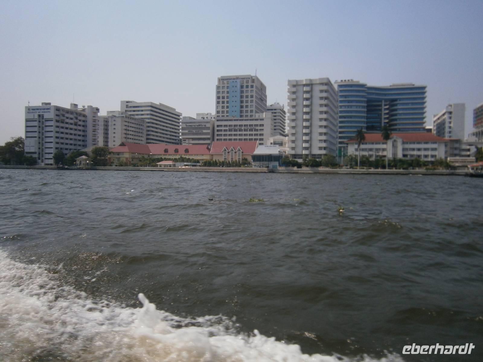 Schließlich geht es mit dem Boot zum Wat Arun. Wer die vielen schmalen Stufen nach oben überwindet, wird mit einem herrlichen Blick auf die Umgebung am Fluss belohnt.