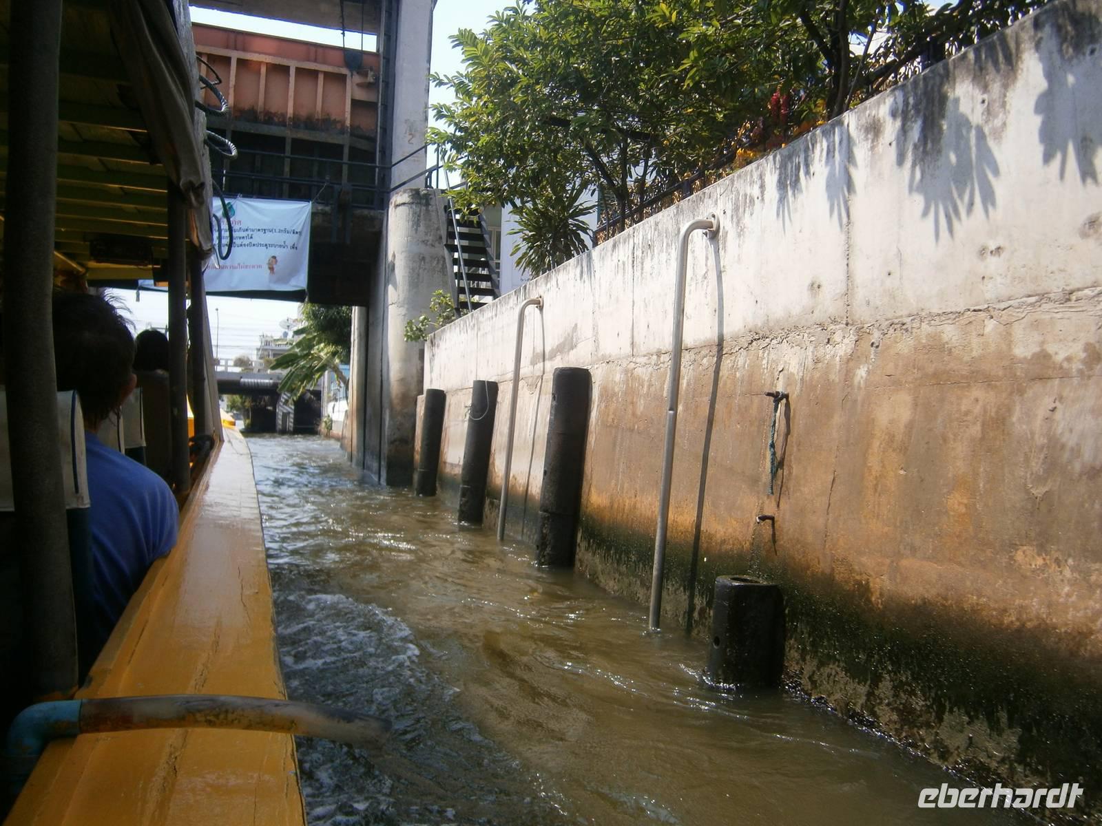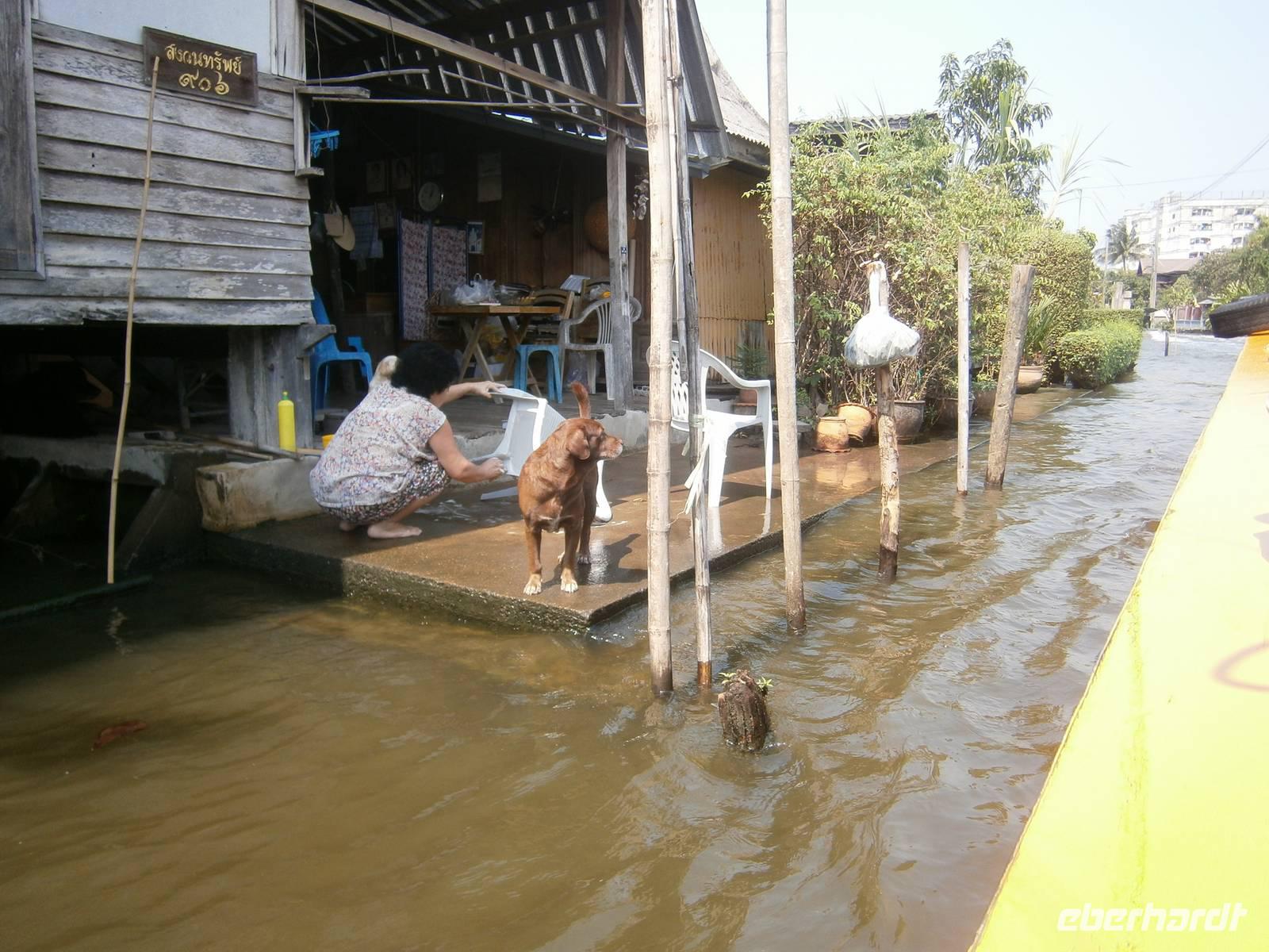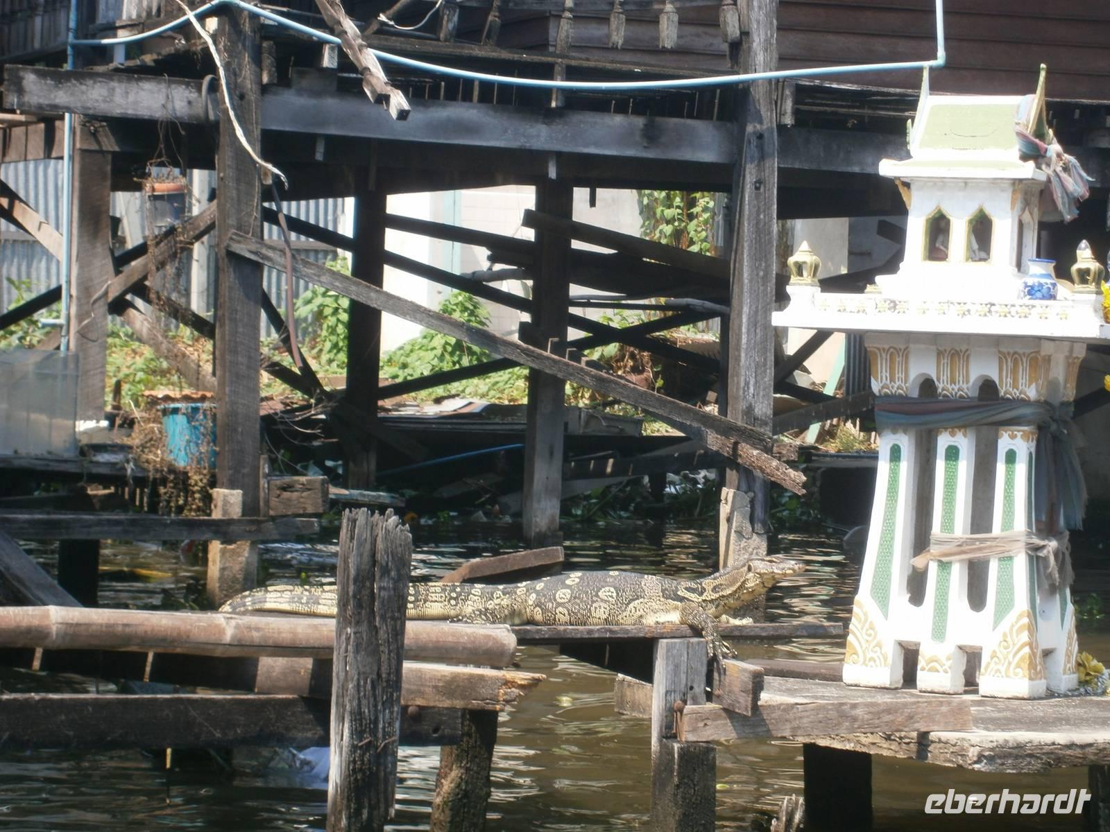 Nach dem Mittagessen stiegen wir hier auf das Boot, welches uns in die Kanäle, die sogenannten Klonghs auf der Thonburi-Seite brachte. So gewannen wir einen Einblick in das Leben der Thais am Ufer des Flusses. Die Häuser sind meist aus Holz und auf Pfählen im Fluss gebaut, oft in einfachen Bretterbuden. Für Europäer sehen Sie wenig wohnlich aus, doch die Menschen scheinen mit dem zufrieden zu sein, was sie haben und winken uns freundlich zu. Wir fuhren durch enge Kanäle voller Wasserhyazinthen, vorbei an Orchideenfarmen und Obstplantagen. Besonders beeindruckt haben uns die Warane, die als Haustiere von den Thais gehalten werden.