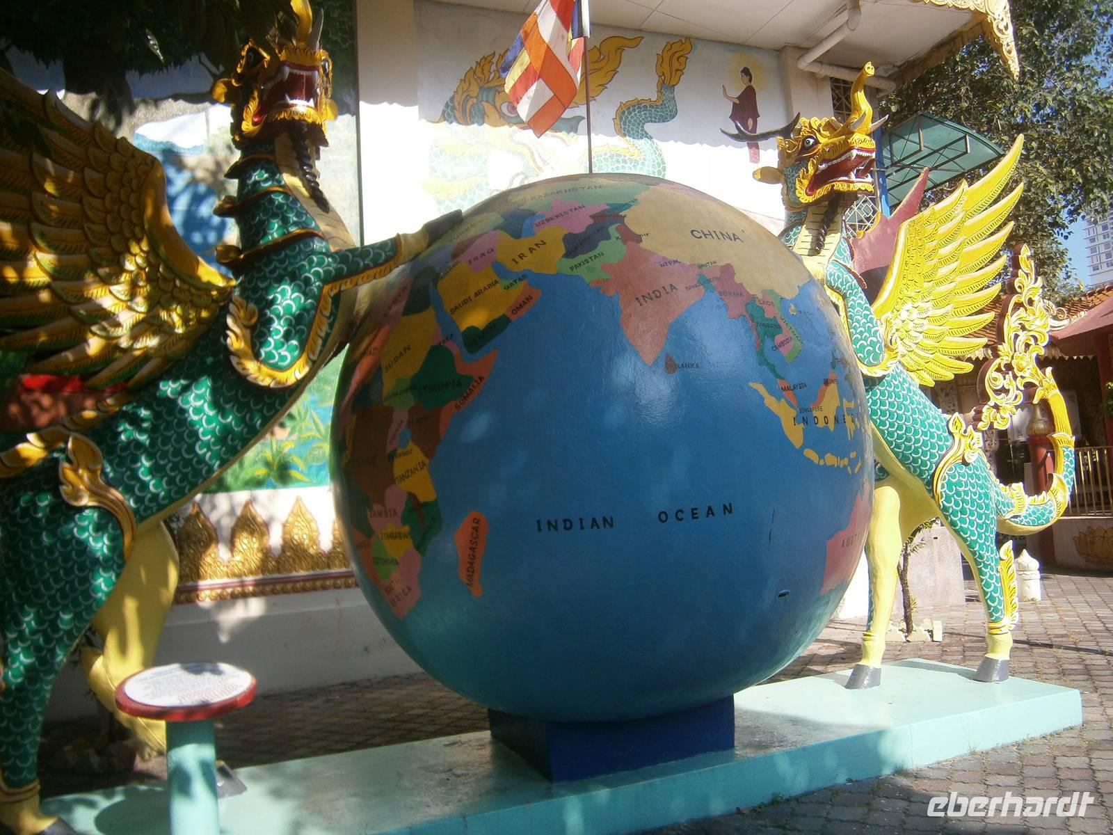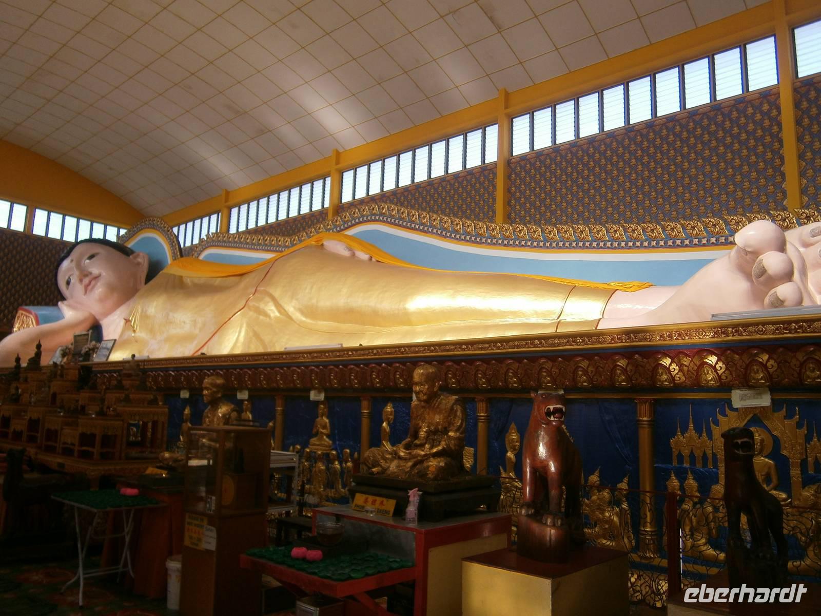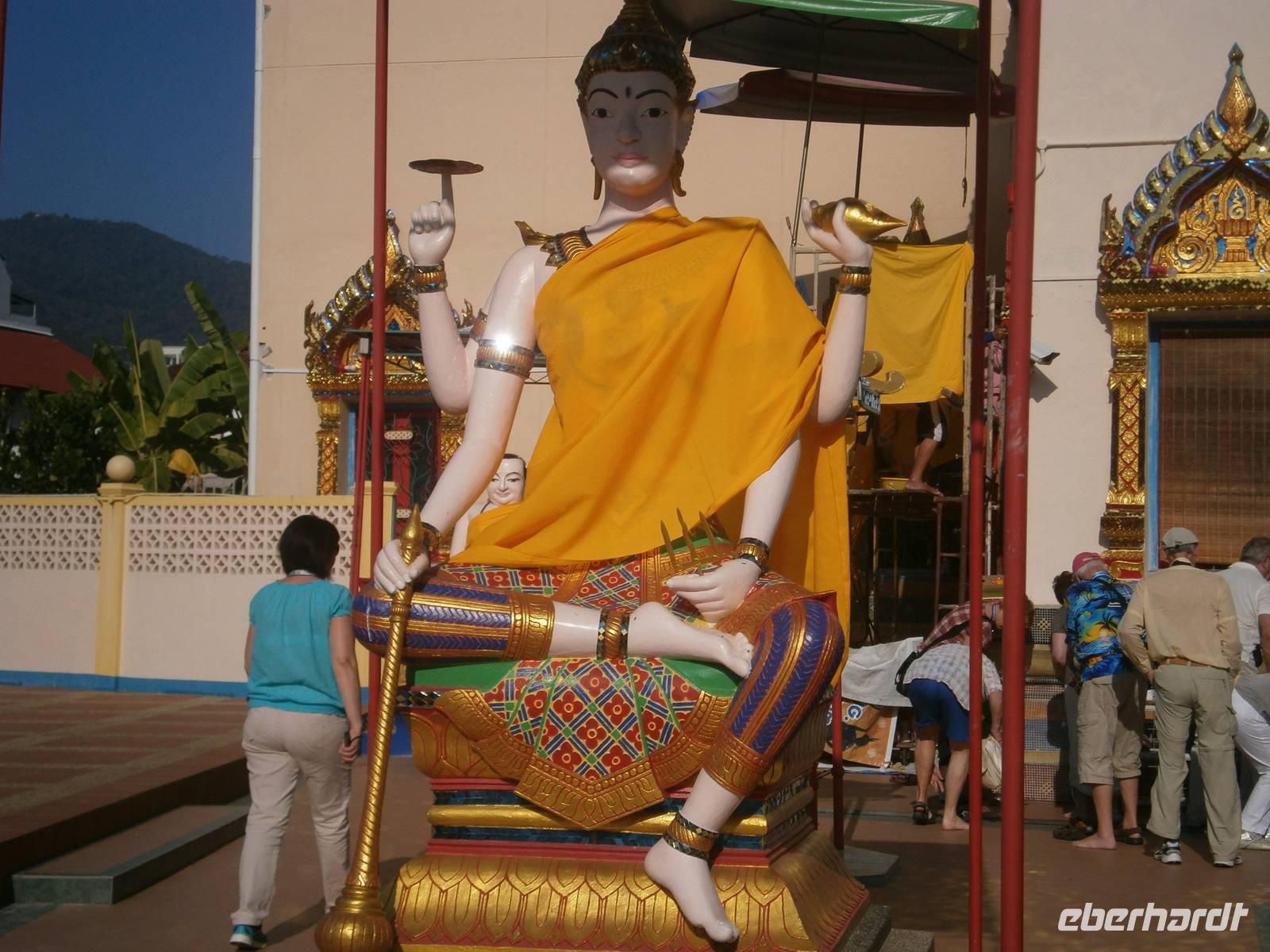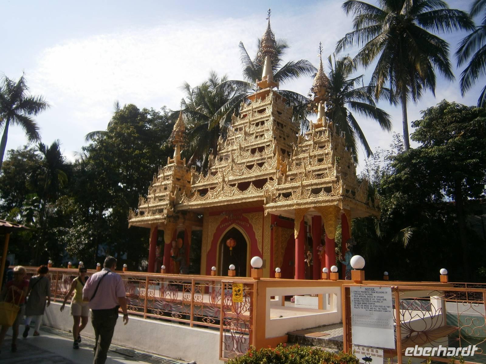 Wir begannen mit einer kurzen Rundfahrt in der Hauptstadt Georgetown und besichtigten den Thai-Tempel Wat Chaiya Mangkalaram mit den gigantischen Tempelwächtern, Naga-Schlangen und Vogelmädchen. Hauptattraktion war natürlich der 35 Meter lange liegende Buddha. Hier sind auch die zwölf Buddhas der chinesischen Tierkreiszeichen sowie zahlreiche Urnen von Verstorbenen untergebracht. Gleich gegenüber befindet sich der burmesische Tempel mit einem riesigen goldenen stehenden Buddha und einer schönen Gartenanlage.