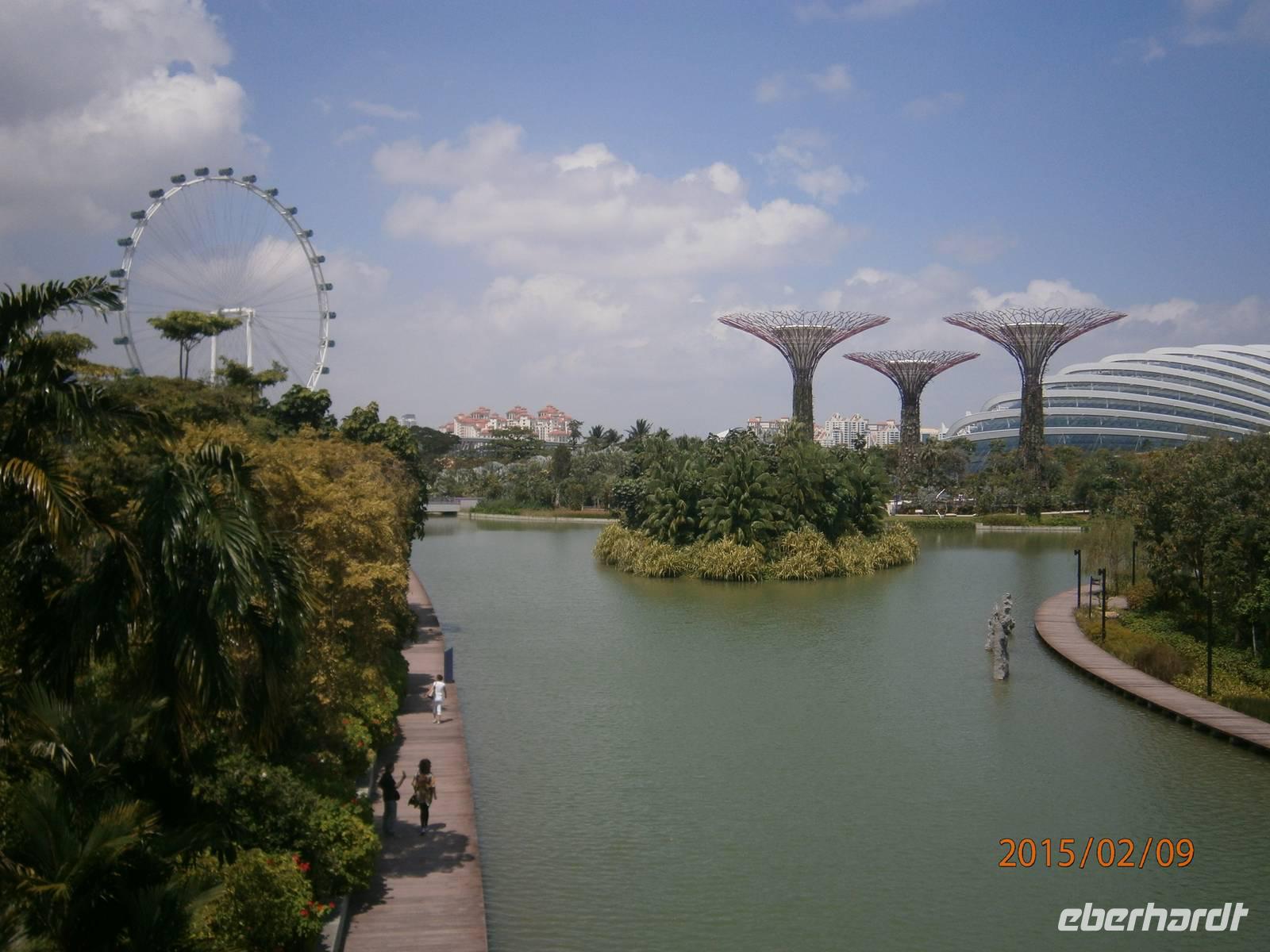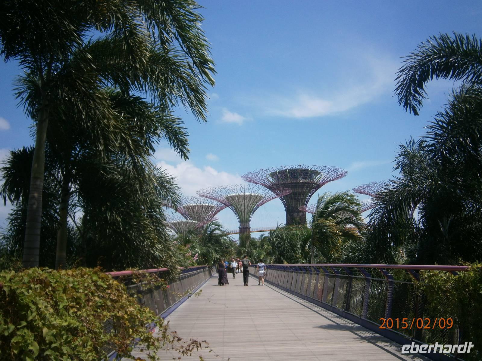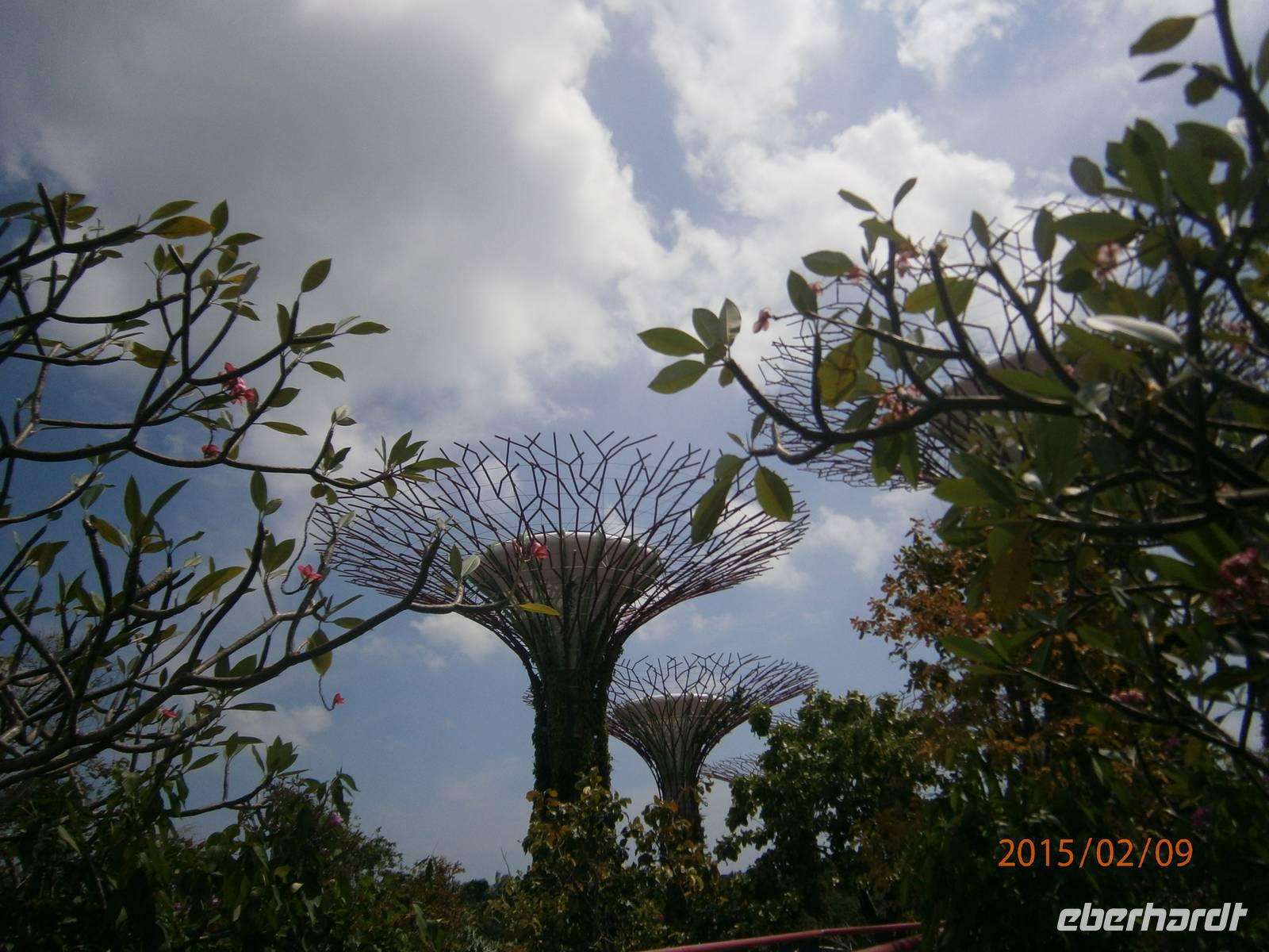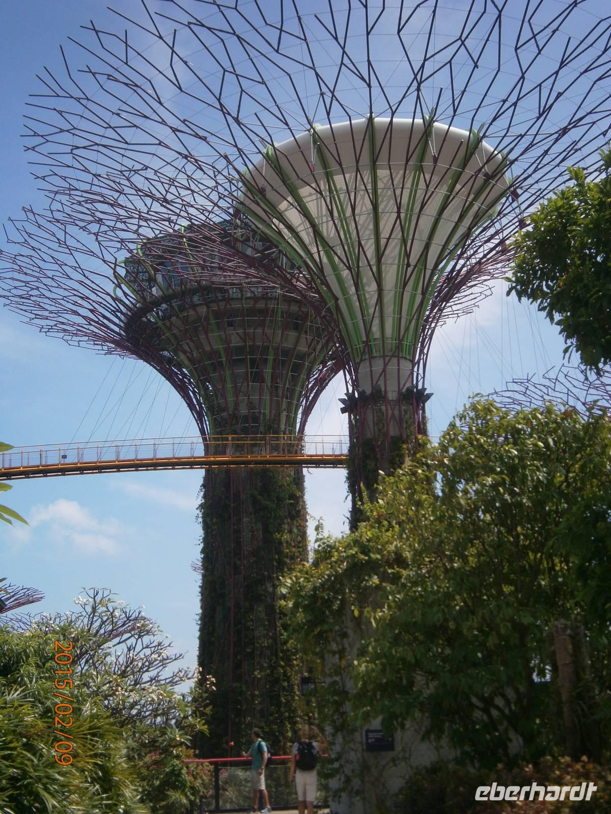 Weiter gings zu den Gardens by the Bay, einer künstlich angelegten Parkanlage mit den phänomenalen Supertrees (Mammutbäume aus riesigen Stahlgerüsten) und zwei mit Glas umhüllte Biotope (Flower Dome und Nebelwald mit dem Wasserfall), in denen jeweils die verschiedensten Gewächsen aus unterschiedlichen Klimazonen gezeigt werden.
