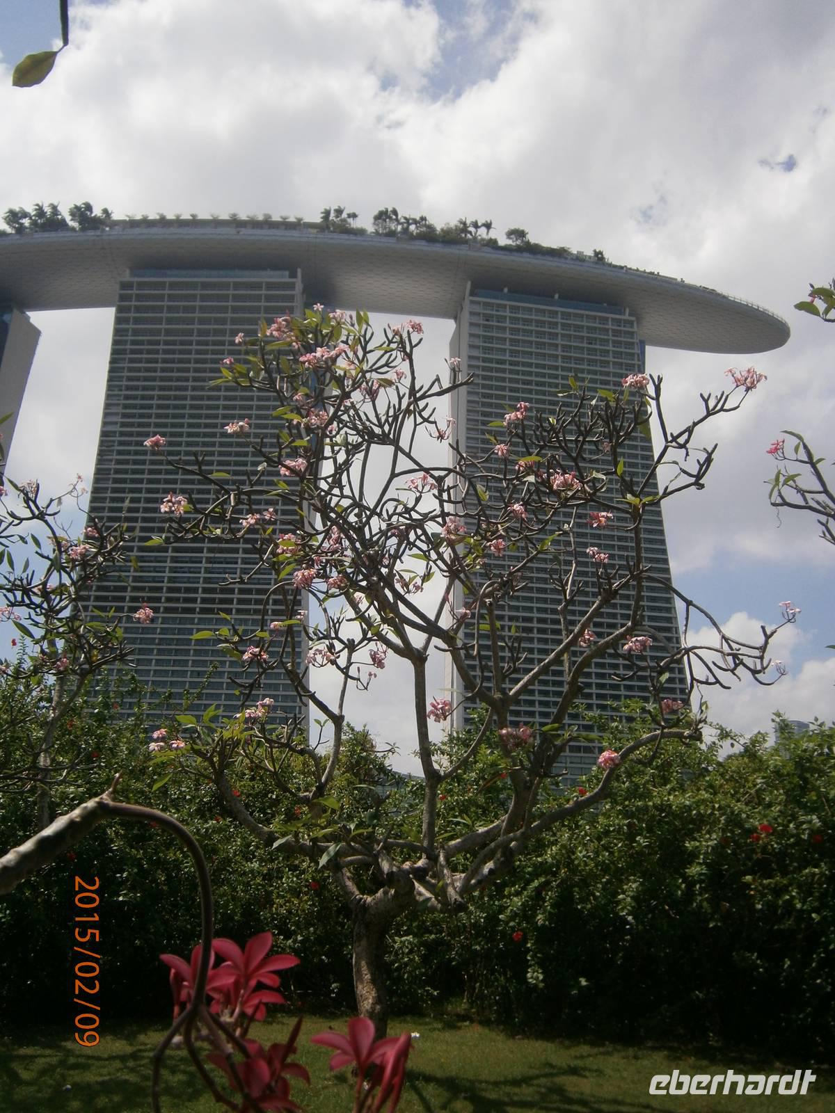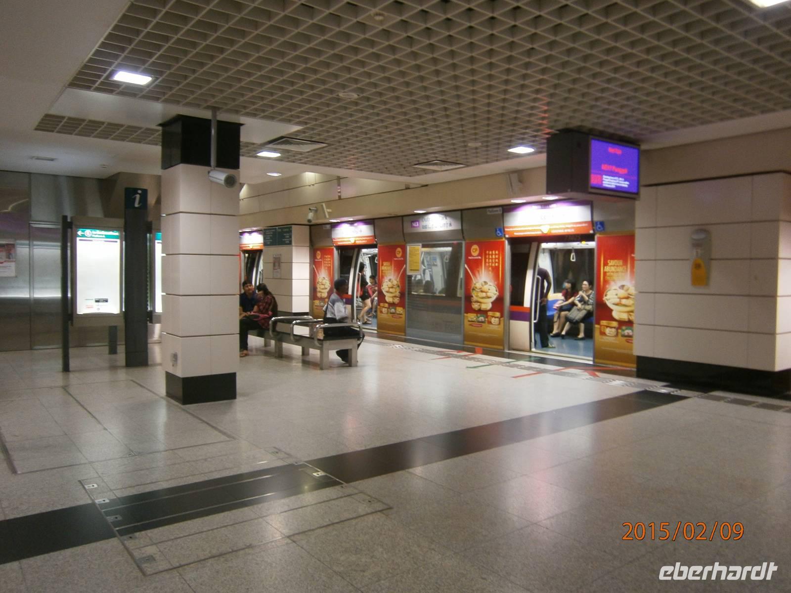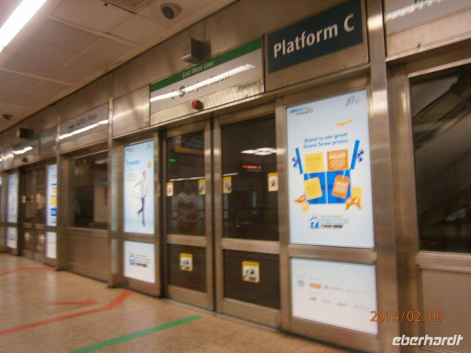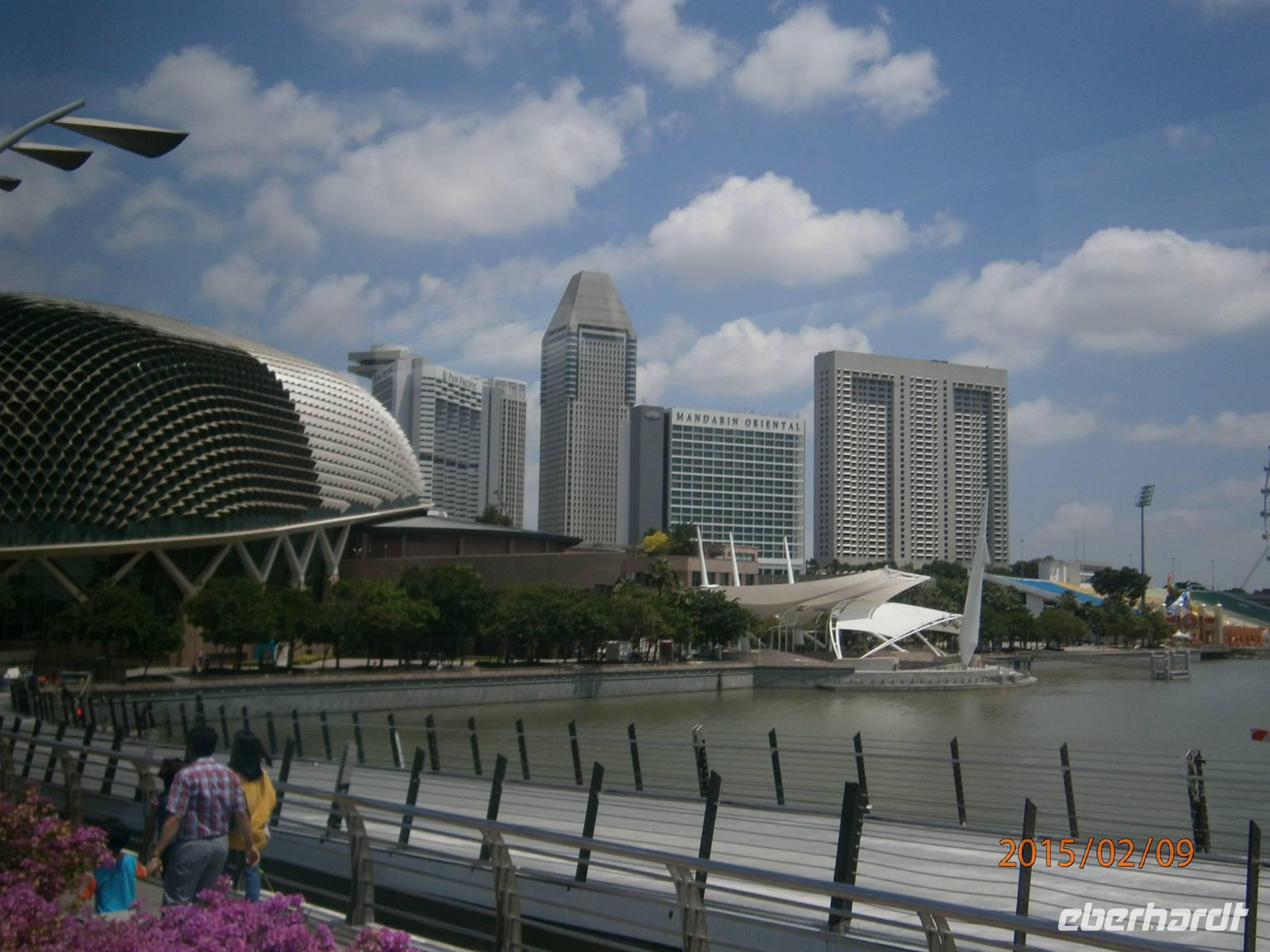 Mit dem Rest der Reisegruppe erkundigten wir Singapur auf eigene Faust. Direkt vom Hafenterminal stiegen wir in die supermoderne U-Bahn. Die unterirdischen Bahnhöfe sind mit Bahnsteigtüren ausgerüstet, die sich nach Zugankunft öffnen, um eine durchgehende Klimatisierung der Stationen zu sichern. Wir fuhren in den sauberen Zügen direkt zum Marina Bay Sands Hotel. Ziel von uns war es, den herrlichen Blick über die Stadt und auf den Sands SkyPark zu genießen.