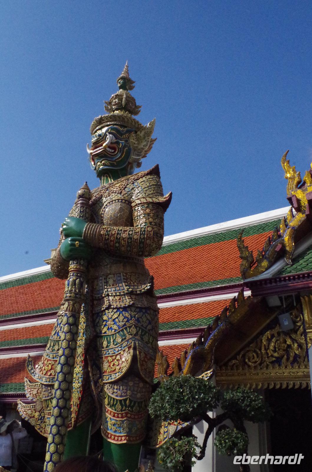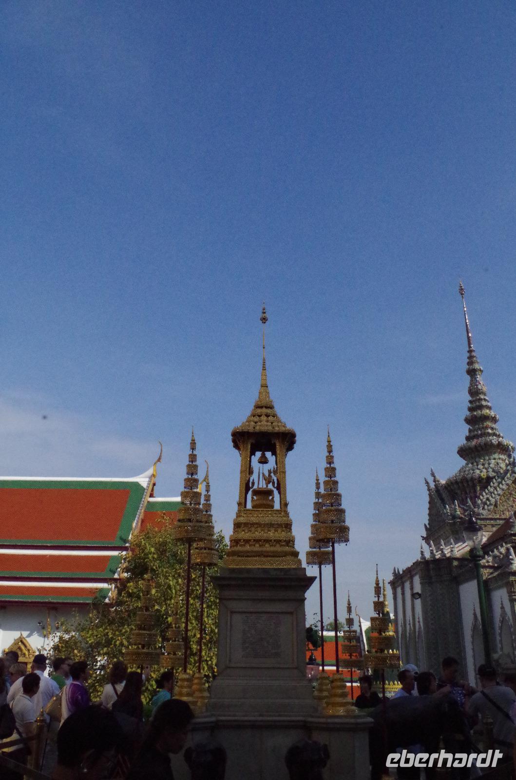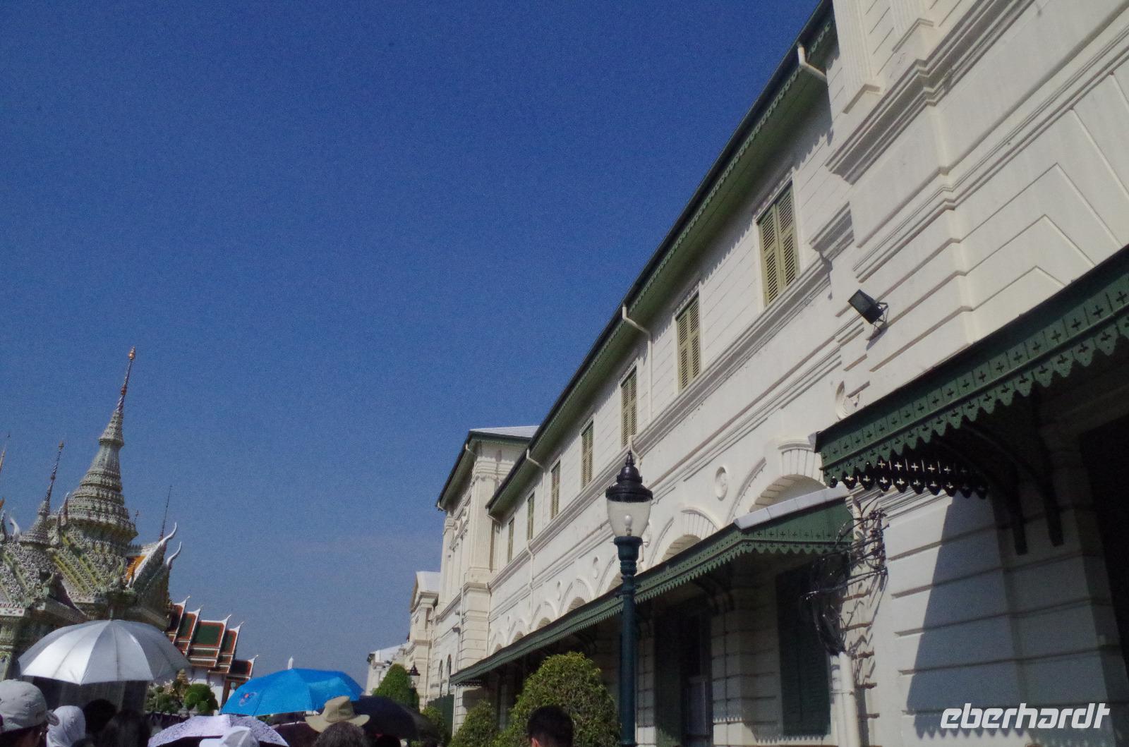 Mit einer kleinen Verspätung von rund 25 Minuten landen wir gegen 14.45 Uhr und mit sechs Stunden Zeitverschiebung zu Deutschland am internationalen Flughafen "Suvarnabhumi International Airport" in Bangkok. Die Passkontrolle und Kofferannahme verlaufen ohne Schwierigkeiten. In der Eingangshalle des Flughafens begrüßt uns freundlich unsere örtliche Reiseleiterin Sini. Es ist rund 30 Grad warm, sonnig und wir werden mit einem "Herzlich willkommen!" empfangen, in thailändischer Sprache sagen die Frauen "Sawadii kah" und "Sawadii khrap" die Männer :-) Sini erzählt uns, dass momentan in Bangkok offiziell 5,7 Millionen Einwohner leben, inoffiziell sind es zwischen 10 bis 12 Millionen Menschen, dies entspricht mehr als zehn Prozent der thailändischen Gesamtbevölkerung. Der internationale Flughafen liegt außerhalb von Bangkok, die Stadt selbst besitzt auch einen Flughafen, von welchem aber nur Inlandsflüge oder Charterflüge erfolgen. In Bangkok kommt es bei neun Millionen Autos und drei Millionen Motorrädern sowie vielen Drei-Rad-Fahrzeugen, die sogenannten Tuk Tuks, und Bussen zu einem enormen Straßenaufkommen. Während der Fahrt informiert uns Siri über unseren morgigen Tagesanlauf. Für den Besuch des Königspalastes benötigen wir unseren Reisepass. Aus Respekt sind das Tragen einer langen Hose oder Rocks sowie eine die Schultern bedeckende Bluse gewünscht. Normalerweise darf der Bus direkt vor dem Palast halten, aber aufgrund der 100 Tage anhaltenden Staatstrauer des verstorbenen Königs Rama IX. Bhumibol Adulyadej (1946-2016) sind einige Straßen gesperrt und so werden wir rund eins bis zwei Kilometer zu Fuß zurücklegen. Natürlich besteht auch die Möglichkeit, mit dem Tuk Tuk zu fahren, diese stehen oftmals an Knotenpunkten und warten bereits auf die Touristen. Der frühere Name von Thailand lautet Siam. Der König von Siam, König Rama I, hatte Bangkok 1782 gegründet. Der Monarch gehört zur Chakri-Dynastie, von welcher Thailand auch heute noch regiert wird. Bis 2016 war König Rama IX. rund 70 Jahre auf dem Thron, welcher sehr beliebt bei den Thailändern war. Nach seinem Tod herrscht momentan Staatstrauer im ganzen Land. In der Stadt sehen wir überall schwarze und weiße Schleifen, welche angebracht wurden, um ihre Trauer zum Ausdruck zu bringen. Die Aufbewahrung erfolgt ein Jahr lang. Die Krönung seines Sohnes Maha Vajiralongkorn Bodindradebayavarangkun, besser bekannt als Rama X., wird erst stattfinden, wenn der verstorbene König verbrannt worden ist. Während der Staatstrauer von 100 Tagen, welche ein Tag vor unserer Ankunft geendet hatte, war der Königspalast geschlossen. Während der Staatstrauer von einem Jahr müssen alle Beamte schwarz tragen. Alle anderen Einwohner ziehen die ersten 30 Tage lang schwarze Kleidung, danach ist dies dann freiwillig. Sie können auch weiße, blaue, dunkelgrüne oder dunkelblaue Kleidung tragen. Jeder König hat seinen eigenen Königspalast. Der neue König wird einen gegenüber des bisherigen Königspalastes bauen lassen. Wenn wir morgen zum Königspalast fahren, werden wir wohl ganz viele Einheimische sehen, welche sich vom König Rama XI. verabschieden. Sini erzählt uns, dass täglich rund 10.000 bis 30.000 Menschen in schwarzer Kleidung, vor allem Menschen vom Land, zum Königspalast strömen, um ihm die letzte Ehre zu erweisen. Den Palast dürfen wir allerdings nicht besuchen, wir werden an ihm vorbeilaufen. Des Weiteren erhalten wir während der Fahrt einen ersten Einblick in die thailändische Sprache. Denn der Name "Bangkok", bestehend aus 7 Buchstaben, ist nur der bekannte Name für die Touristen. Diese Metropole besitzt den wohl längsten Hauptstadtnamen der Welt. Der offizielle thailändische Name lautet "Krung Thep Maha Nakhon", kurz "Krung Thep", welcher mit "Stadt der Engel" übersetzt werden kann. Allerdings umfasst der feierliche Stadtname 169 lateinische Buchstaben und lautet "Krung Thep Maha Nakhon Amon Rattanakosin Mahinthara Yutthaya Mahadilok Phop Noppharat Ratchathani Burirom Udom Ratchaniwet Maha Sathan Amon Phiman Awatan Sathit Sakkathattiya Witsanukam Prasit" :-) Da werden wir wohl weiterhin doch lieber den touristischen Namen "Bangkok" verwenden, wenn wir von unseren Eindrücken zu dieser Millionenmetropole berichten *grins* Zudem erfahren wir, dass die Thai bunte Farben lieben. Auffallend ist dies vor allem bei den vielen verschiedenfarbigen Taxis, welche wie Bonbons ausschauen. Jede Firma hat eine andere Farbe, der Fahrpreis ist gleich und die Grundgebühr liegt bei 25 bis 30 thailändische Bath. Die Fahrt im Taxi ist laut Sini günstiger als im Tuk Tuk, aber hier ist Handeln angesagt :-) In diesem Land leben über 66 Millionen Einwohner. Rund 94 Prozent sind buddhistischen Glaubens und circa 5,4 Prozent Muslime. Es gibt sehr viele Tempelanlagen in Thailand, allein in Bangkok finden sich über 300 Tempel. Weiter erzählt uns Sini, dass die Thais sehr gern essen, trinken, einkaufen und Spaß haben. Die Geschäfte in Thailand gehören vorrangig den Chinesen und Indern, die Großindustrie wird von den Japanern, Koreanern, Deutschen und Amerikanern betrieben. Die Thais besitzen eher kleine Kiosks, Minimärkte oder Restaurants. In Thailand arbeiten die Menschen zu 70 Prozent in der Landwirtschaft, die restlichen 30 Prozent sind Beamte. Es werden wenig Steuern gezahlt, im Durchschnitt sind dies fünf Prozent. Erst wenn der Thailänder im Jahr über 3.500 Euro verdient, dann sind Steuern zu zahlen. Alle Menschen, welche weniger erhalten, brauchen keine Steuern zu leisten, bekommen aber auch keine staatliche Unterstützung, wenn sie arbeitslos werden. Zudem ist die Schule für die Kinder zu bezahlen, für Kinder von Beamten ist dies kostenfrei. Der große Unterschied zwischen Beamten und Landwirtschaftlern ist besonders auch darin zu sehen, dass Beamte ein Diensthaus auf dem Land oder eine Dienstwohnung in der Stadt erhalten. Im weitesten Sinne sind er/sie selbst sowie der Ehepartner, die Kinder bis sie