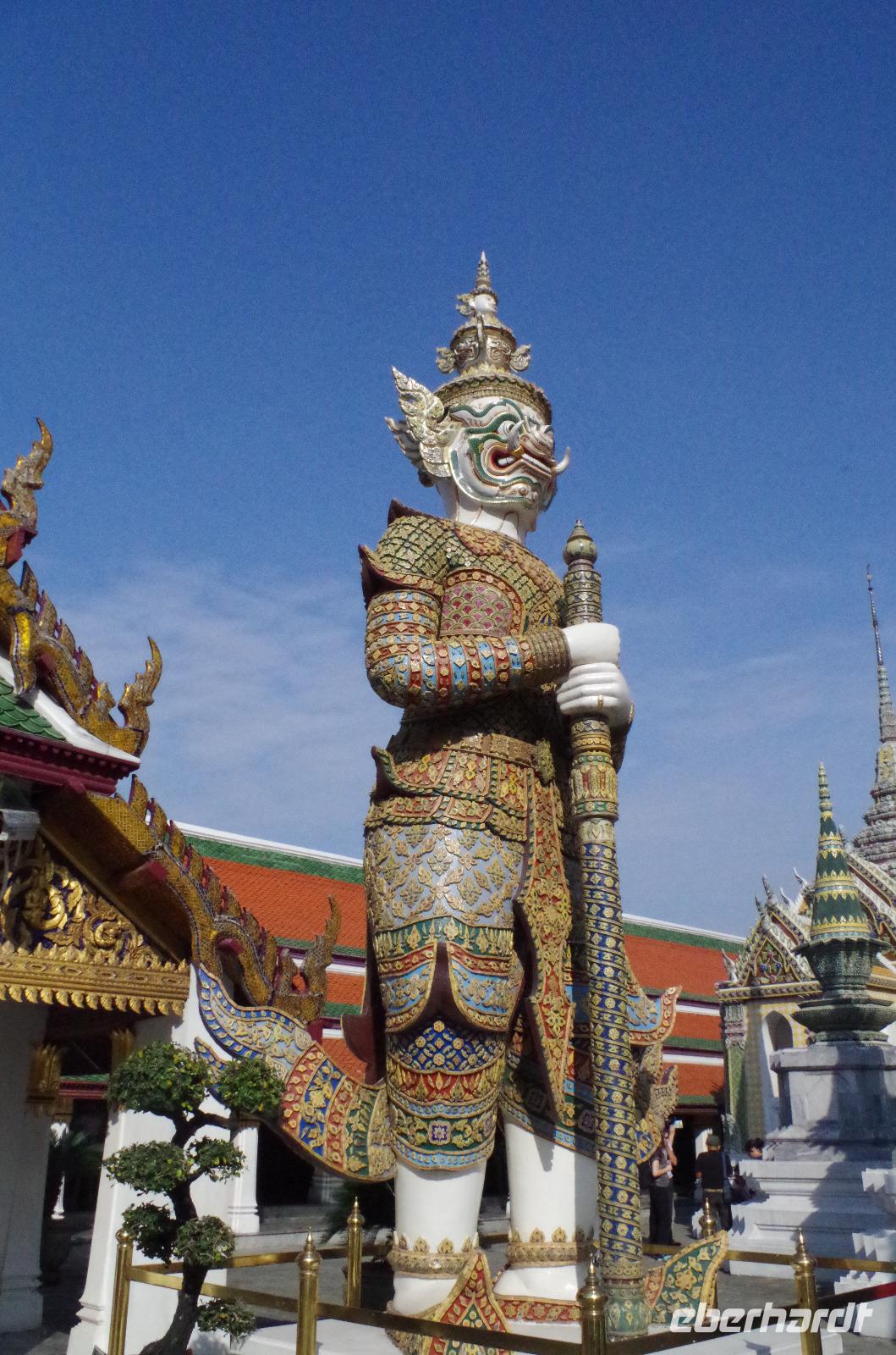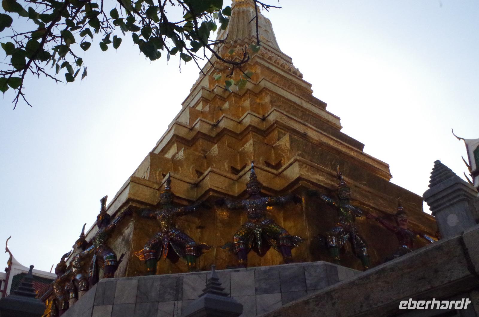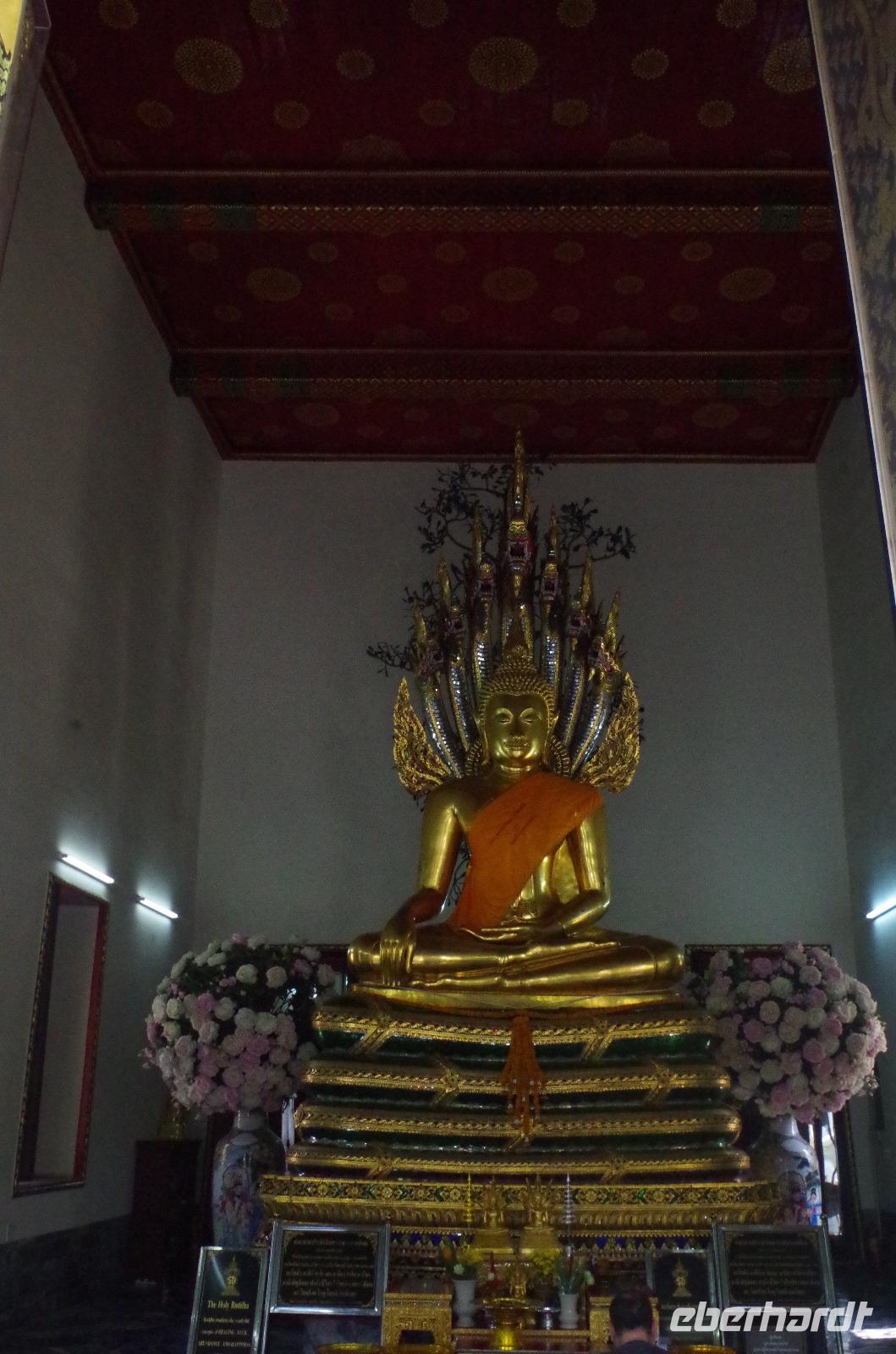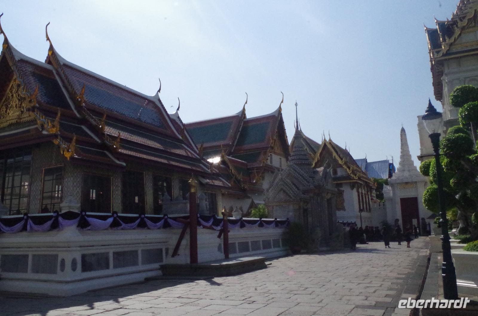 Mit einer kleinen Verspätung von rund 25 Minuten landen wir gegen 14.45 Uhr und mit sechs Stunden Zeitverschiebung zu Deutschland am internationalen Flughafen "Suvarnabhumi International Airport" in Bangkok. Die Passkontrolle und Kofferannahme verlaufen ohne Schwierigkeiten. In der Eingangshalle des Flughafens begrüßt uns freundlich unsere örtliche Reiseleiterin Sini. Es ist rund 30 Grad warm, sonnig und wir werden mit einem "Herzlich willkommen!" empfangen, in thailändischer Sprache sagen die Frauen "Sawadii kah" und "Sawadii khrap" die Männer :-) Sini erzählt uns, dass momentan in Bangkok offiziell 5,7 Millionen Einwohner leben, inoffiziell sind es zwischen 10 bis 12 Millionen Menschen, dies entspricht mehr als zehn Prozent der thailändischen Gesamtbevölkerung. Der internationale Flughafen liegt außerhalb von Bangkok, die Stadt selbst besitzt auch einen Flughafen, von welchem aber nur Inlandsflüge oder Charterflüge erfolgen. In Bangkok kommt es bei neun Millionen Autos und drei Millionen Motorrädern sowie vielen Drei-Rad-Fahrzeugen, die sogenannten Tuk Tuks, und Bussen zu einem enormen Straßenaufkommen. Während der Fahrt informiert uns Siri über unseren morgigen Tagesanlauf. Für den Besuch des Königspalastes benötigen wir unseren Reisepass. Aus Respekt sind das Tragen einer langen Hose oder Rocks sowie eine die Schultern bedeckende Bluse gewünscht. Normalerweise darf der Bus direkt vor dem Palast halten, aber aufgrund der 100 Tage anhaltenden Staatstrauer des verstorbenen Königs Rama IX. Bhumibol Adulyadej (1946-2016) sind einige Straßen gesperrt und so werden wir rund eins bis zwei Kilometer zu Fuß zurücklegen. Natürlich besteht auch die Möglichkeit, mit dem Tuk Tuk zu fahren, diese stehen oftmals an Knotenpunkten und warten bereits auf die Touristen. Der frühere Name von Thailand lautet Siam. Der König von Siam, König Rama I, hatte Bangkok 1782 gegründet. Der Monarch gehört zur Chakri-Dynastie, von welcher Thailand auch heute noch regiert wird. Bis 2016 war König Rama IX. rund 70 Jahre auf dem Thron, welcher sehr beliebt bei den Thailändern war. Nach seinem Tod herrscht momentan Staatstrauer im ganzen Land. In der Stadt sehen wir überall schwarze und weiße Schleifen, welche angebracht wurden, um ihre Trauer zum Ausdruck zu bringen. Die Aufbewahrung erfolgt ein Jahr lang. Die Krönung seines Sohnes Maha Vajiralongkorn Bodindradebayavarangkun, besser bekannt als Rama X., wird erst stattfinden, wenn der verstorbene König verbrannt worden ist. Während der Staatstrauer von 100 Tagen, welche ein Tag vor unserer Ankunft geendet hatte, war der Königspalast geschlossen. Während der Staatstrauer von einem Jahr müssen alle Beamte schwarz tragen. Alle anderen Einwohner ziehen die ersten 30 Tage lang schwarze Kleidung, danach ist dies dann freiwillig. Sie können auch weiße, blaue, dunkelgrüne oder dunkelblaue Kleidung tragen. Jeder König hat seinen eigenen Königspalast. Der neue König wird einen gegenüber des bisherigen Königspalastes bauen lassen. Wenn wir morgen zum Königspalast fahren, werden wir wohl ganz viele Einheimische sehen, welche sich vom König Rama XI. verabschieden. Sini erzählt uns, dass täglich rund 10.000 bis 30.000 Menschen in schwarzer Kleidung, vor allem Menschen vom Land, zum Königspalast strömen, um ihm die letzte Ehre zu erweisen. Den Palast dürfen wir allerdings nicht besuchen, wir werden an ihm vorbeilaufen. Des Weiteren erhalten wir während der Fahrt einen ersten Einblick in die thailändische Sprache. Denn der Name "Bangkok", bestehend aus 7 Buchstaben, ist nur der bekannte Name für die Touristen. Diese Metropole besitzt den wohl längsten Hauptstadtnamen der Welt. Der offizielle thailändische Name lautet "Krung Thep Maha Nakhon", kurz "Krung Thep", welcher mit "Stadt der Engel" übersetzt werden kann. Allerdings umfasst der feierliche Stadtname 169 lateinische Buchstaben und lautet "Krung Thep Maha Nakhon Amon Rattanakosin Mahinthara Yutthaya Mahadilok Phop Noppharat Ratchathani Burirom Udom Ratchaniwet Maha Sathan Amon Phiman Awatan Sathit Sakkathattiya Witsanukam Prasit" :-) Da werden wir wohl weiterhin doch lieber den touristischen Namen "Bangkok" verwenden, wenn wir von unseren Eindrücken zu dieser Millionenmetropole berichten *grins* Zudem erfahren wir, dass die Thai bunte Farben lieben. Auffallend ist dies vor allem bei den vielen verschiedenfarbigen Taxis, welche wie Bonbons ausschauen. Jede Firma hat eine andere Farbe, der Fahrpreis ist gleich und die Grundgebühr liegt bei 25 bis 30 thailändische Bath. Die Fahrt im Taxi ist laut Sini günstiger als im Tuk Tuk, aber hier ist Handeln angesagt :-) In diesem Land leben über 66 Millionen Einwohner. Rund 94 Prozent sind buddhistischen Glaubens und circa 5,4 Prozent Muslime. Es gibt sehr viele Tempelanlagen in Thailand, allein in Bangkok finden sich über 300 Tempel. Weiter erzählt uns Sini, dass die Thais sehr gern essen, trinken, einkaufen und Spaß haben. Die Geschäfte in Thailand gehören vorrangig den Chinesen und Indern, die Großindustrie wird von den Japanern, Koreanern, Deutschen und Amerikanern betrieben. Die Thais besitzen eher kleine Kiosks, Minimärkte oder Restaurants. In Thailand arbeiten die Menschen zu 70 Prozent in der Landwirtschaft, die restlichen 30 Prozent sind Beamte. Es werden wenig Steuern gezahlt, im Durchschnitt sind dies fünf Prozent. Erst wenn der Thailänder im Jahr über 3.500 Euro verdient, dann sind Steuern zu zahlen. Alle Menschen, welche weniger erhalten, brauchen keine Steuern zu leisten, bekommen aber auch keine staatliche Unterstützung, wenn sie arbeitslos werden. Zudem ist die Schule für die Kinder zu bezahlen, für Kinder von Beamten ist dies kostenfrei. Der große Unterschied zwischen Beamten und Landwirtschaftlern ist besonders auch darin zu sehen, dass Beamte ein Diensthaus auf dem Land oder eine Dienstwohnung in der Stadt erhalten. Im weitesten Sinne sind er/sie selbst sowie der Ehepartner, die Kinder bis sie