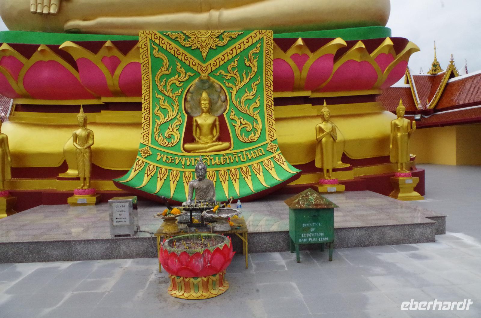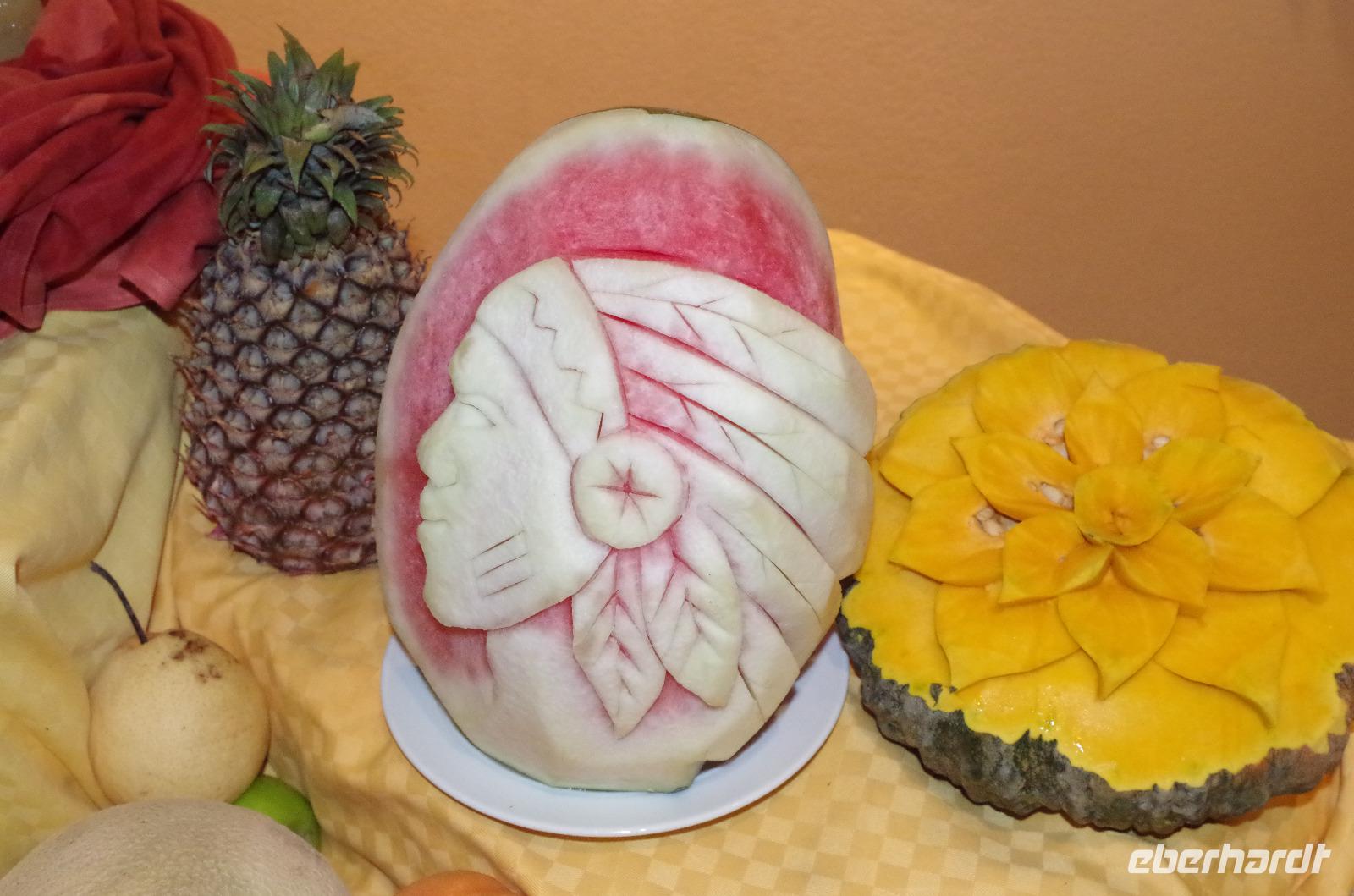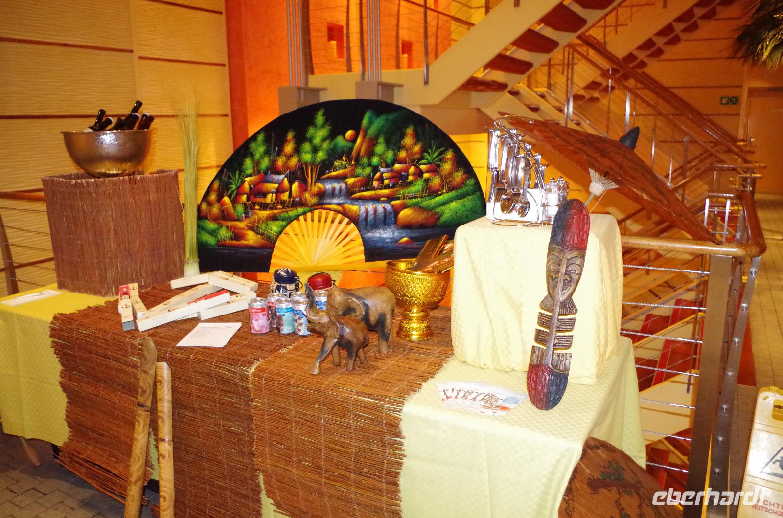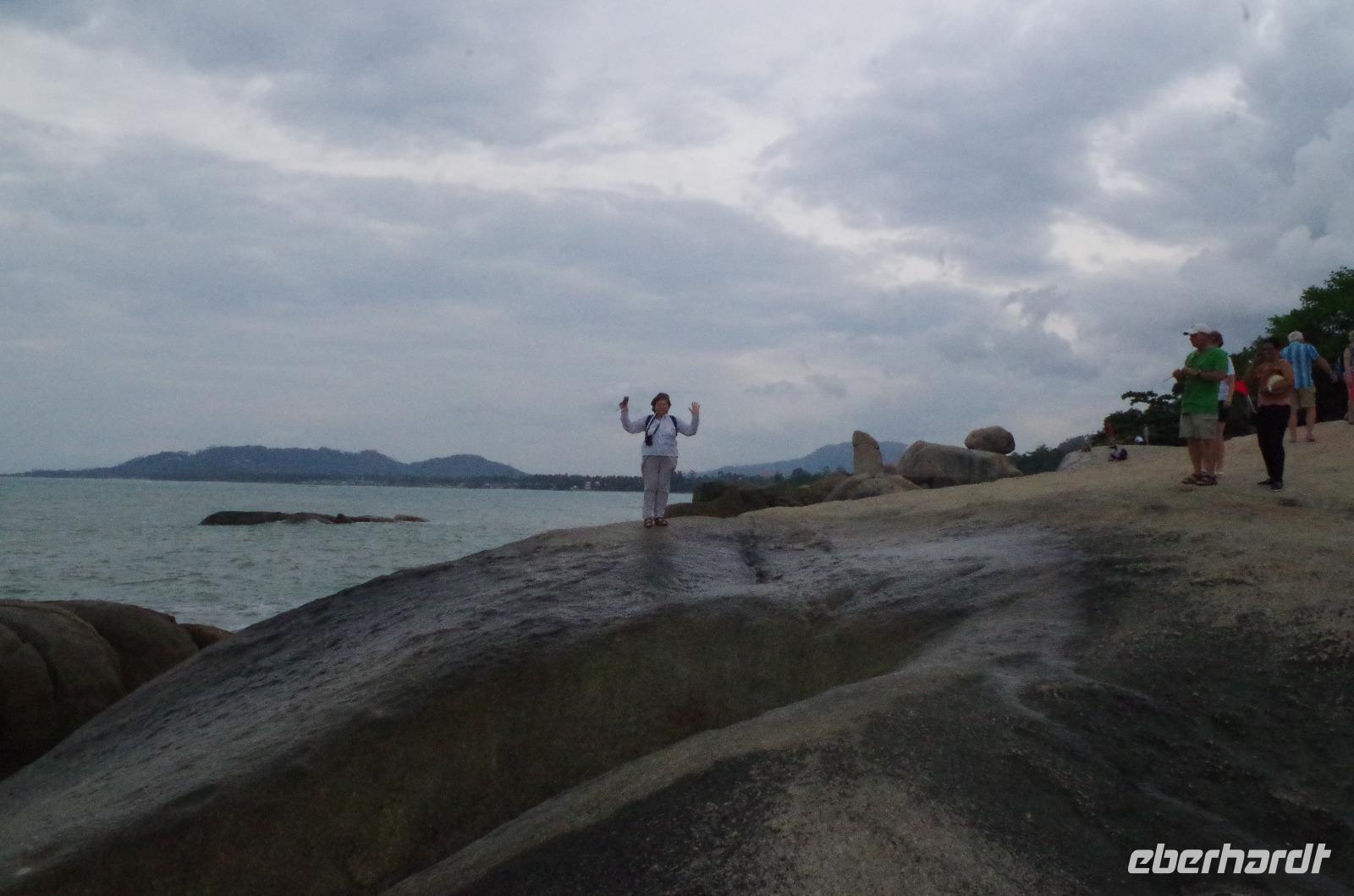 Ein weiterer sonniger Tag beginnt :-) Heute unternehmen die meisten Gäste ihren ersten an Bord gebuchten meist englischsprachigen Ausflug. Zum Frühstücken treffen sich einige Gäste im "Marktrestaurant" auf Deck 9. Es leicht bewölkt, aber bei fast 30 Grad Außentemperatur sehr warm, also gute Wetteraussichten für den heutigen Tag :-) Rund 46.000 Einwohner leben auf der kleinen "Kokosinsel" Koh Samui. Eine Ringstraße von circa 50 Kilometern führt rundum der drittgrößten thailändischen Insel. Wichtige Sehenswürdigkeiten sind die Tempelanlage "Wat Phra Yai" mit dem zwölf Meter großen goldenen Buddha, der "Wat Khunaram", der Angthong-Marineschutzpark oder die Wasserfälle Na Muang und Hin Lat. Alle Gäste haben sich verschiedene Ausflüge ausgesucht. Zu empfehlen sind SAM01A "Einmal um die Insel", SAM02 "Per Allrad Koh Samui entdecken" und SAM10 "Mit dem Katamaran "Dreamcatcher" nach Koh Phangan". Beim Ausflug SAM03 "Paradiesischer Angthong-Marineschutzpark" beinhaltet aus Erfahrung unserer Gästen eine wirklich stürmische Schnellbootfahrt, so dass dieser Ausflug bei Rückenproblemen eher weniger zu empfehlen ist. Die Reisebegleitung bietet individuell an, gemeinsam um 11.00 Uhr an Land zu gehen und die Insel zu erkunden. Wer gern einen Landgang vornehmen möchte, benötigt lediglich die Mitnahme seiner Bordkarte. Wir werden heute Tendern, das heißt, dass das Schiff nicht direkt im Hafen anlegen kann, sondern "auf Reede" liegt und wir mit den Rettungsbooten oder Inselbooten zum Hafen gefahren werden. Die See ist auch sehr ruhig, so dass das Tendern erlaubt ist und die Fahrt wesentlich angenehmer ist als beispielsweise unsere gestrige Schnellbootfahrt :-) Rund 20 Minuten später sind wir bereits im Hafen und eine Menge Taxis für eine Stadtrundfahrt stehen bereit, wir werden förmlich belagert, einzusteigen. Nach ein wenig "handeln" haben wir einen Fahrer gefunden und schon geht es los. Um 12.15 Uhr besuchen wir zuerst "Wat Phra Yai", den Tempel des großen Buddha "Big Buddha Temple", mit einem zwölf Meter hohen Goldbuddha. Anschließend fahren wir weiter für einen Fotostopp zum Tempel "Wat Plai Leam". Für die Tempelanlagen empfiehlt es sich wieder die Tempelsocken mitzunehmen ;-) An der Ostküste entlang fahren wir zur interessanten Steinfelsformation Großvater- und Großmutterfelsen "Hin Ta und Hin Yai". Ihre Form wird vielmals als Fruchtbarkeitssymbol gesehen. Dann erkunden wir das Landesinnere und haben einen letzten Fotostopp beim Na Muang Wasserfall. Es gibt einen oberen nur zu Fuß erreichbaren und einen unteren Wasserfall. Wir schauen uns den unteren rund 30 Meter hohe und circa 18 Meter breiten Wasserfall an, welcher in ein großes Felsbecken fließt. Hier besteht auch die Möglichkeit, auf Elefanten zu reiten. Wir probieren aber lieber eine leckere Kokosnuss. Dann fahren wir wieder zum Hafen zurück, treffen bei den Tendern auf weitere Gäste aus unserer Gruppe und gemeinsam kehren wir gegen 15.45 Uhr auf unser "schwimmendes Zuhause" für die kommenden Tage zurück. Unsere nächste Station ist Singapur, wofür wir eine Ein- und Ausreisekarte ausfüllen müssen. Die ausgefüllten Dokumente sind um 17.00 Uhr bei der Crew in der AIDA Bar abzugeben. Um 18.30 Uhr trifft sich der Großteil der Gruppe zum gemeinsamen Abendessen im "Weite Welt Restaurant" auf Deck 10 an unseren runden Tischen. Das Essen und der Wein sind abermals vorzüglich. Wir schauen uns heute gemeinsam "Martins Prime Time" im Theatrium Deck 9 bis 11 zusammen mit der Vorstellung von Kapitän Henning Ueberall und dem General Manager Kai Botschek an. Anschließend findet die Show mit den AIDA-Stars statt, wobei sich auch die fünf Hauptsänger vorstellen. Dazu gehören zwei Sängerinnen aus Schweden, eine Sängerin aus Berlin und zwei Sänger aus Großbritannien. Wer möchte, hört sich um 22.00 Uhr noch eine wirklich lustige Vorlesung der Schauspieler Daniela und Axel zu "Loriot" ebenfalls im Theatrium auf Deck 9 an. Ein schöner sonniger Tag neigt sich dem Ende, morgen werden wir uns einen wundervollen Tag auf See gönnen. Da wir nachts die Zeitzone wechseln, heißt es von Mittwoch zu Donnerstag die Uhren von 02.00 Uhr auf 03.00 Uhr umzustellen.