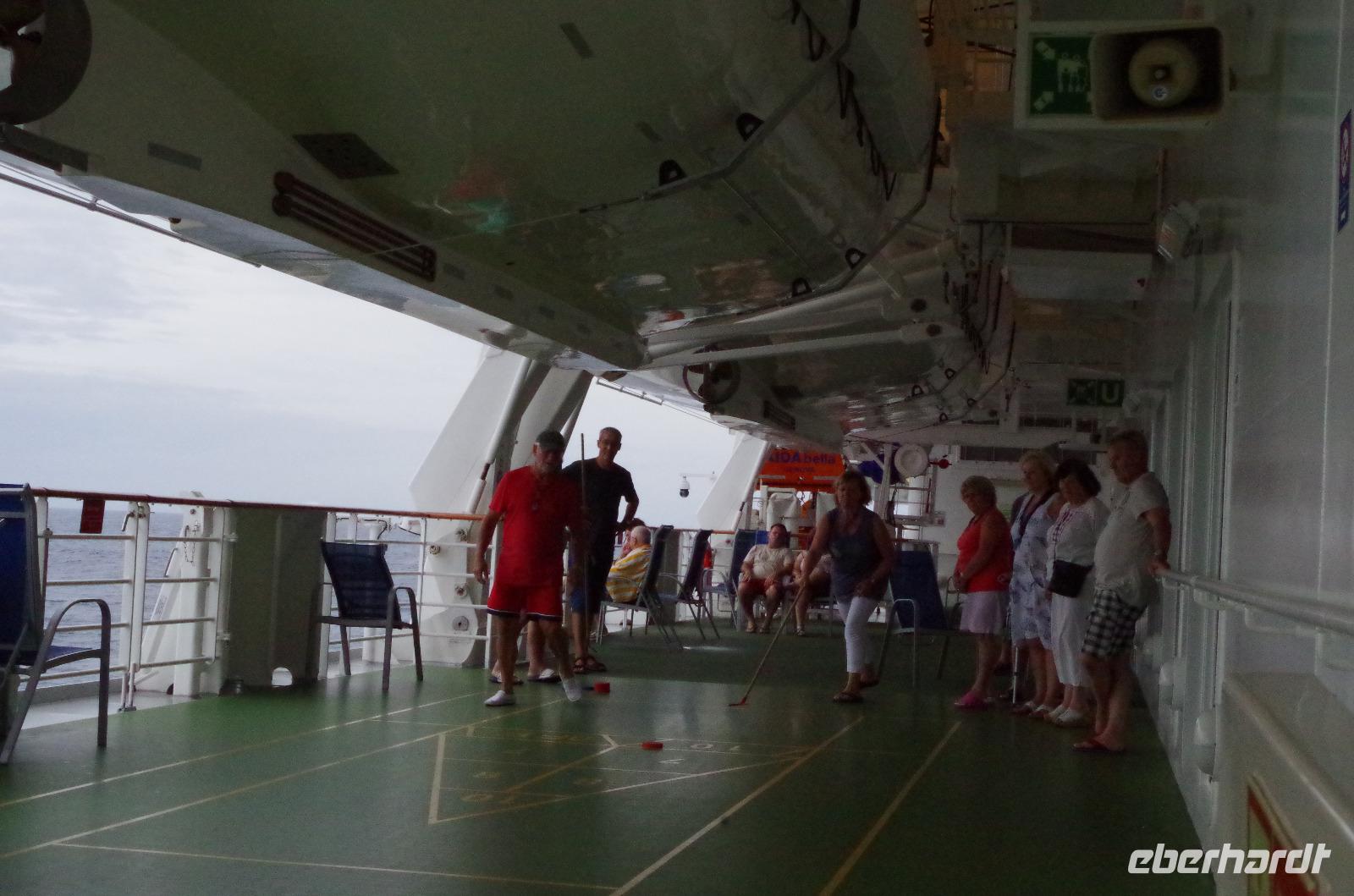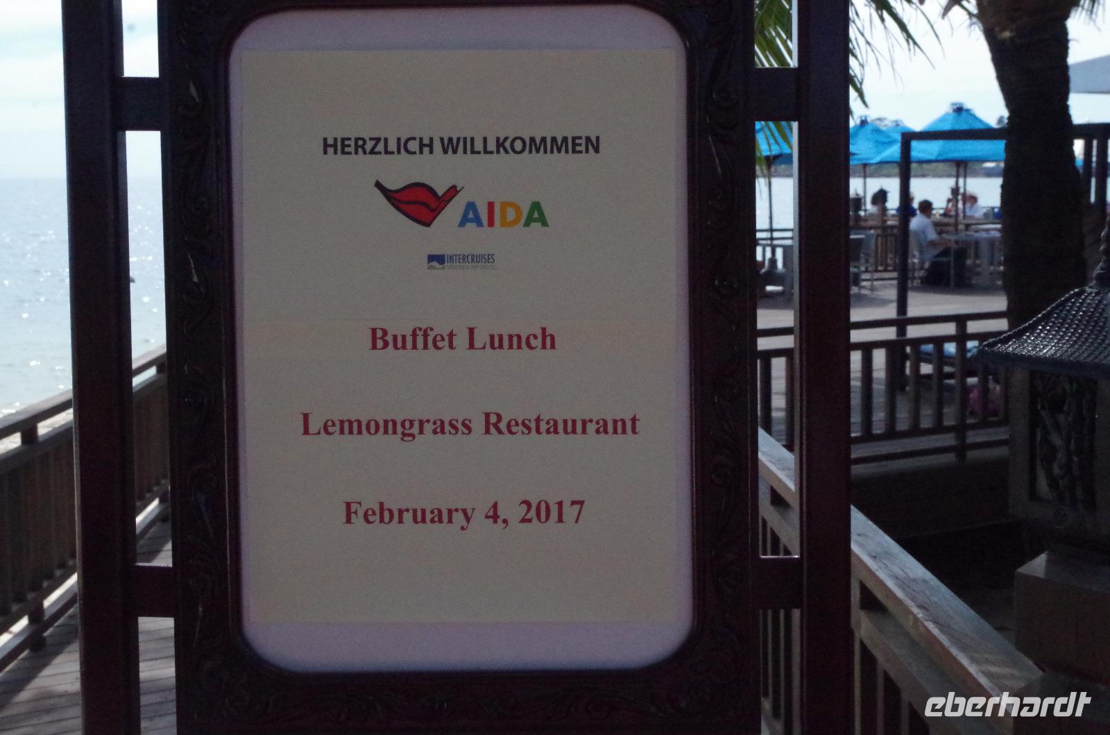 Die Sonne lacht und es sind sommerlich 35 Grad Celsius, wir genießen die angenehme Wärme in vollen Zügen! Tägliche Gebete zum Wettergott verhelfen uns (fast) auf der gesamten Reise zu den besten Wetterbedingungen, wir sind also doch eine "sonnige" Reisegruppe. Frühstück im "Markt Restaurant" ist ab 07.30 Uhr möglich. Heute erhalten wir unseren Reisepass mit der Ausreisekarte für Bangkok im Theatrium auf Deck 9 zurück. Während gestern bereits die Ausreiseinformation für alle AIDA-Gäste erfolgt ist, trifft sich die Eberhardt-Gruppe um 11.00 Uhr in der AIDA Bar, um gemeinsam den Ablauf unserer Abreise zu besprechen oder auch um letzte Fragen zu klären. Alle Gäste mit einer Abreise nach 09:00 Uhr, welche das Gepäck (versehen mit der AIDA-Gepäckbanderole) in der Nacht bis 02.00 Uhr vor die Kabine stellen, finden die Koffer ab 08:30 Uhr, nach Decks sortiert, im Hafenterminal wieder. Jeder Gast muss sein Gepäck im Hafenterminal selbst abholen! Die Kabinen sind bis spätestens 09:00 Uhr zu verlassen, die Bordkarte verliert dann ihre Gültigkeit als Kabinenschlüssel, als Zugang zum Schiff behält sie aber weiterhin ihre Funktion. Eine unbeaufsichtigte Aufbewahrung des Handgepäcks ist im Konferenzraum auf Deck 6 möglich. Direkt im Anschluss unserer gemeinsamen Treffens findet die letzte Runde Shuffleboard der Eberhardt TRAVEL-Gruppe mit vierzehn Reisegästen außen auf Deck 5 in der Nähe der Rezeption statt. Wir spielen dieses Mal drei Runden, wobei die Männer zwei Runden für sich entscheiden können. Nun fragt sich aber, wer hat Shuffleboard am Ende gewonnen, die Männer oder doch die Frauen? Wir haben an drei Tagen gespielt, dabei haben die Frauen mehr Spiele als die Männer gewonnen. Aber vielleicht haben die Männer die Frauen heute in der Gesamtpunktzahl noch überholen können?! Zur Siegerehrung um 18.00 Uhr in der AIDA Bar werden wir es spätestens erfahren :-) Pünktlich um 13.00 sind wir zurück im Hafen "Laem Chabang Commercial Port", insgesamt haben wir rund 3.005 Seemeilen bzw. 5.565 Kilometer zurückgelegt. Nach unserem tollen Spiel gehen die Reisegäste gegen 13.30 Uhr gemeinsam zum Mittagessen im "Weite Welt Restaurant" auf Deck 10. Den Nachmittag gestalten die Gäste wieder individuell mit Erholung und Entspannung in der Sauna, der Wellness-Oase, auf dem Pooldeck oder im FKK-Bereich. Um 15.00 Uhr sehen sich einige Reisegäste zum Kaffee trinken im "Weite Welt Restaurant" wieder. Natürlich wird es auch eine Auswertung und Siegerehrung unserer gemeinsamen Shuffleboard-Spiele geben. Sie findet um 18.00 Uhr in der AIDA Bar statt. Wir machen es kurz und knapp: Die Frauen haben besser gespielt, mehr Punkte erreicht und auch in der gewonnenen Rundenanzahl dominiert. Die Männer sind aber sehr gute Verlierer und gönnen selbstverständlich den Frauen ihren Sieg :-) Der Gewinner-Sekt und die Trost-Schokolade wird selbstredend geteilt. Pünktlich um 18.30 Uhr treffen wir uns zu unserem letzten gemeinsamen Abendessen im "Weite Welt Restaurant" auf Deck 10. Wir können es immer noch nicht glauben, dass sich unsere traumhafte Reise langsam dem Ende neigt :-( In der Zeit vor und nach dem Essen packen wir unsere Sachen zusammen. Es ist wirklich angenehm, 14 Tage nicht aus dem Koffer zu leben, sondern alle Sachen auszubreiten und auf Kleiderbügel aufzubewahren. Morgen benötigen wir Kleidung für sehr warme oder eher wirklich heiße Temperaturen, die Kleidung für kalte Tage verstauen wir aber nicht zu tief im Koffer, diese werden einige Gäste am Flughafen in Bangkok für die Heimreise ins kalte Deutschland wechseln. Bis spätestens 02.00 Uhr nachts müssen die Koffer vor die Kabinentür zur Abholung durch die Crew gestellt werden. Einige Gäste schauen sich zum Abschluss der Kreuzfahrt um 21.00 Uhr die Show "Satisfaction" der AIDA-Stars im Theatrium auf Deck 9 bis 11 an. Diese Show sollte bereits am 29. Januar 2017 präsentiert werden, ist jedoch aufgrund von technischen Problemen abgebrochen wurden. Wir freuen uns, dass wir doch noch in den Genuss dieser Show kommen :-) Danach gönnen sich einige Gäste noch einen Cocktail auf dem Pooldeck bei wirklich angenehmen Temperaturen. Morgen geht es schon wieder nach Hause und wir verabschieden uns langsam von unserem "schwimmenden Hotel".