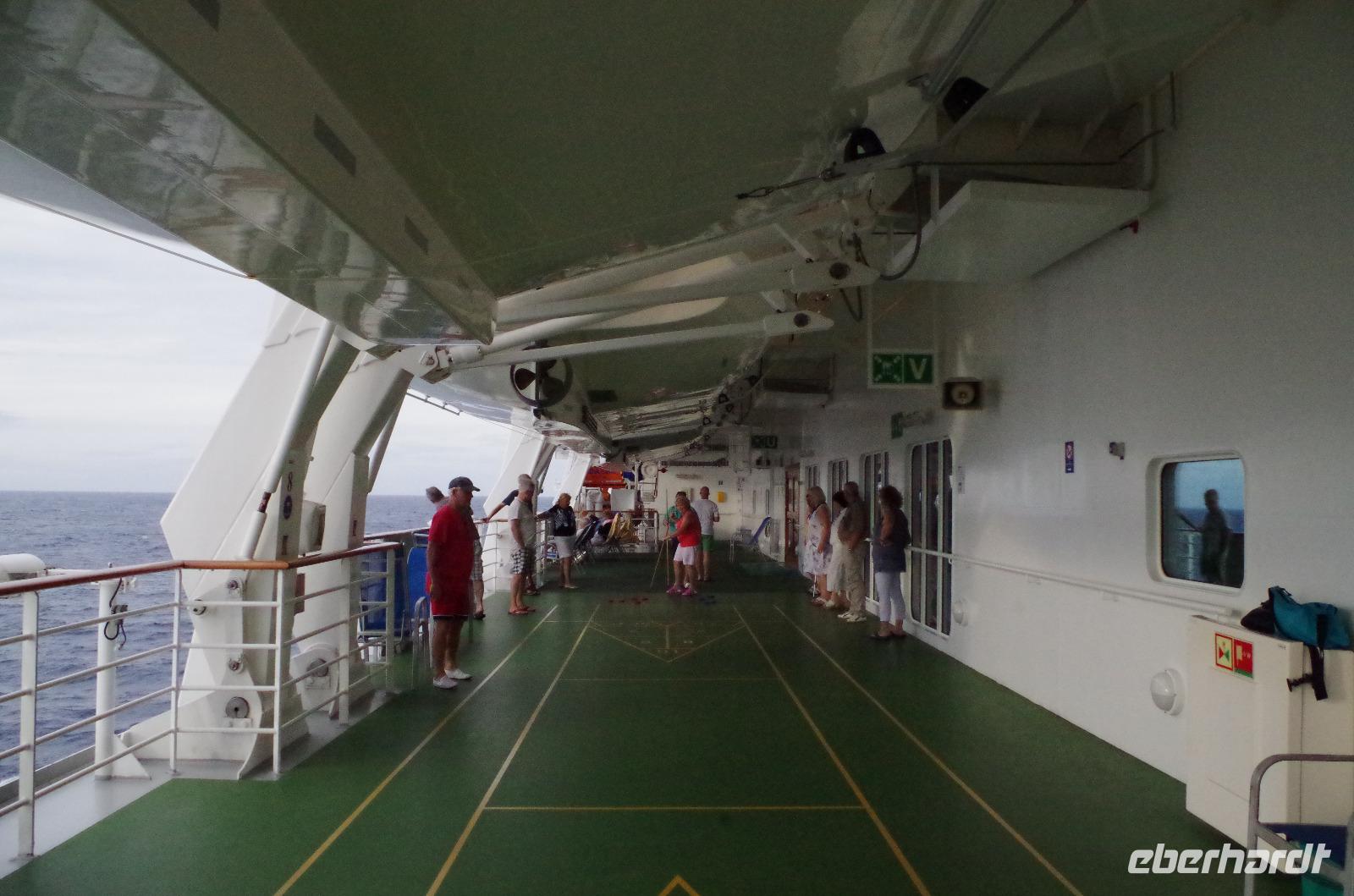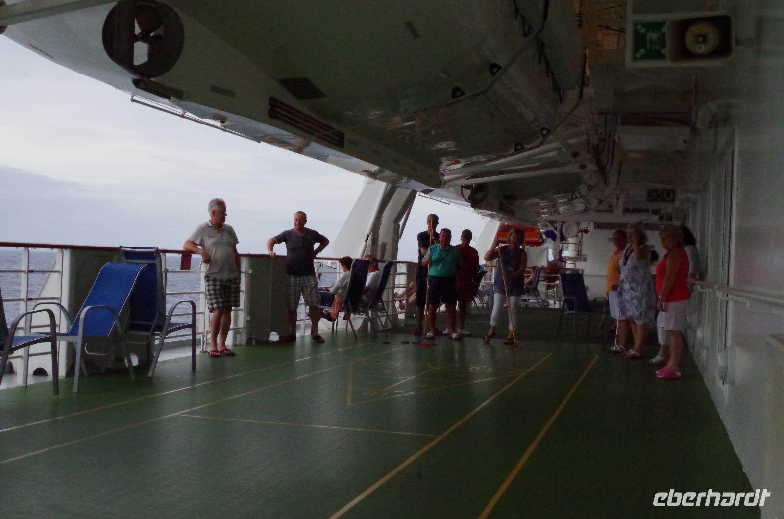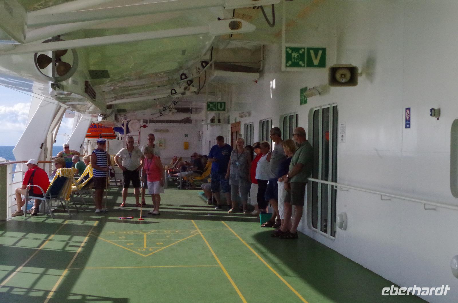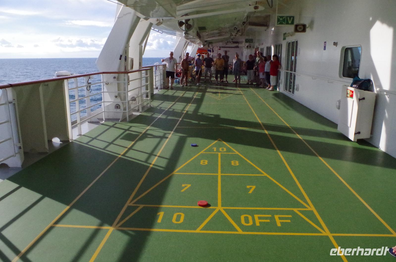 Ein weiterer Tag zur Erholung auf See erwartet uns. Frühstücken können wir heute wieder ab 07.30 Uhr im "Markt Restaurant". Es ist leicht bewölkt bei rund 26 Grad. Bis zur Ho-Chi-Minh-Stadt/Phu My liegen noch rund 279 Seemeilen bzw. 517 Kilometer vor uns. In der Nacht von Dienstag zu Mittwoch sind von 03.00 Uhr auf 02.00 Uhr die Uhren wieder umzustellen. Das Veranstaltungsprogramm besteht heute unter anderem um 10.00 Uhr aus der Ausflugspräsentation zu Sihanoukville im Theatrium auf Deck 9 bis 11. Zum Mittag und Nachmittagskaffee treffen sich einige Gäste wieder im "Weite Welt Restaurant". Für den Landgang der Ho-Chi-Minh-Stadt/Phu My wird eine Landgangskarte benötigt. Die Ausgabe dieser Karten erfolgt um 15.30 Uhr im Theatrium Deck 9. Für Unterhaltung und Spaß an diesem Tag sorgt sicher unsere gemeinsame Eberhardt TRAVEL Shuffleboard Runde um 15.45 Uhr. Es spielen sechs Frauen gegen sechs Männer. Während die erste Runde noch zum Einspielen dient, werden im zweiten Durchgang schon eine Vielzahl an Punkten erspielt. Um 17.30 Uhr findet ein wichtiges Gruppentreffen statt: Wir haben unser gemeinsames Fotoshooting an Bord, auch ohne den Kapitän entsteht ein wirklich schönes Gruppenfoto auf der Treppe im Theatrium :-) Zuvor gibt es noch ein kleines Geburtstagsständchen für einen Reisegast von der ganzen Gruppe. Das Abendessen findet wie gewohnt für die meisten Eberhardt-Reisegäste um 18.30 Uhr im "Weite Welt Restaurant" statt. Bei gutem Essen, leckerem Wein und tollen Gesprächen lassen wir einen schönen erholsamen Tag gemeinsam ausklingen.