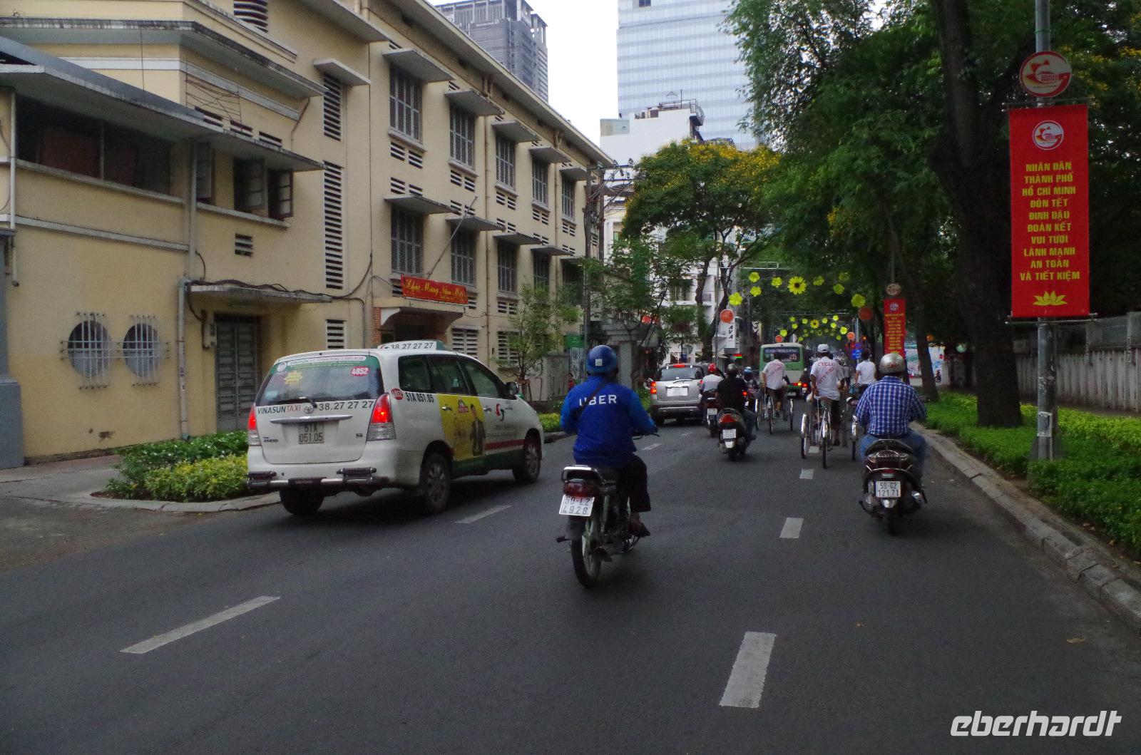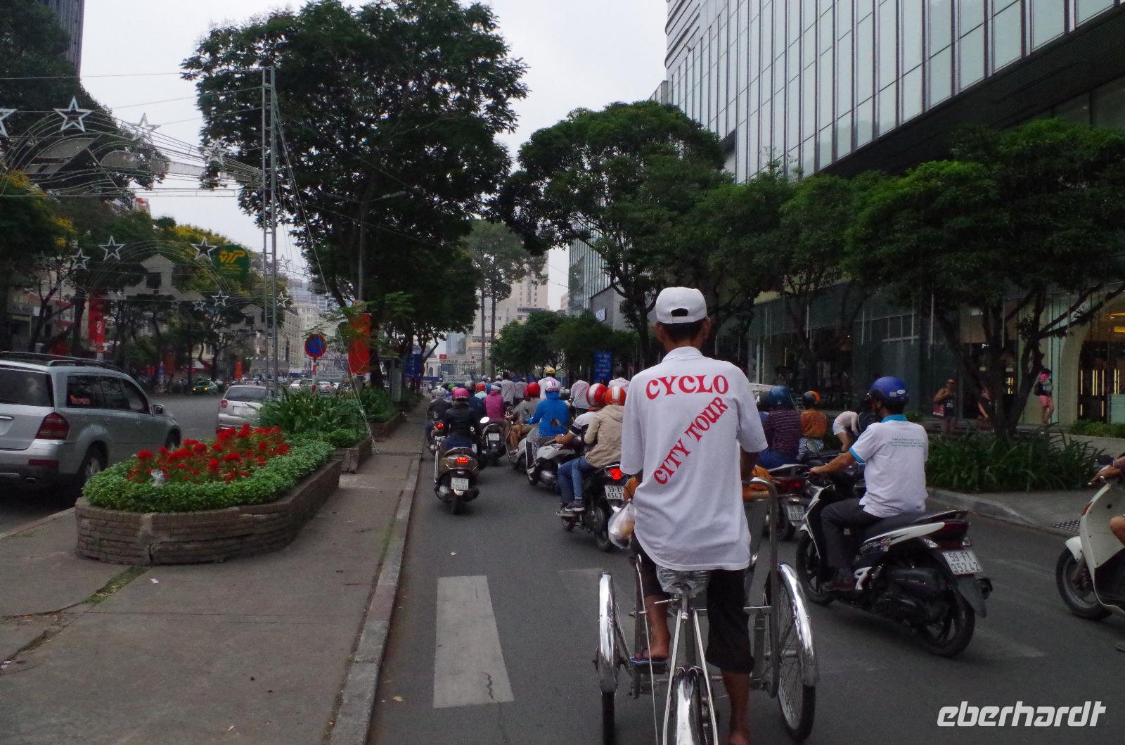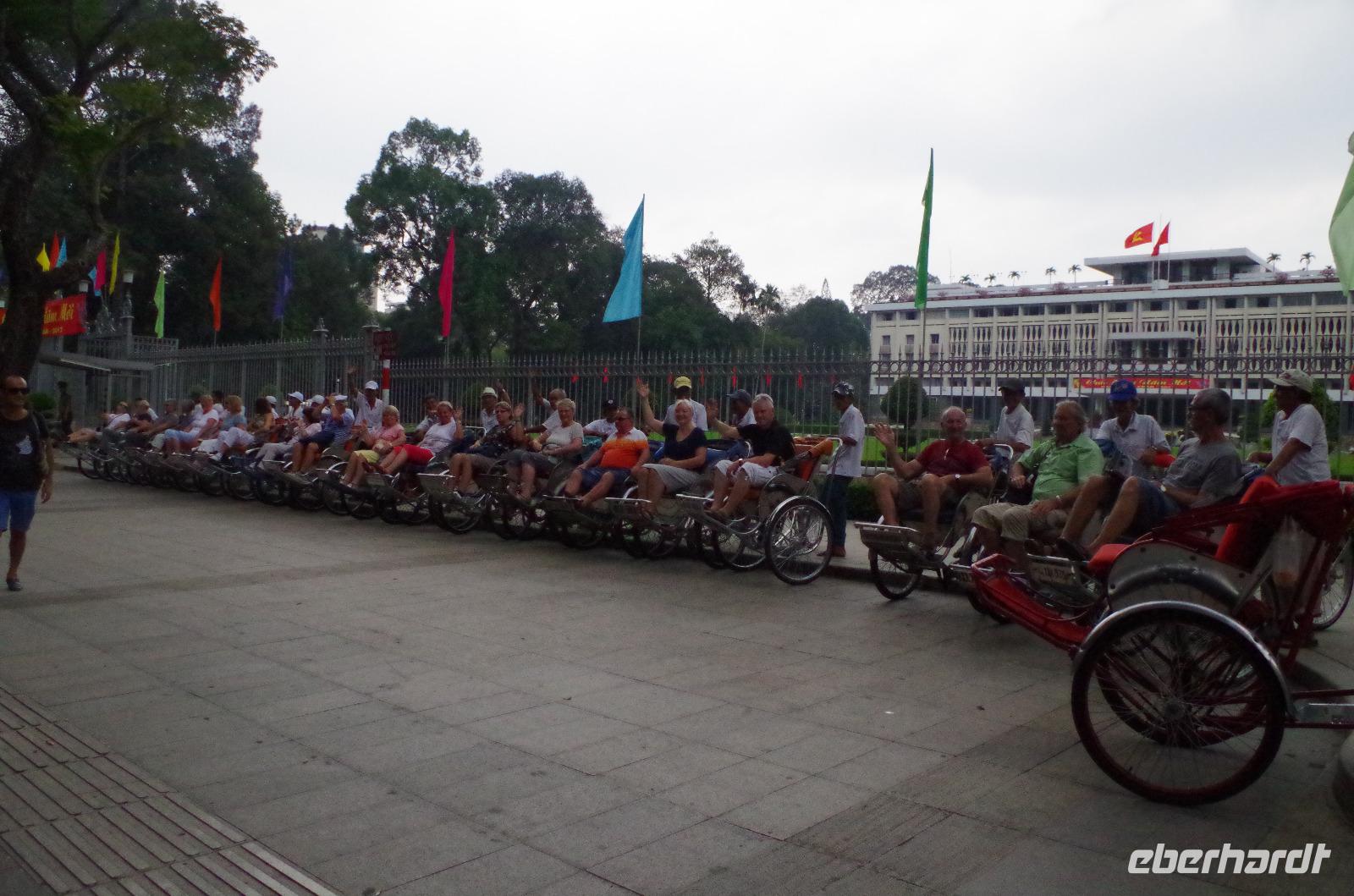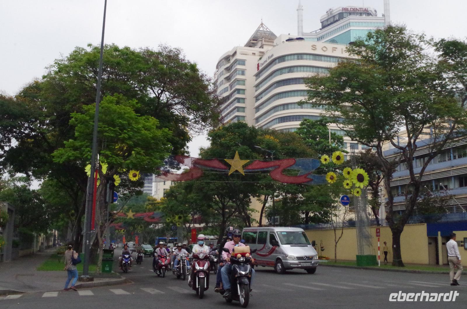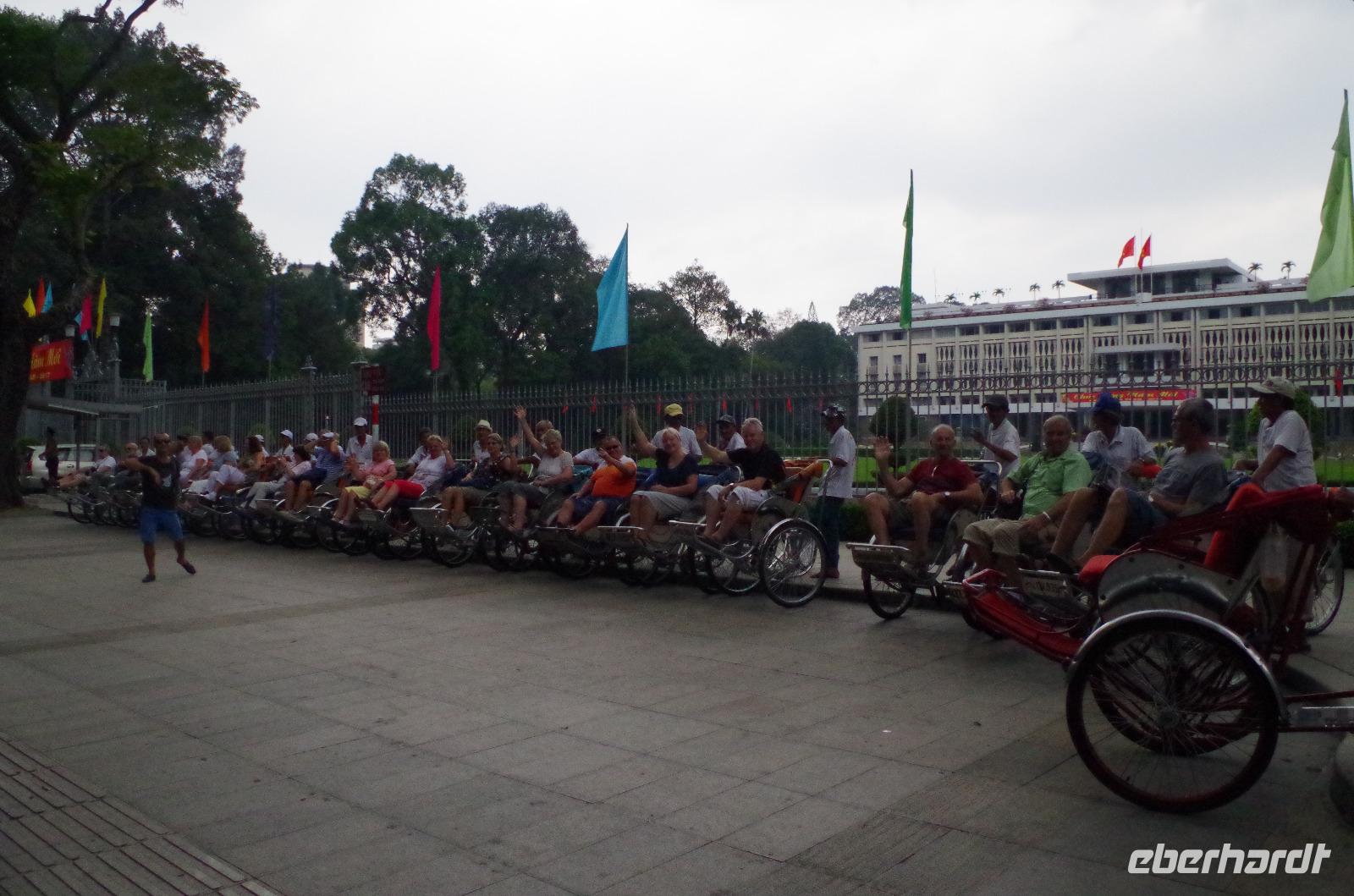 Während wir uns die vergangenen zwei Tage super erholt haben, freuen wir uns auf einen weiteren Tag voller kultureller und abenteuerlicher Highlights. Heute ist es wechselhaft bei rund 31 Grad Celsius. Wir werden mit einem vietnamesischen Hallo "Xin Chao!" begrüßt. Mit einer Ausdehnung von 1.650 Kilometern von Nord nach Süd ist Vietnam über 330.000 Quadratkilometer groß. Die breiteste Stelle mit circa 600 Kilometern befindet sich im Norden, die engste Ausdehnung mit 50 Kilometern an der Zentralküste in der Provinz Quang Binh. Die am Fluss Saigon gelegene Ho-Chi-Minh-Stadt hatte bis 1976 den gleichnamigen Namen wie der Fluss getragen. Heute heißt diese 6,8-Millionen-Metropole wie der vietnamesische Revolutionär Ho Chi Minh. Für den Landgang werden Bordkarte und eine lokale Landgangskarte benötigt, welche wir vor zwei Tagen abgeholt haben. Wer noch Geld tauschen möchte, kann dies gern an der Rezeption an Bord der AIDAbella vornehmen. Der Wechselkurs liegt ungefähr bei 1 Euro zu 25.000 Vietnamesischen Dong. Viele Gäste treffen sich ab 06.00 Uhr im "Weite Welt Restaurant" beim Frühstück. Pünktlich um 07.00 Uhr erreicht die AIDAbella den Hafen ODA Thi Vai Port der Ho-Chi-Minh-Stadt/Phu My in Vietnam. Die komplette Reisegruppe geht gemeinsam um 07.15 Uhr von Bord, ein weiterer großartiger Eberhardt-Exklusiv-Ausflug steht uns unmittelbar bevor :-) Bekannte Sehenswürdigkeiten der Ho-Chi-Minh-Stadt sind die Kathedrale Notre Dame, das Alte Hauptpostamt, die Wiedervereinigungshalle, auch Palast der Einheit genannt, die Xa Loi-Pagode oder der Ben-Thanh-Markt. Um 07.30 Uhr treffen wir auf unseren jungen Reiseleiter Luan, welcher uns mit seiner lustigen und jugendlichen Art noch zum Lächeln bringen wird. Ähnlich wie in Bangkok und Kuala Lumpur dauert die Fahrt vom Hafenterminal ins Stadtzentrum längere als eine Stunde. Gegen 09.00 Uhr erreichen wir das Chinatown von Saigon, unternehmen eine Bio-Pause und besuchen anschließend eine Tempelanlage. Nächster Programmpunkt ist der Besuch eines typischen Marktes, wobei neben dem Verkauf von jeder Menge verschiedener Arten an Obst und Gemüse auch "frisches" Fleisch angeboten wird. Besonders auffallend und für uns eher unnatürlich ist die Tatsache, dass "frisches" Fleisch oder auch Eier mitten auf den Tisch liegen, obwohl eine Hitze von über 30 Grad herrscht. Wir würden dieses Essen im Kühlschrank aufbewahren, hier ist es aber scheinbar vollkommen normal, die Sachen einfach anzubieten ohne sie in einer Kühlvorrichtung zu kühlen. Dies ist schon eher ungewohnt für uns! Dann besuchen wir eine typische Markthalle, wo uns ein ähnliches Schauspiel geboten wird. Der Unterschied besteht allerdings darin, dass wir uns dieses Mal in einer riesigen Halle befinden, die Stände dicht beieinander stehen und aufgrund der vielen Menschen das Durchlaufen manchmal sehr langsam erfolgt. Wir besuchen individuell diese große Einkaufshalle und passieren unter anderem Stände mit Schmuck, Kleidung, Obst, Gemüse und Souvenirs. Der ein oder andere Reisegast kauft sich auch ein Andenken für zuhause wie beispielsweise den sogenannten landestypischen Reishut. Wir laufen danach durch die bekannte Einkaufsstraße "Dong Khoi Street" zum Mittagessen um 11.30 Uhr im Restaurant "Pho 24". Der heutige Tag könnte auch die Überschrift "Ein Tag voller unbekannter ungewöhnlicher abenteuerlicher Erlebnisse!" tragen! Diese landestypische und bei Einheimischen sehr beliebte Restaurantkette zählt da sicher dazu ;-) Unser Essen besteht aus einer typische asiatischen Nudelsuppe mit Hühnchen, Rindfleisch oder ohne Fleisch. Wir versuchen uns im Essen mit Stäbchen, auch wenn uns der Löffel sicherlich lieber ist, aber ein Versuch ist es wert :-) Das wohl spannendste Ereignis am heutigen Tag findet gleich nach dem Essen statt. Wir werden eine einmalige aufregende Fahrt in der dreirädrigen Fahrradrikscha "Trishaw" durch Saigon erleben! Jeder Gast steigt in eine Rikscha und um 12.30 Uhr startet unser Tour in Chinatown mit einem Foto-Stopp am der Wiedervereinigungshalle. Der 1966 errichtete Präsidentenpalast "Presidential Palace" basiert auf einem Entwurf von Ngo Viet Thu, ein vietnamesischer Architekt, und wurde 1975 nach Beendigung des 30 Jahre andauernden Vietnamkriegs durch Nordvietnam in "Wiedervereinigungshalle" umbenannt. Wir fotografieren diese Sehenswürdigkeit von außen, lassen noch ein schönes Gruppenfoto von allen in der Rikscha machen und weiter geht es durch den verrückten vietnamesischen Verkehr zum Alten Postamt und zur Kathedrale Notre Dame am Platz Cong Xa Paris. Die Fahrt ist schon ein einmaliges Erlebnis, der Verkehr in Saigon einfach unglaublich, so viele Mopeds auf einmal, teilweise mit bis zu vier Menschen drauf, der absolute Wahnsinn! Es könnte wie folgt kurz zusammengefasst werden: Laut, bunt und ein klein wenig verrückt ;-) Jeder fährt wie er möchte, ein Moped neben dem anderem!!!! Es ist schon erstaunlich, wie viele Menschen oftmals auf einem Moped fahren. Beeindruckend ist sicher auch, was hier alles transportiert wird, von Lebensmitteln, Kleidung bis riesigen Kisten ist alles dabei. Auf so eine Idee würden wir in Deutschland wohl eher nicht kommen ;-) Eine Stunde später besichtigen wir die im Norden an der Flaniermeile Duong Dong Khoi gelegene, 1880 aus rotem Backstein errichtete neoromanische Kathedrale Notre Dame von außen und das Alte Postamt von innen. Hier besteht abermals die Möglichkeit, kleine Andenken zu kaufen. Danach fahren wir wieder zum Hafenterminal zurück. Unterwegs legen wir einen kurzen Stopp bei einem Reisefeld und Reisbauern ein, wo uns Luan typische Pflanzen und Gemüsesorten zeigt. Im Hafen verabschieden wir uns freundlich von Luan und wünschen ihm und seiner Familie alles Gute. Bei köstlichem Essen und leckeren Wein im "Weite Welt Restaurant" lassen wir die heutigen Erlebnisse Revue passieren. Wer möchte, schaut um 22.00 Uhr bei der Poolshow "Schlagersause" und der Poolparty mit DJ Maik auf dem Pooldeck