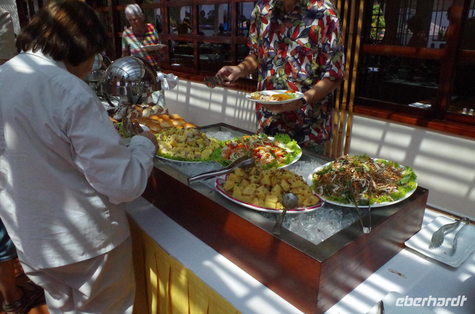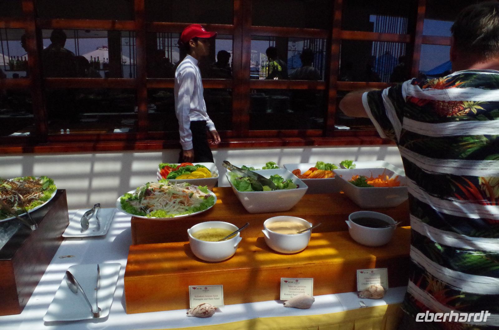 Wieder ein Tag zum Entspannen und Erholen auf See :-) Obwohl wir alle diese Tage individuell gestalten können, ist es doch sehr schön, einige Mahlzeiten oder Veranstaltungen gemeinsam zu besuchen. Wir haben rund 24 Grad bei leicht bewölktem Himmel. Das Frühstücksbuffet im "Weite Welt Restaurant" auf Deck 10 startet um 07.30 Uhr und ist abermals sehr lecker. Heute liegen noch rund 202 Seemeilen, gesamt 374 Kilometer, bis nach Penang vor uns. Danach treffen sich einige Gäste um 10.00 Uhr im Theatrium Deck 9 bis 11 zur Ausflugspräsentation Kuala Lumpur/Port Klang und zu Bangkok/Laem Chabang. Anschließend gönnen wir uns um 12.30 Uhr ein gemeinsames Mittagessen im "Weite Welt Restaurant". Den Nachmittag gestalten die Gäste wieder individuell, zur Erholung und Entspannung dienen unter anderem die Sauna oder Wellness-Oase. Um 14.00 Uhr hören und schauen wir uns den interessanten Vortrag von Lektor Gerrit Aust zu Malaysia im Theatrium zu. Für den Landgang in Sihanoukville ist eine Ein- und Ausreisekarte sowie eine Zollklarierung auszufüllen, welche zwischen 17.00 Uhr und 18.00 Uhr in der AIDA Bar bei der Crew abzugeben sind. Zur gewohnten Zeit treffen wir uns um 18.30 Uhr zum Abendessen im "Weite Welt Restaurant". Nach einem vorzüglichen Dinner schauen wir uns um 21.00 Uhr im Theatrium die Show des Gastkünstlers Lars Hohlfeld "Vom Höhlenmann zum Bräutigam" an, welche wohl eher zu geteilten Meinungen führt. Später findet auf dem Pooldeck 11 die White Poolparty statt. Bei leckeren Cocktails, Wein und Bier lassen wir den Abend ausklingen.