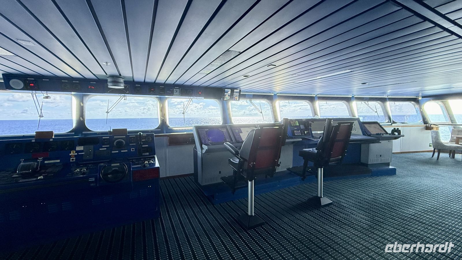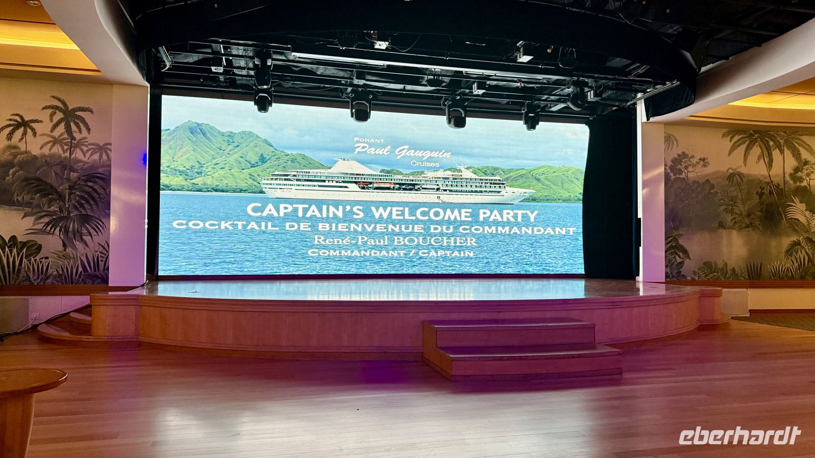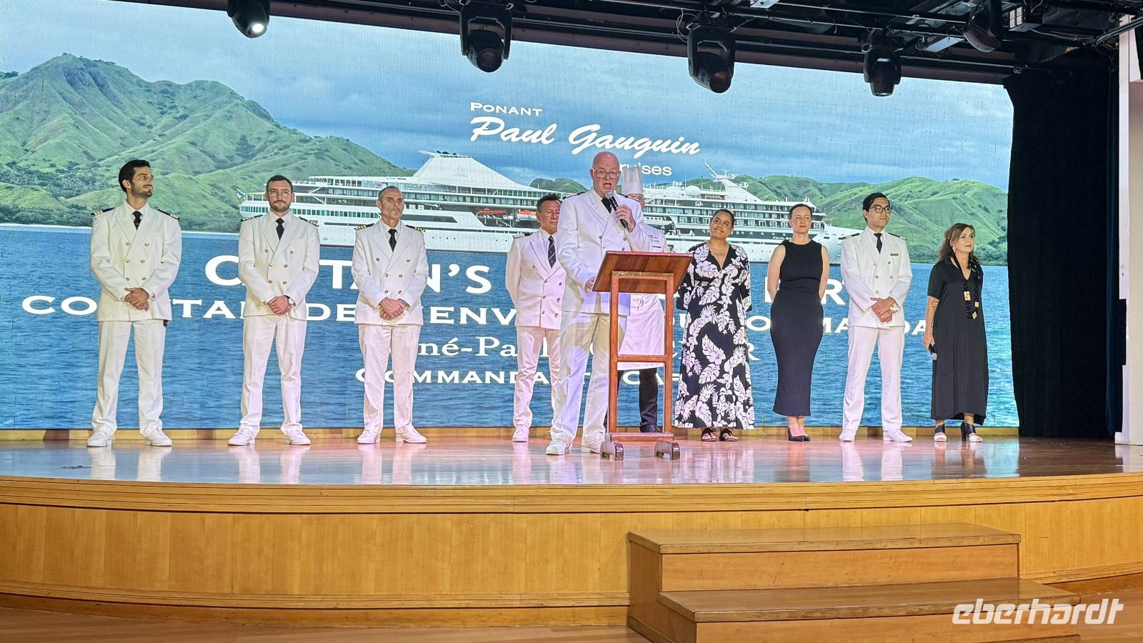Am ersten Tag auf dem Schiff frühstückten wir in aller Ruhe und genossen die entspannte Atmosphäre an Bord. Anschließend trafen wir uns zu einem Schiffsrundgang, der mit einem Besuch auf der Brücke und einem Treffen mit dem Kapitän begann. Dort erfuhren wir viele interessante Details über die Paul Gauguin und ihre Technik.