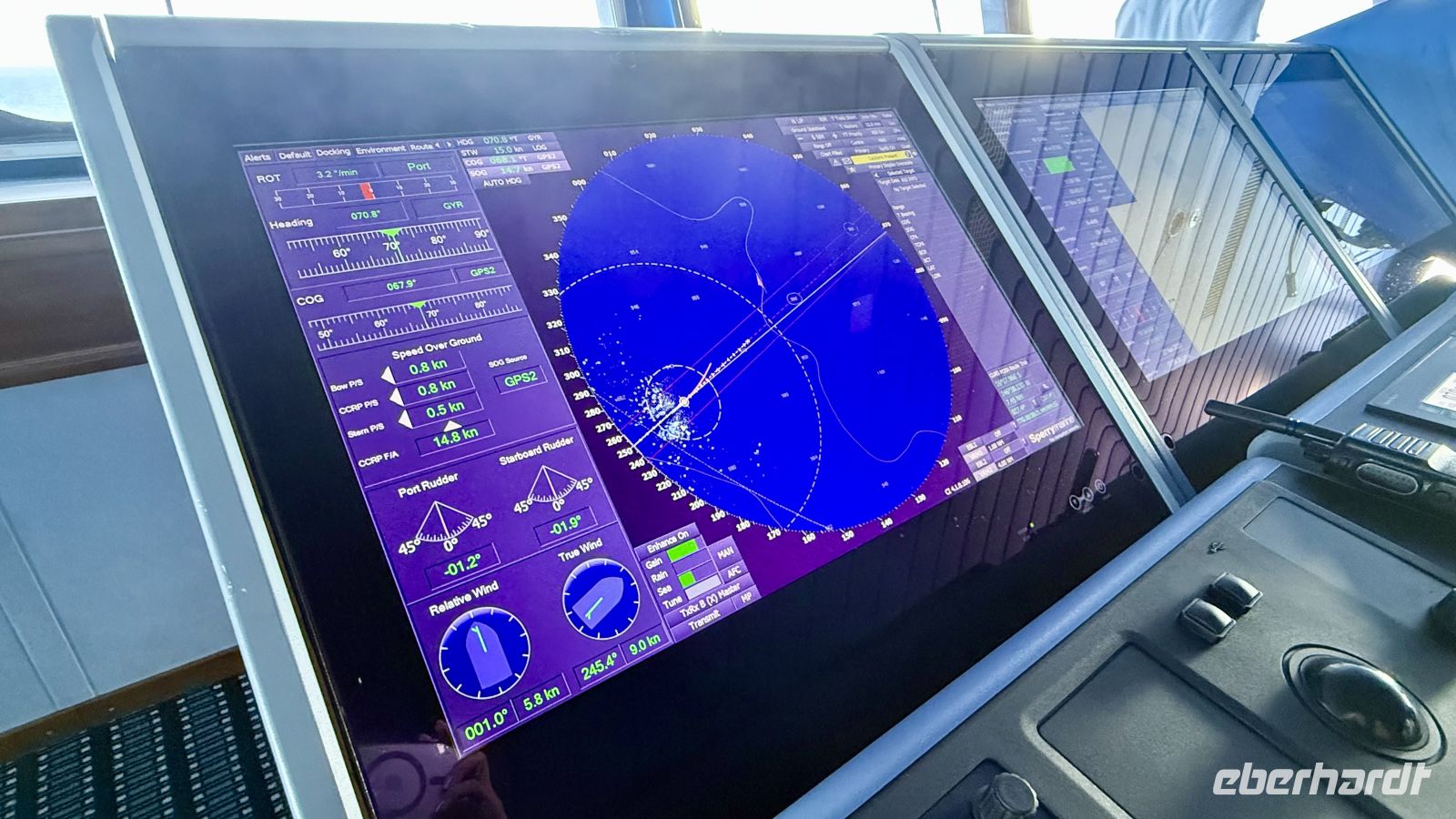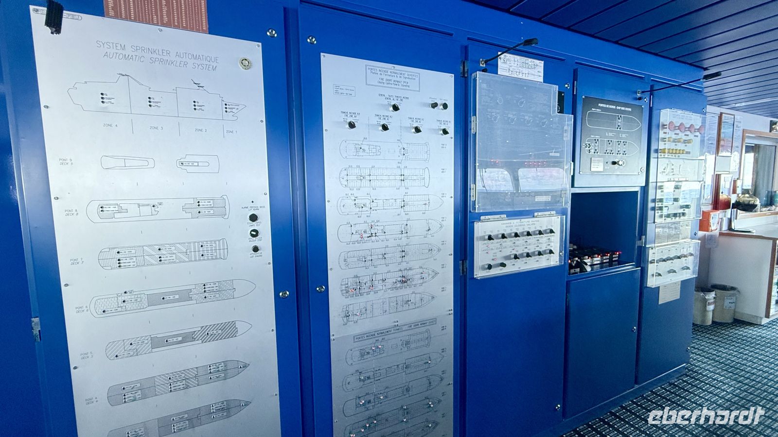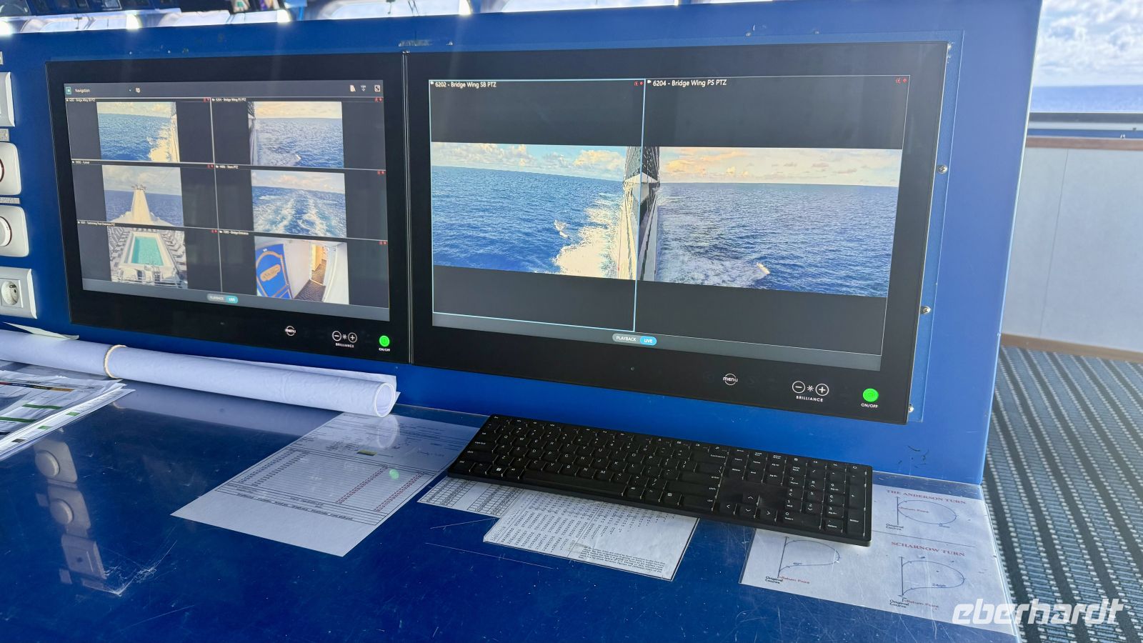 Das Schiff ist mit modernen Navigations- und Sicherheitssystemen ausgestattet. Eines davon überwacht ständig den Tiefgang, damit stets genügend Wasser unter dem Schiff ist. Ein weiteres System kontrolliert den Abstand zu Hindernissen und anderen Schiffen, um Kollisionen auszuschließen. Zusätzlich beobachten Offiziere rund um die Uhr alle Bewegungen im Wasser visuell – ein wichtiger Sicherheitsfaktor in engen Lagunen oder beim Ansteuern kleiner Häfen. Der Kapitän erklärte uns, dass er trotz modernster Technik nicht ausschließlich auf Radar und elektronische Seekarten setzt. Ganz „oldschool“ nutzt er weiterhin eine klassische Papierseekarte, um die Route zusätzlich zu überwachen. Gesteuert wird die Paul Gauguin im regulären Betrieb mit einem Steuerknauf, der feinere Bewegungen ermöglicht. In schwierigeren Passagen – etwa bei Hafeneinfahrten oder in engen Riffen – übernimmt jedoch das traditionelle Steuerrad. Der Kapitän ist jeweils zwei Monate im Dienst und anschließend zwei Monate zu Hause. Eine Schicht dauert regulär vier Stunden, dennoch kann der Kapitän jederzeit gerufen werden und ist praktisch rund um die Uhr verfügbar. Das Schiff fährt üblicherweise 10 bis 12 Knoten, die maximale Geschwindigkeit liegt bei etwa 16 Knoten. Aufgrund moderner Technik, klarer internationaler Standards und gut geschulter Crew sei es heute allerdings selten, dass es zu Unfällen oder schwerwiegenden Vorfällen kommt. Zum Abschluss machten wir ein Gruppenbild mit dem Kapitän und bedankten uns für die vielen spannenden Einblicke.