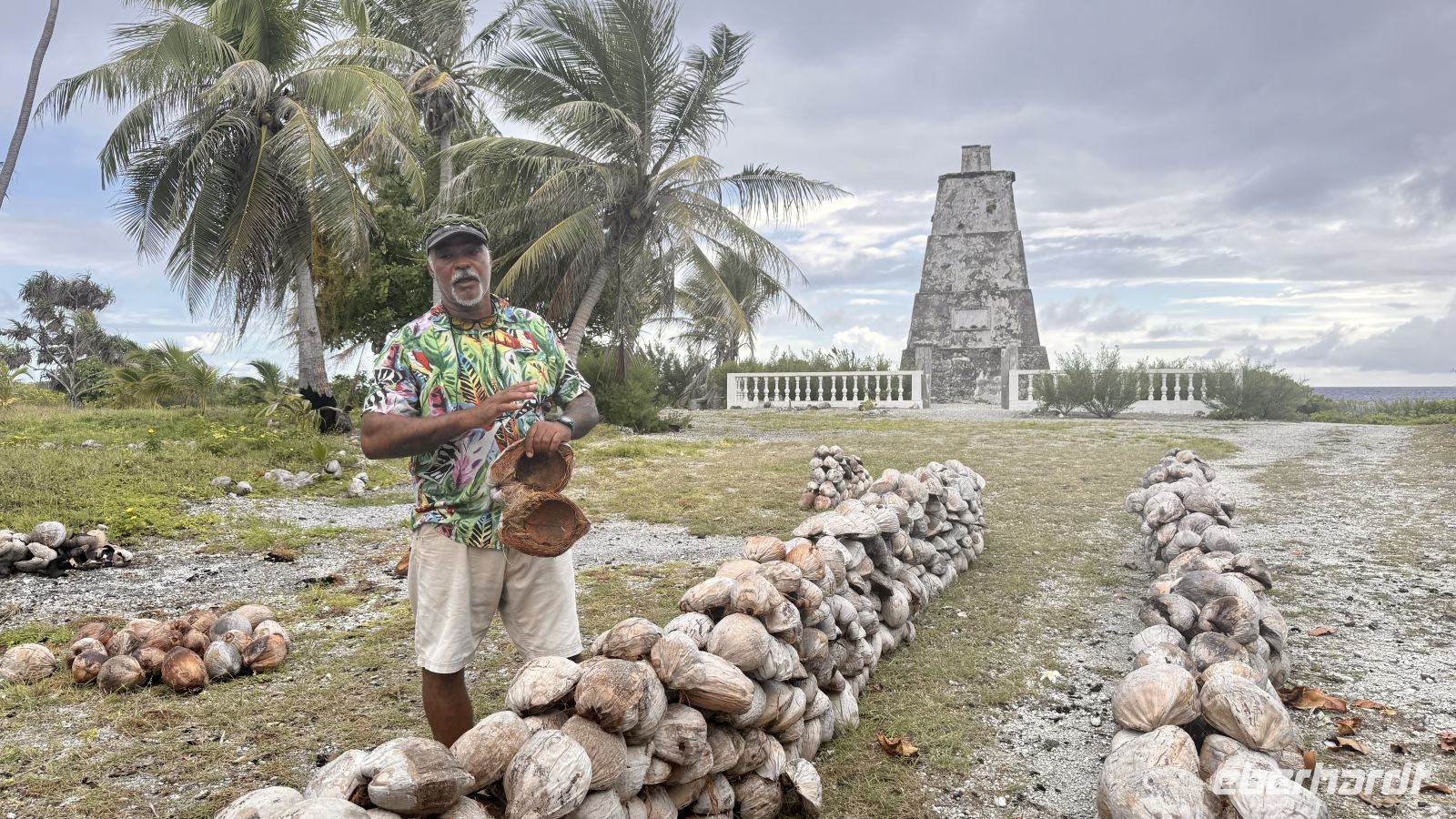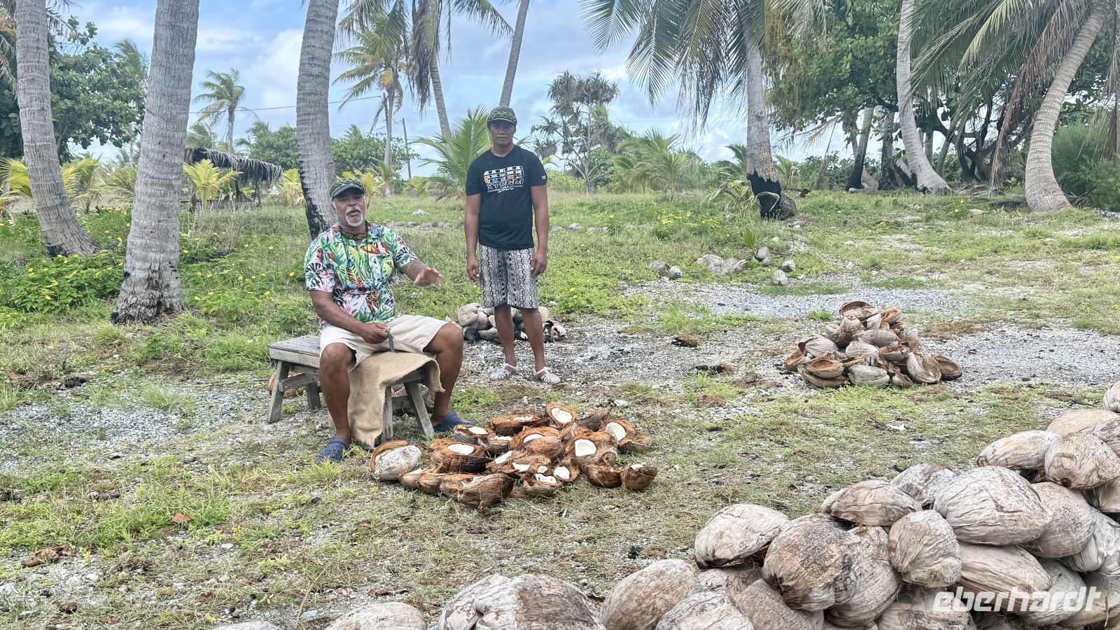 Ein zentraler Bestandteil des Lebens auf Fakarava ist die Kokospalme. Sie bietet nicht nur Nahrung und Baumaterial, sondern auch eine der wichtigsten Einnahmequellen: die Produktion von Coprah, also getrocknetem Kokosnussfleisch. Dazu wachsen die Palmen etwa sieben Jahre, bevor sie zuverlässig tragen. Danach liefern sie täglich drei bis vier Kokosnüsse und können rund 40 Jahre alt werden. Nach dem Sammeln werden die Kokosnüsse geöffnet und das weiße Fruchtfleisch herausgelöst. Dieses wird anschließend mehrere Tage lang in der Sonne getrocknet, bis es hart und ölig wird. Der getrocknete Coprah wird später an Sammelstellen abgegeben und von dort nach Tahiti verschifft, wo er weiterverarbeitet wird – hauptsächlich zu Kokosöl. Die Bezahlung erfolgt in Qualitätsstufen: Für erstklassigen Coprah erhalten die Bewohner etwa 135 Franc pro Kilogramm, für die zweite Qualität rund 35 Franc. Auch wenn der offizielle Weltmarktpreis höher liegt, wird in abgelegenen Atollen oft weniger bezahlt, da Transport und Logistik aufwendig sind. Neben Coprah zählen Vanille und die Zucht schwarzer Perlen zu den wichtigsten Einnahmequellen der Inselbewohner.