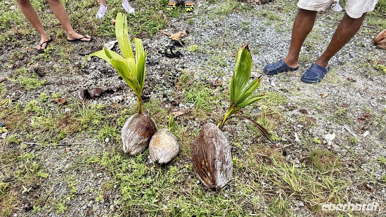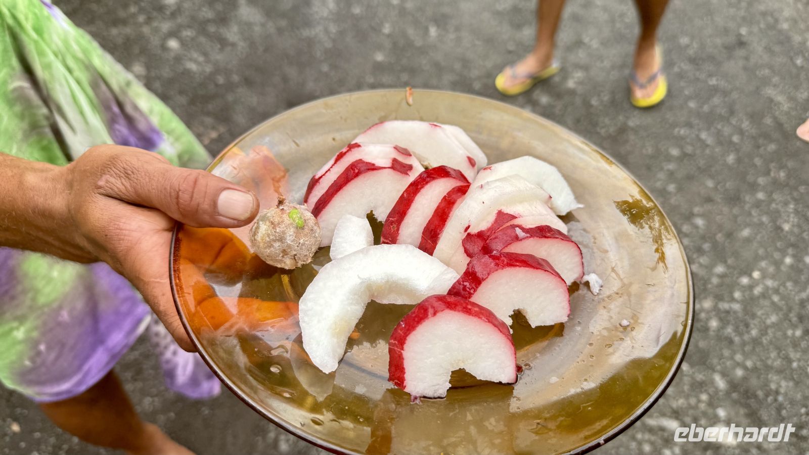 Wenig später erreichten wir einen weiteren interessanten Punkt, an dem wir mehr über den Purō erfuhren – ein vielseitiges Alltagswerkzeug aus der Natur. Die faserigen Teile der Pflanze werden für Schalen, Unterlagen oder sogar Verpackungen verwendet. Auch Teller aus Blättern zeigen, wie erfinderisch und nachhaltig die polynesische Kultur seit jeher ist.