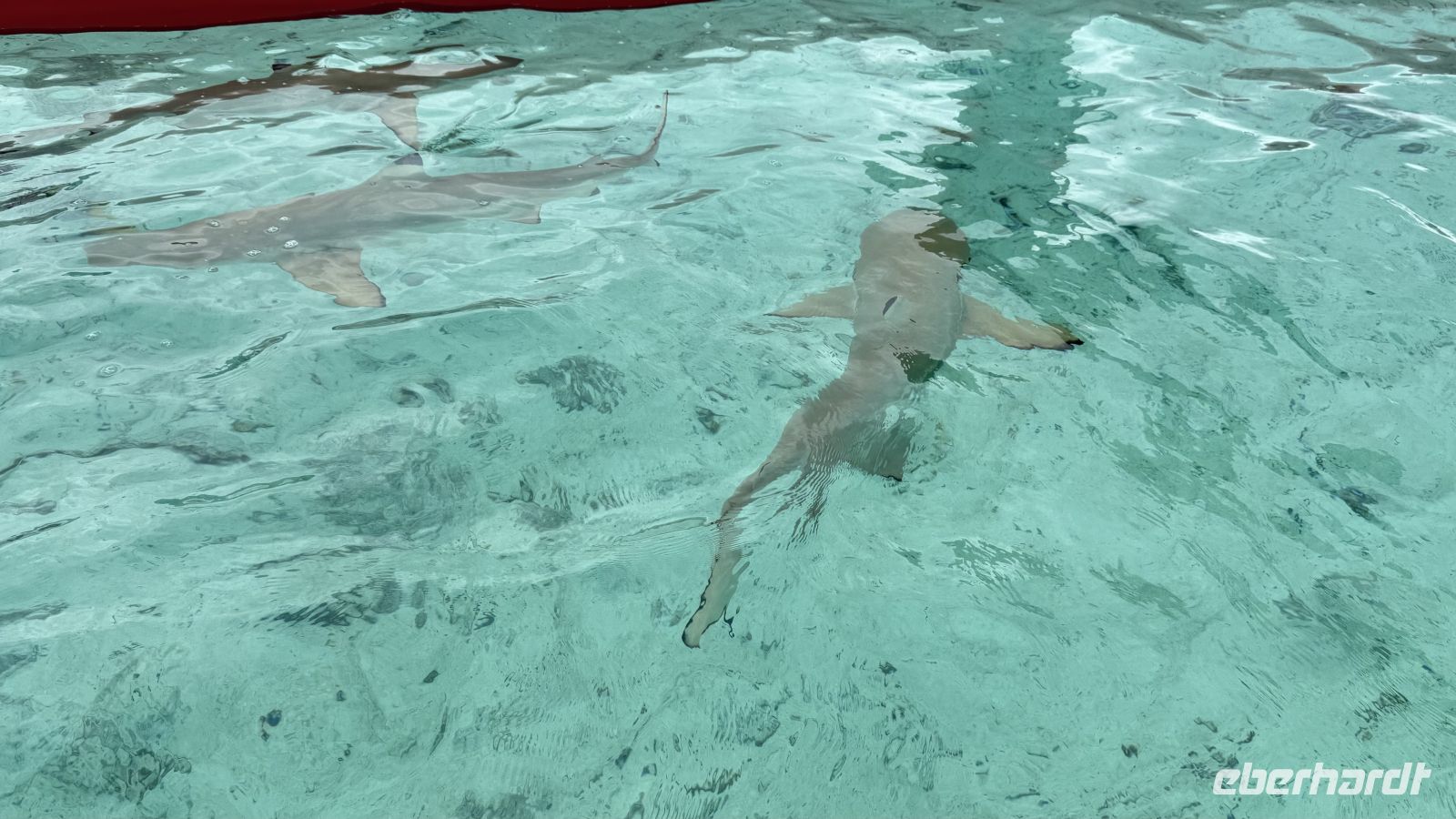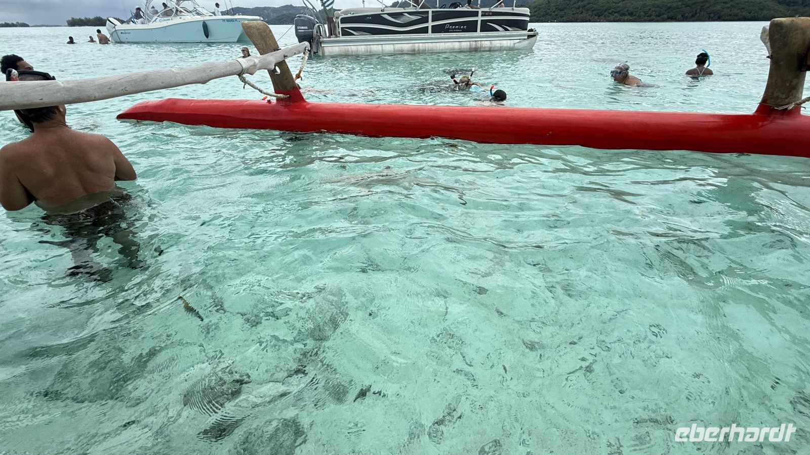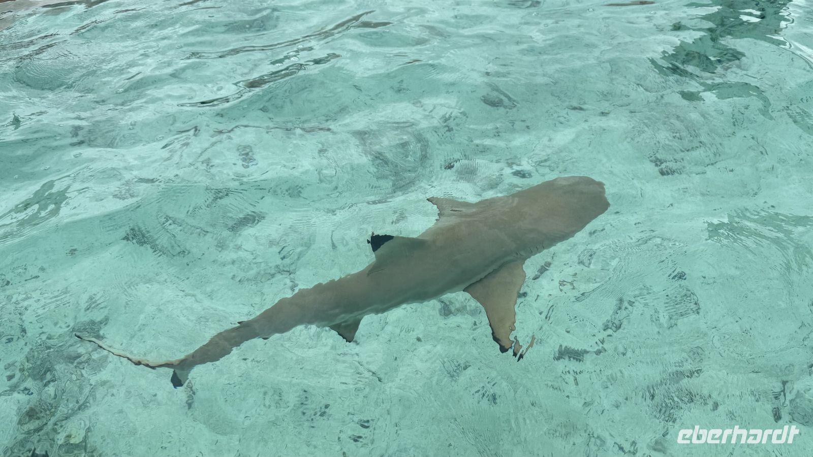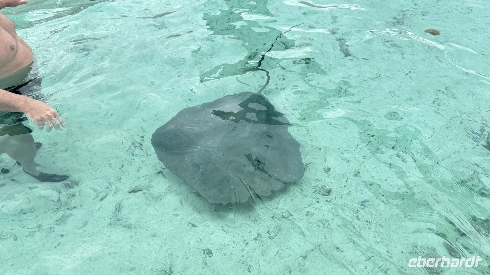 Es folgte ein Halt bei den Stachelrochen, wo wir die Tiere aus ruhiger Entfernung beobachten konnten. Danach kamen wir zu einem der aufregendsten Spots der Lagune: dem Gebiet der Schwarzspitzen-Riffhaie und Mantarochen. Obwohl wir im seichten Wasser standen, fühlte es sich beeindruckend und zugleich ungewohnt an, von diesen eleganten Tieren umgeben zu sein.