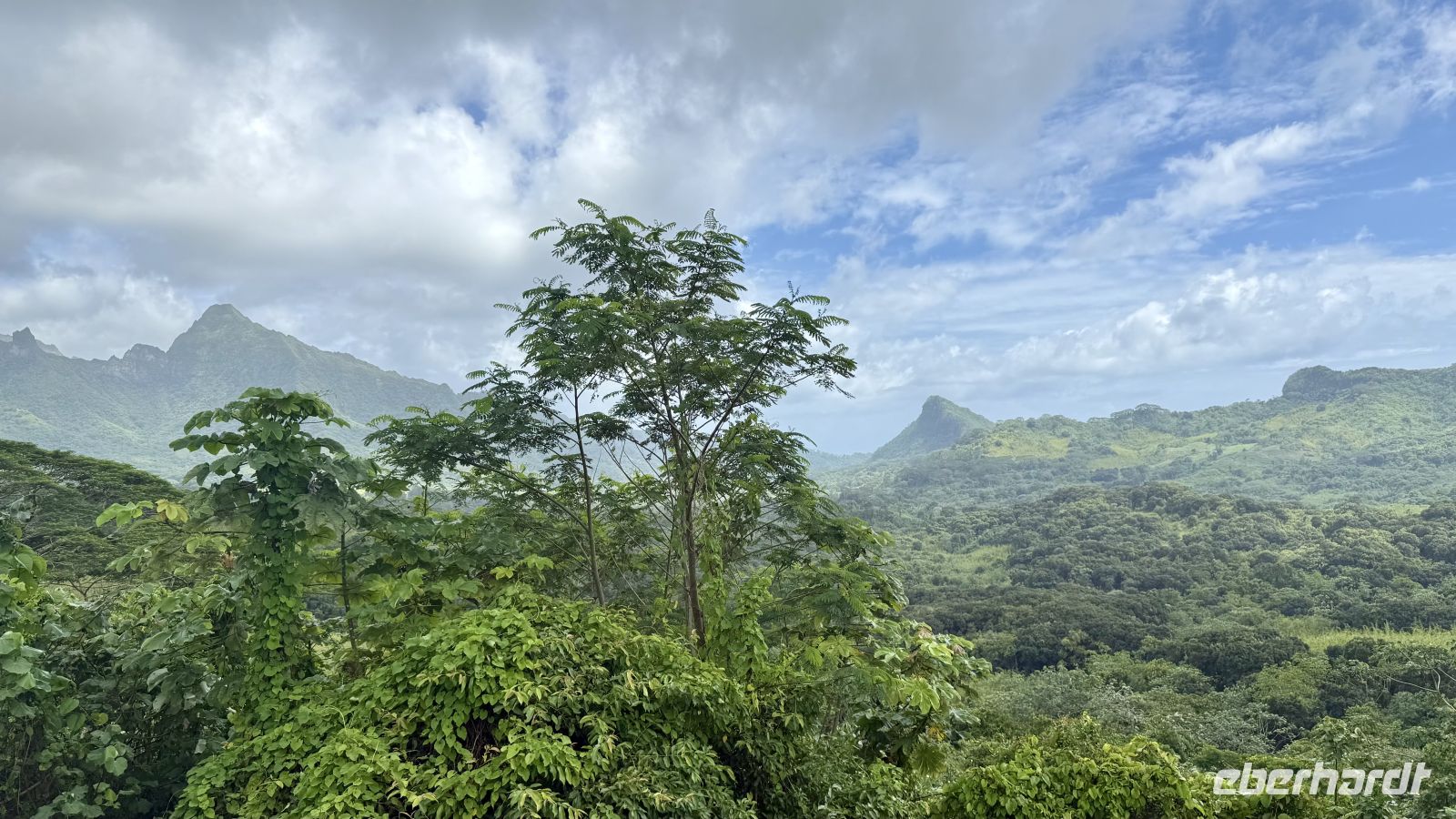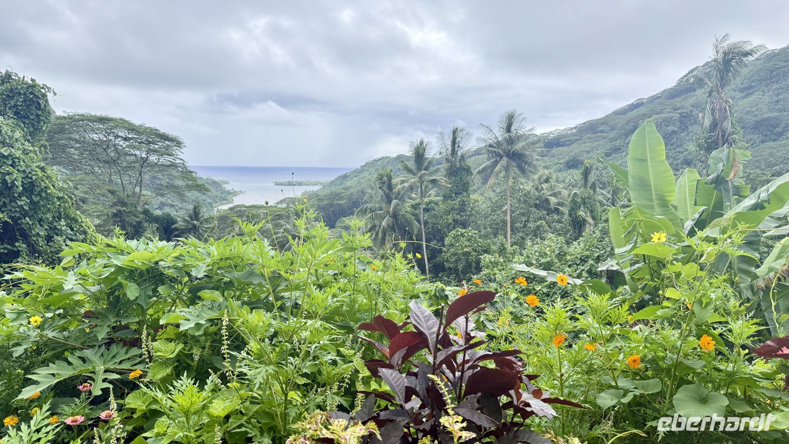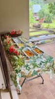 Zum Mittagessen machten wir Halt in einem Restaurant mit traumhafter Aussicht über Tahiti Iti, den kleineren, noch ursprünglich gebliebenen Teil der Doppelinsel.