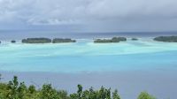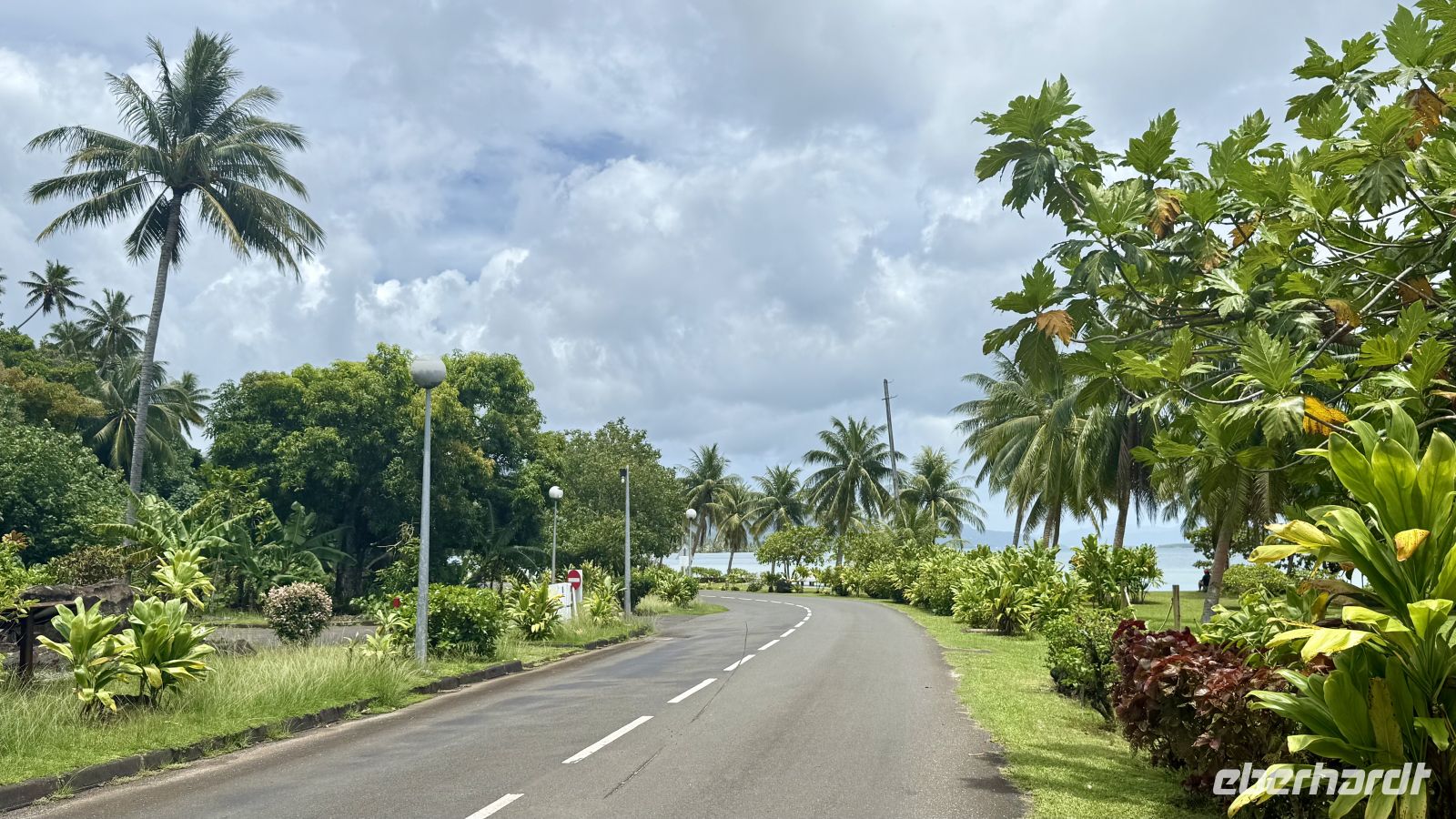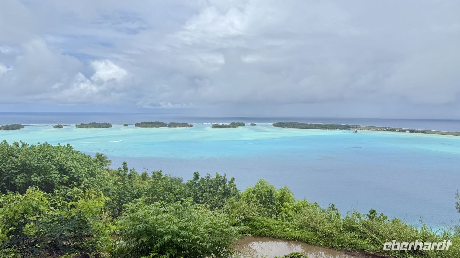 Anschließend führte uns der Weg auf eine der steilsten Straßen Bora Boras. Mit etwa 40 Grad Steigung und einer steinigen, unebenen Fahrbahn war die Auffahrt ein richtiges kleines Abenteuer. Oben angekommen bot sich uns ein spektakulärer Blick: Die Landebahn des Flughafens lag wie ein schmaler Steg im Meer, die Lagune leuchtete in intensiven Blautönen, und wir konnten weitere kleine Eilande erkennen.
