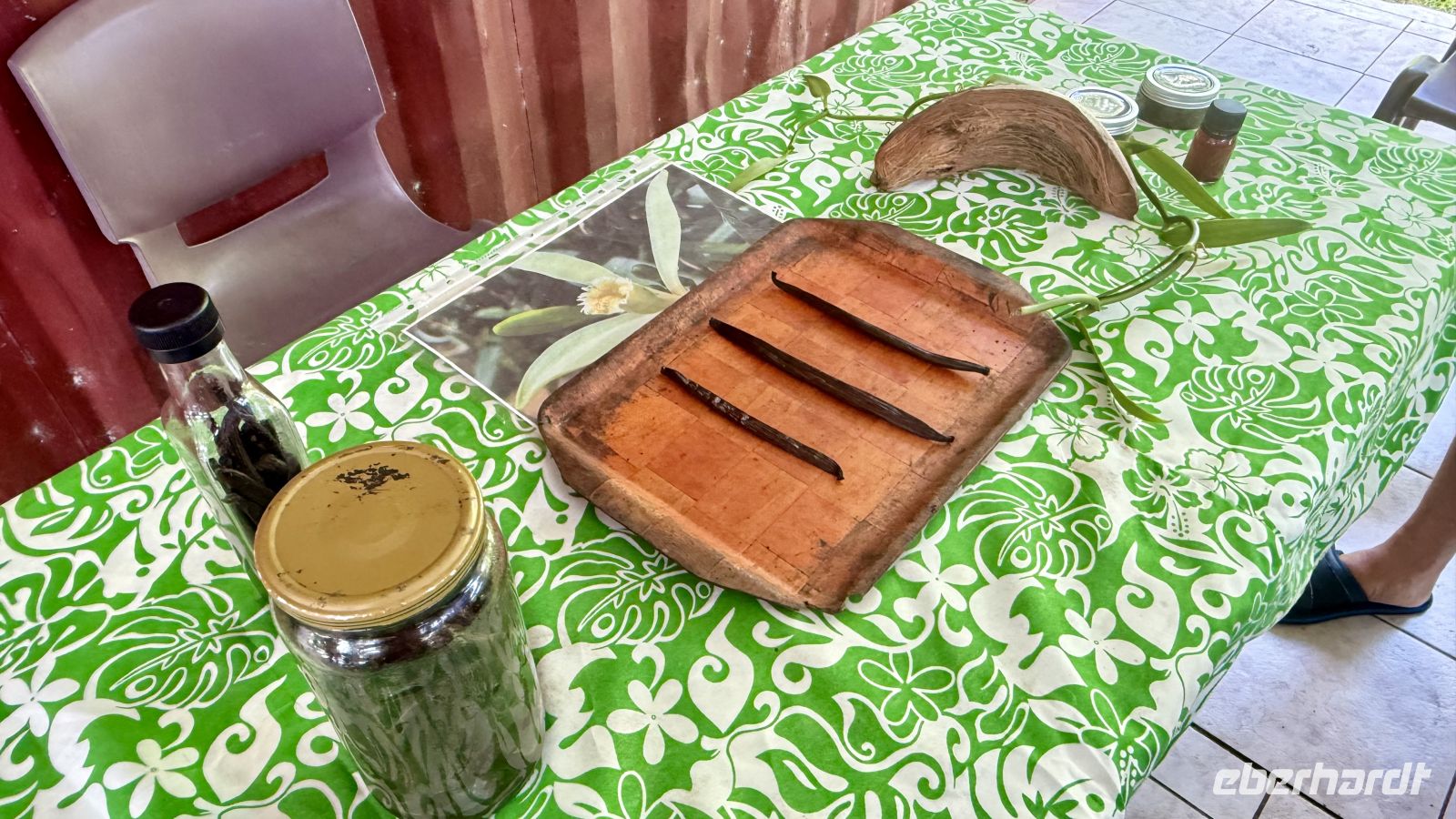 Am Vormittag besuchten wir eine Vanillefarm, denn Taha’a ist weltweit bekannt für ihre hochwertige Vanille. Die Vanillepflanze gehört zu den Orchideen und wurde erst 1848 auf die Insel gebracht. Als Kletterpflanze benötigt sie andere Pflanzen als Stütze und wächst deshalb bevorzugt an Bäumen entlang. Junge Pflanzen werden häufig mit Kokosnussschalen stabilisiert, damit sie mehr Wurzeln bilden. Wenn im April und Mai die Tage kürzer werden, beginnt die Blütezeit. Die Vanilleblüte ist sehr empfindlich: Sie öffnet sich nur für wenige Stunden und lebt lediglich einen Tag. Da es in Polynesien nicht die spezielle Melipona-Biene gibt, die in Mexiko für die natürliche Bestäubung zuständig ist, müssen die Menschen jede einzelne Blüte von Hand bestäuben. Die Methode dauert nur wenige Sekunden, ist aber zu beinahe hundert Prozent erfolgreich. Nach erfolgreicher Bestäubung entwickelt sich die grüne Schote, die erst gelb und schließlich schwarz wird. Es folgt ein langwieriger Prozess aus Erhitzen, Fermentieren und Trocknen, der zwei bis drei Monate dauert und der Vanille ihr intensives Aroma verleiht. Hochwertige Vanilleschoten können in einem dunklen Glas bis zu 20 Jahre haltbar bleiben – manchmal wird sogar etwas Rum hinzugegeben, um Geschmack und Haltbarkeit zu steigern. Eine Schote lässt sich vier- bis fünfmal verwenden, und wegen der hohen Qualität kostet ein Kilogramm Vanille heute rund 1.500 US-Dollar.