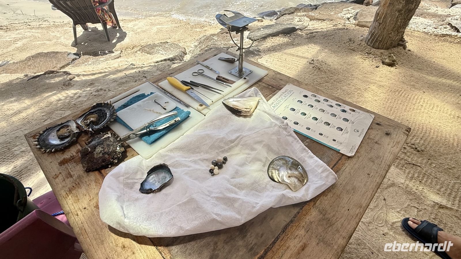 Im Anschluss besuchten wir eine Perlenfarm, denn auch die berühmten Tahitiperlen stammen aus dieser Region. Die Zucht begann 1965 in Polynesien, nachdem der Japaner Mikimoto bereits 1890 die erste Zuchtperle der Welt hergestellt hatte. Die hier verwendete „Black Lip Oyster“ kann bis zu 178 verschiedene Farbnuancen produzieren – von silbrigem Grau bis zu tiefem Schwarz. Für die Zucht wird ein kleiner Kern zusammen mit einem Stück Mantelgewebe in die Auster eingesetzt. Sie bildet daraufhin Schicht für Schicht Perlmutt, bis nach etwa zwei Jahren eine 6–8 Millimeter große Perle entsteht. Die sogenannte „Mississippi-Perle“ ist in Wirklichkeit kein natürlich entstandenes Schmuckstück, sondern der kernartige Einsatz, der bei der modernen Perlenzucht verwendet wird. Ursprünglich stammt dieser Perlenkern aus der Muschelschale der Süßwassermuschel, die im Mississippi-Flussgebiet in den USA vorkommt. Diese Muschel besitzt eine besonders dicke, gleichmäßige und robuste Innenschicht aus Perlmutt, die sich ideal eignet, um daraus kleine runde Kügelchen – sogenannte Nuklei – zu schneiden. Diese Perlenkerne bilden die Grundlage für nahezu jede Zuchtperle der Welt, auch für die berühmten Tahitiperlen. Ohne diesen Kern würde die Auster zwar auch Perlmutt bilden, aber oft nur ungleichmäßig oder in Tropfenform. Der Mississippi-Kern sorgt dafür, dass die Perle später eine schöne, runde Form erhält. Man entdeckte diese Methode um die Wende vom 19. zum 20. Jahrhundert. Als die japanischen Perlenpioniere – allen voran Kokichi Mikimoto – nach Wegen suchten, Perlen systematisch zu züchten, brauchten sie einen Knochenkern, der hart genug war, um in der Auster über Jahre zu bestehen, und gleichzeitig biologisch kompatibel sein musste. Nach zahlreichen Versuchen stellte sich heraus, dass die Süßwassermuscheln aus dem Mississippi-Fluss die besten Eigenschaften lieferten: Ihr Perlmutt ist dicht, glatt und extrem stabil. Daher begann man, die Muschelschalen zu importieren, daraus runde Kerne zu schneiden und sie weltweit für die Perlenzucht zu verwenden.Eine einzige Auster kann drei- bis viermal genutzt werden und wird danach wieder ins Meer gesetzt. Manche Austern werden bis zu 40 Jahre alt und können außergewöhnlich große Perlen hervorbringen. Die größte bekannte Tahitiperle soll 29 Millimeter gemessen haben und war mehrere Millionen Dollar wert. Der Beruf des „Crafters“, der diese aufwendigen Schritte durchführt, erfordert viel Praxis; deshalb gibt es dafür spezielle Ausbildungsstätten. Sobald die Auster geöffnet ist, darf sie nicht in die Sonne gelangen, da sie sonst rasch verenden würde.