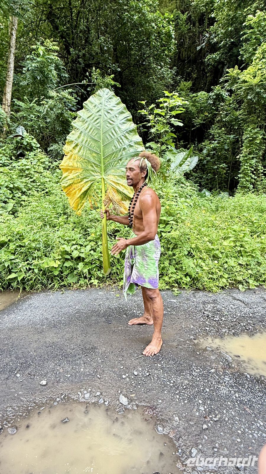 Anschließend starteten einige Gäste gemeinsam mit mir zu einem Ausflug ins Landesinnere von Tahiti, wo uns ein lokaler Guide die Natur, Pflanzenwelt und Kultur näherbrachte. Wir lernten zunächst die Taro-Pflanze kennen – eine der ältesten Nutzpflanzen Polynesiens. Taro ist eine robuste Wurzelknolle, die seit Jahrtausenden als Grundnahrungsmittel dient. Aus ihr wird eine Art Püree namens Poi hergestellt. Die großen herzförmigen Blätter werden auch „Elefantenohr“ genannt und dienen traditionell als natürlicher Schutz vor Sonne und Regen.