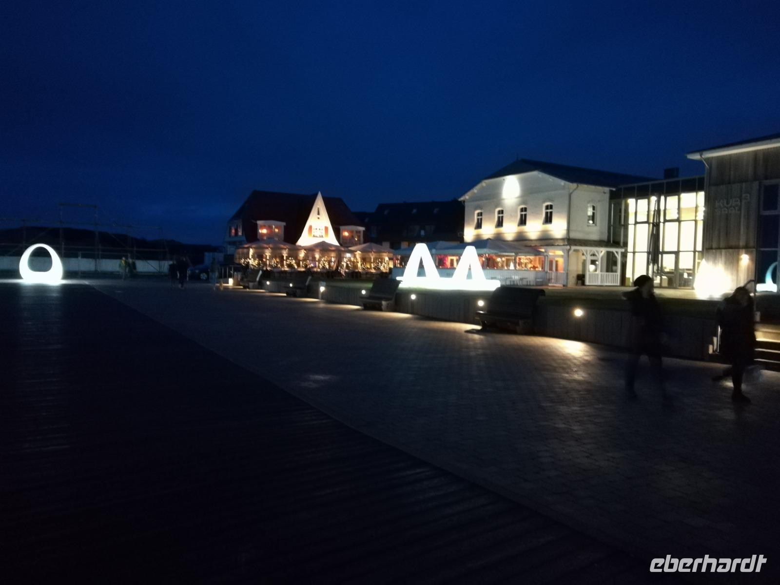 Danach war die Wanderung an der Küste, am Strand vorgesehen, aber flugs zu dem Moment , wo wir aus dem Bus aussteigen wollten, begann es erheblich zu regnen. So entschlossen wir uns, mit Übereinstimmung aller Gäste, zu unserem Hotel zu fahren. Irgendwann hatte der Regen dann nachgelassen, und so konnte jeder individuell am späten Nachmittag den nur 100 m entfernten Strand aufsuchen und durch den, wenn auch nassen, Sand laufen oder den Dünenweg zu einem Spaziergang nutzen. Durch die vielen Lichter in diesem Küstenabschnitt von Wenningstedt, vor allem auch mit dem rotleuchtenden neuen Gosch-Restaurant, war der vorabendliche Spaziergang ein schöner Ausklang unserer Weihnachtsreise auf die Insel Sylt.