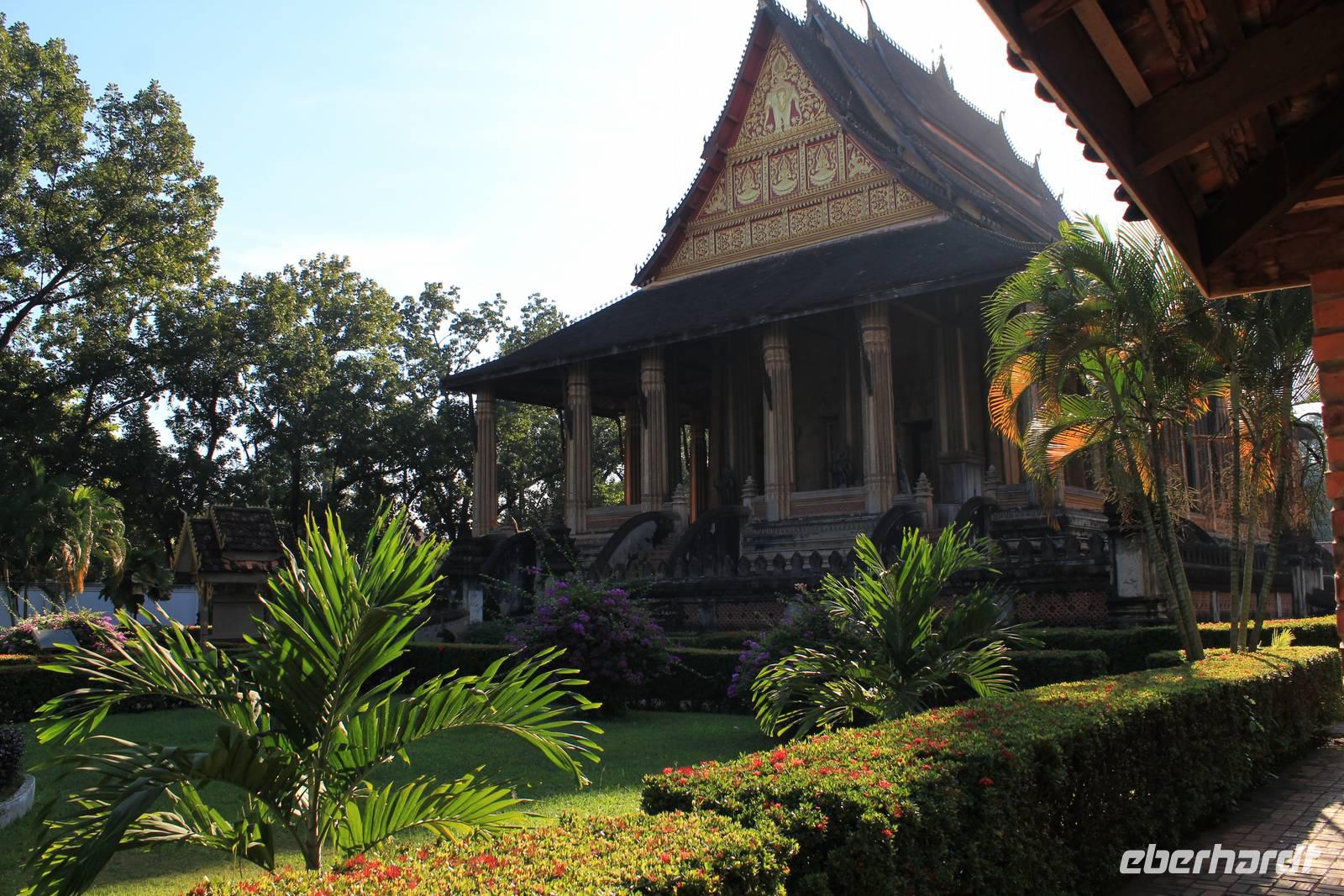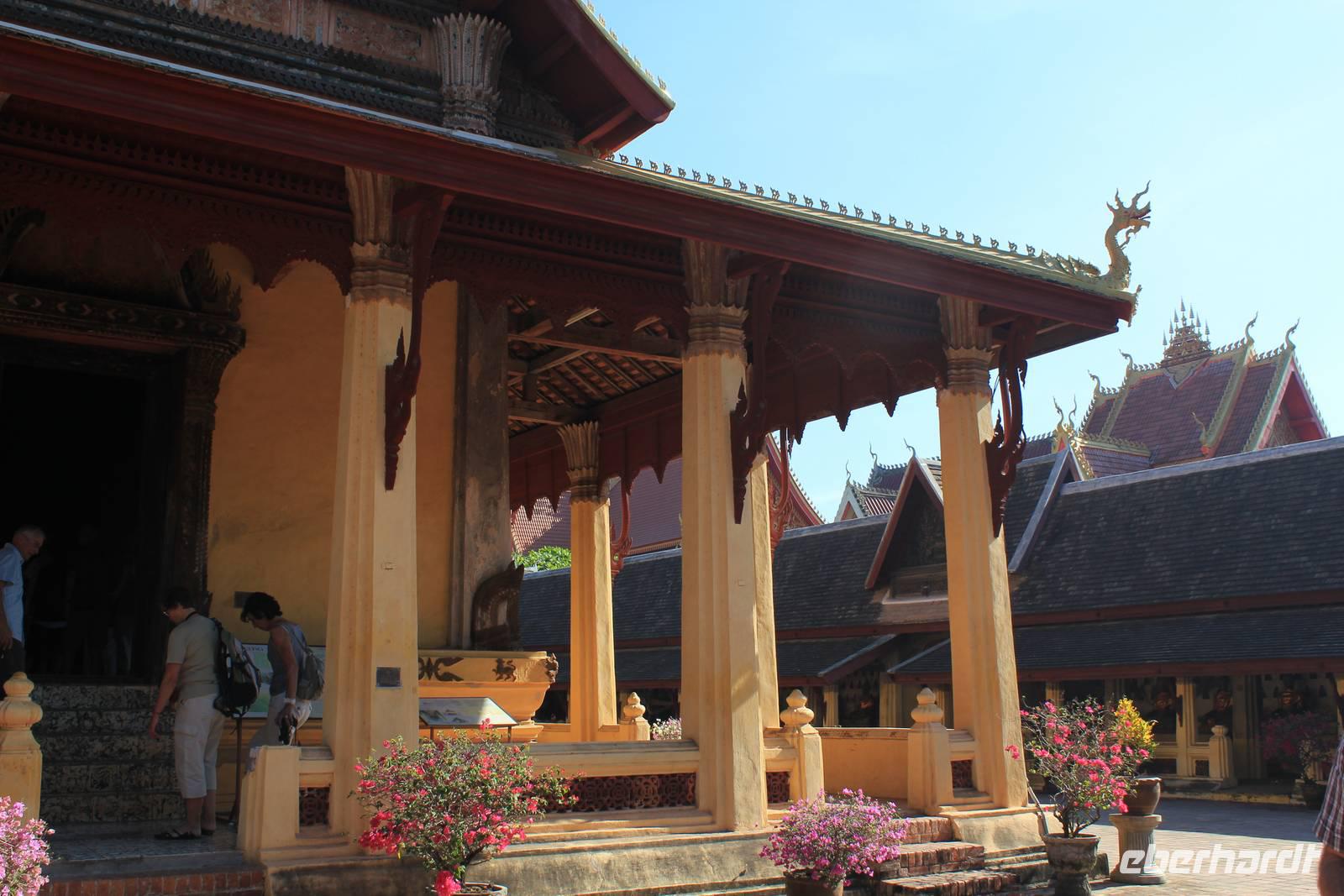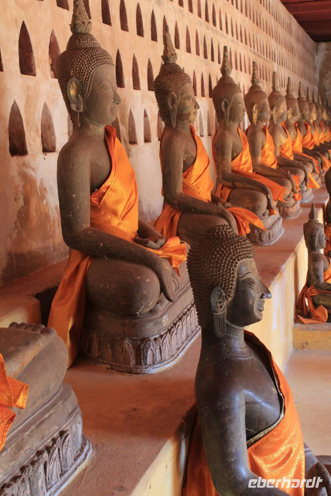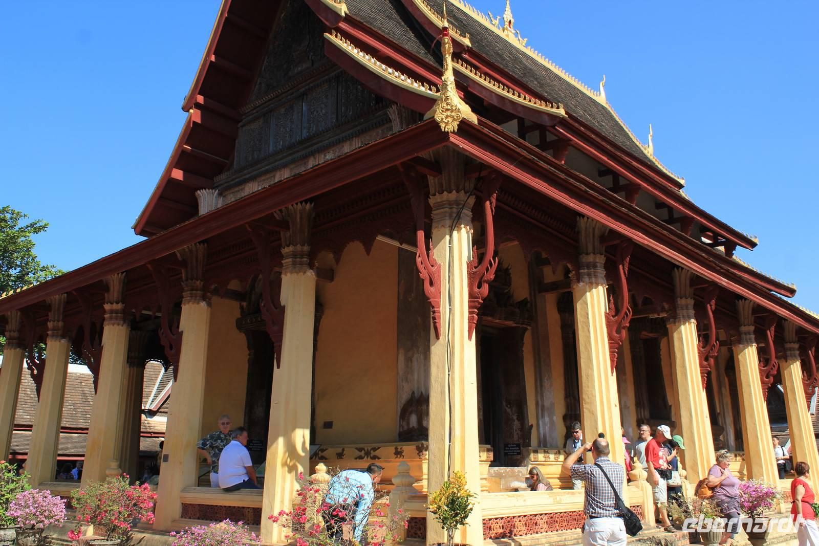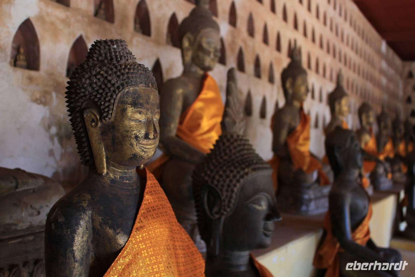 Direkt auf der anderen Straßenseite befindet sich der Wat Si Saket, einzige Tempelanlage der Stadt, die alle Turbulenzen der Vergangenheit unbeschadet überstanden hat. Der damalige König ließ den beeindruckenden Tempel als Ausdruck des erwachenden Nationalstolzes der Laoten im Jahr 1818 errichten. Bevor wir das älteste erhalten gebliebene Heiligtum der Stadt auch von innen besichtigen, staunen wir über die einzigartige Sammlung von Buddha-Statuen verschiedener Stilrichtungen, gefertigt aus Holz, Stein, Silber, Bronze oder Ton, die den Tempel ebenfalls in Form einer Galerie umgibt (über 2.000 Stück). Der Tempel in der Mitte, mit seinem verzierten 5-stufigen Dach wurde im siamesischen Stil des Buddhismus, anstatt im laotischen Stil errichtet.