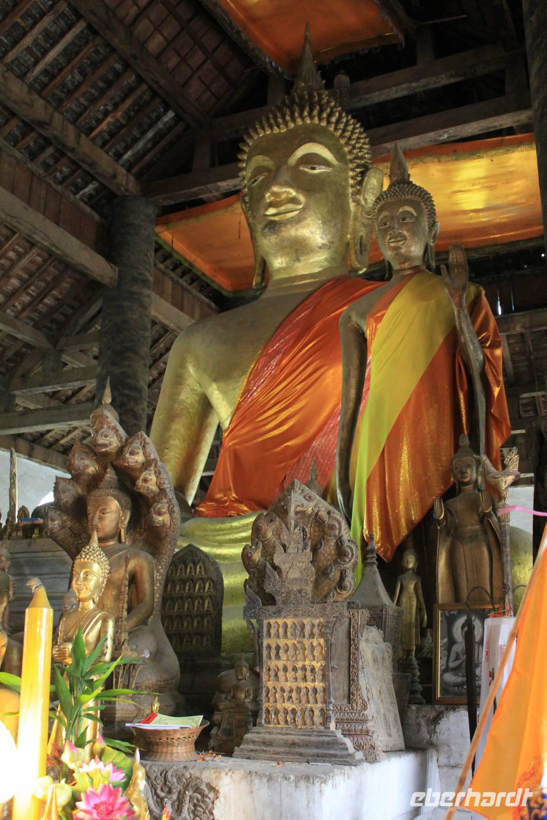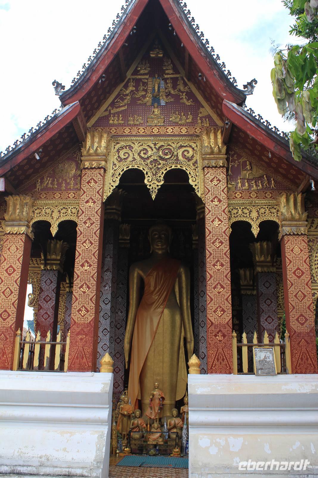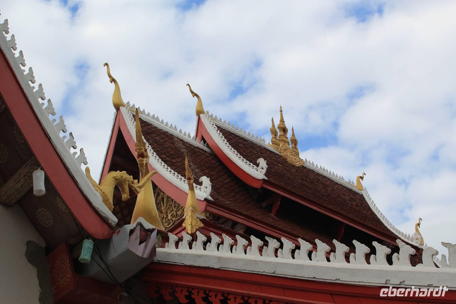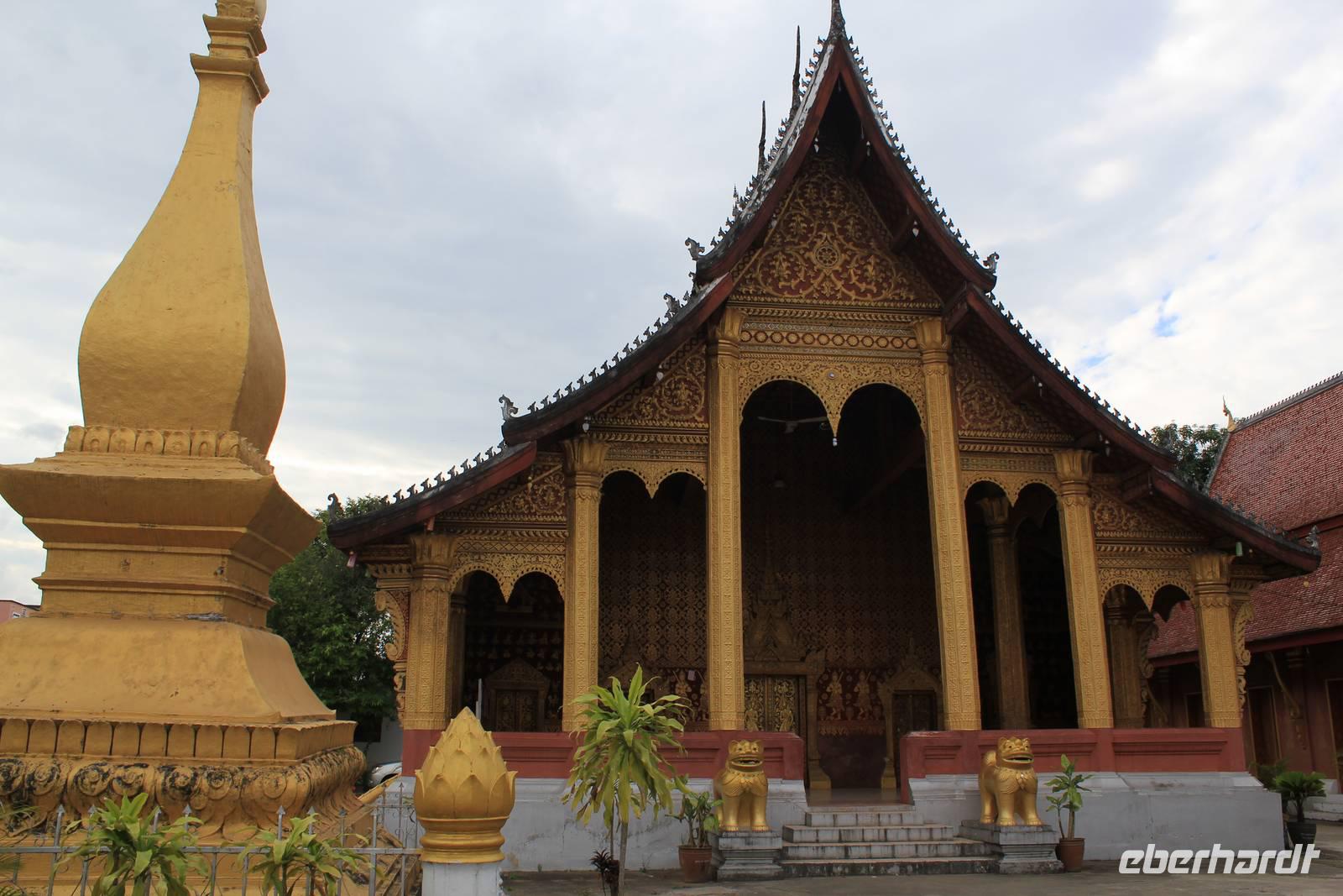 Nach einer kleinen Mittagspause in einem französischen Café schauen wir uns den Tempel Wat Sene, mit seiner riesigen vergoldeten Buddha-Statue genauer an. Dieser wird von zwei goldenen Löwen bewacht und besticht vor allem mit seinen kunstvollen Reliefschnitzereien an den Giebeln und den Tür- und Fensterflügeln.