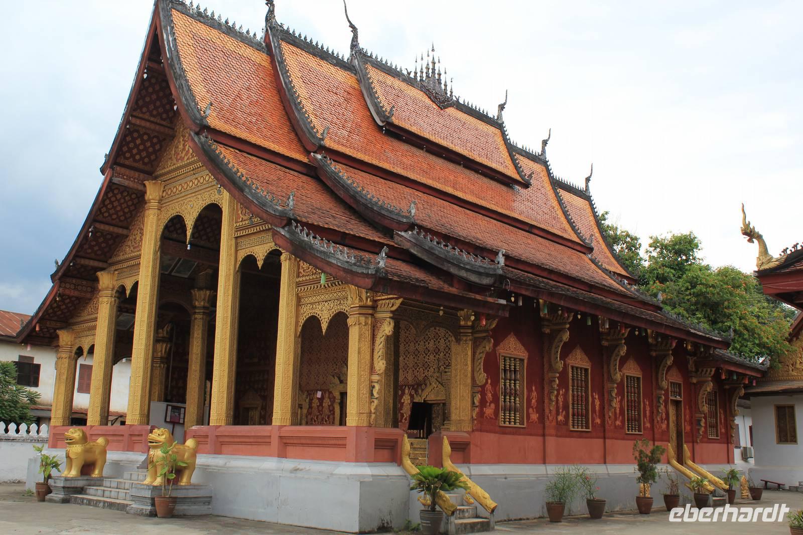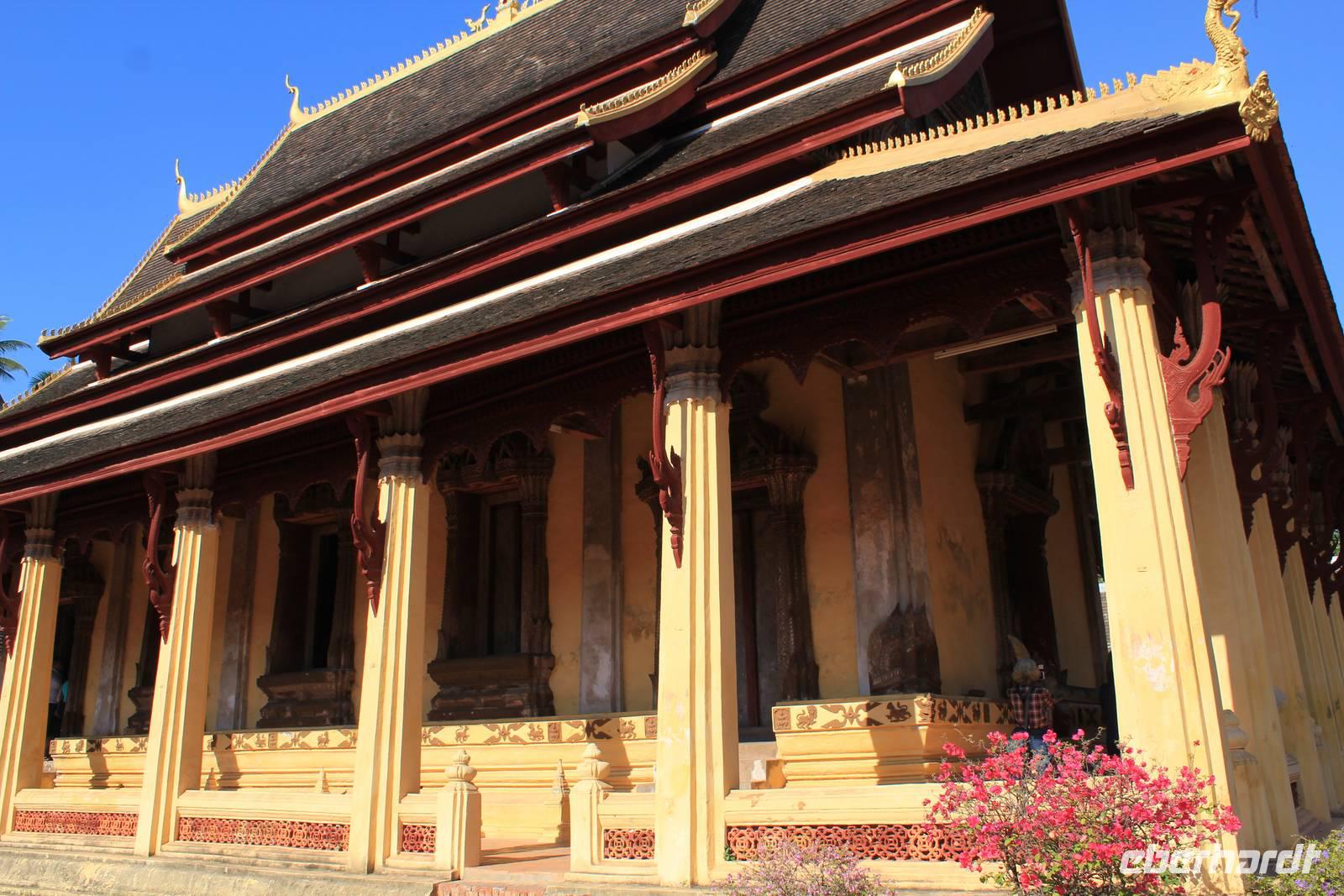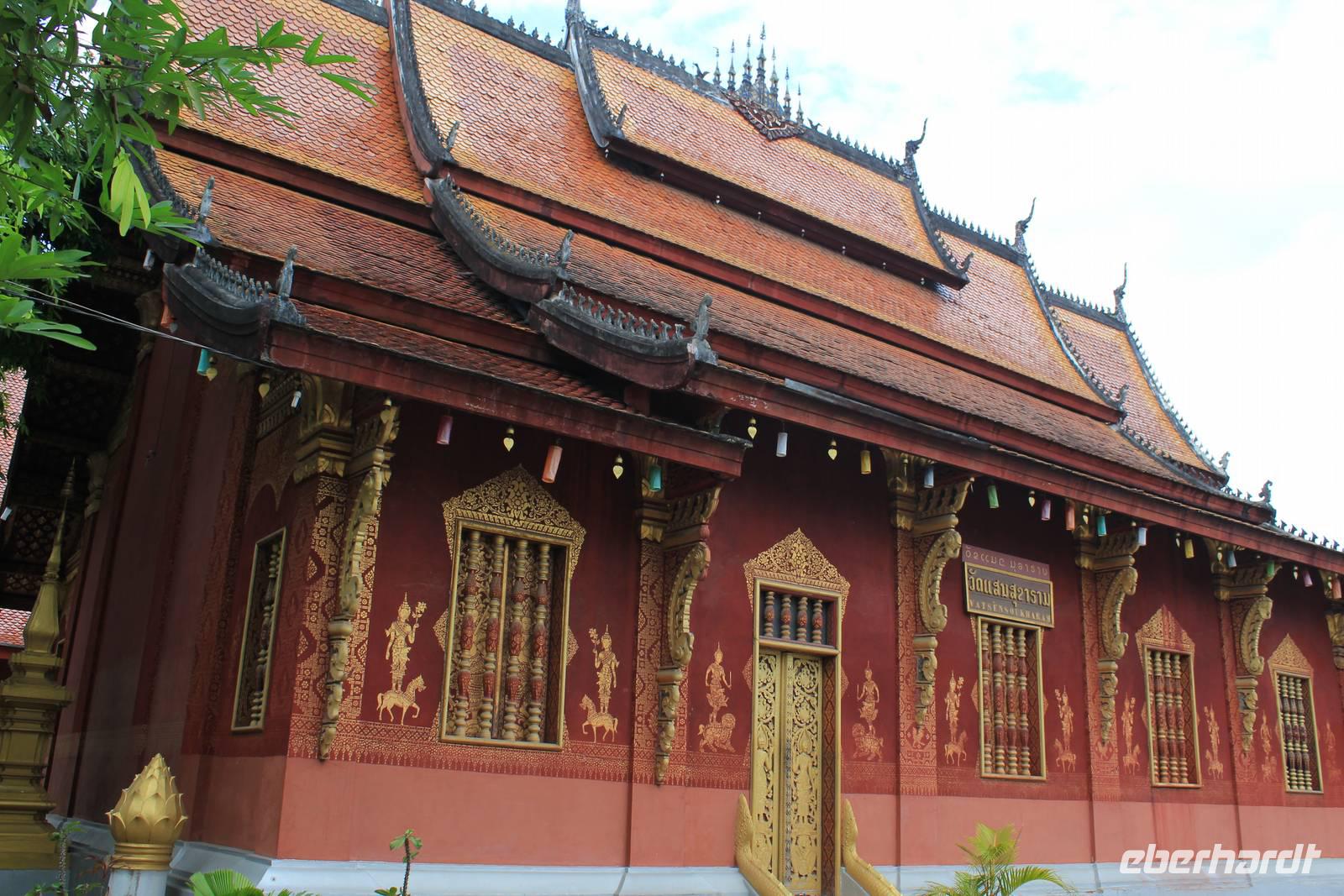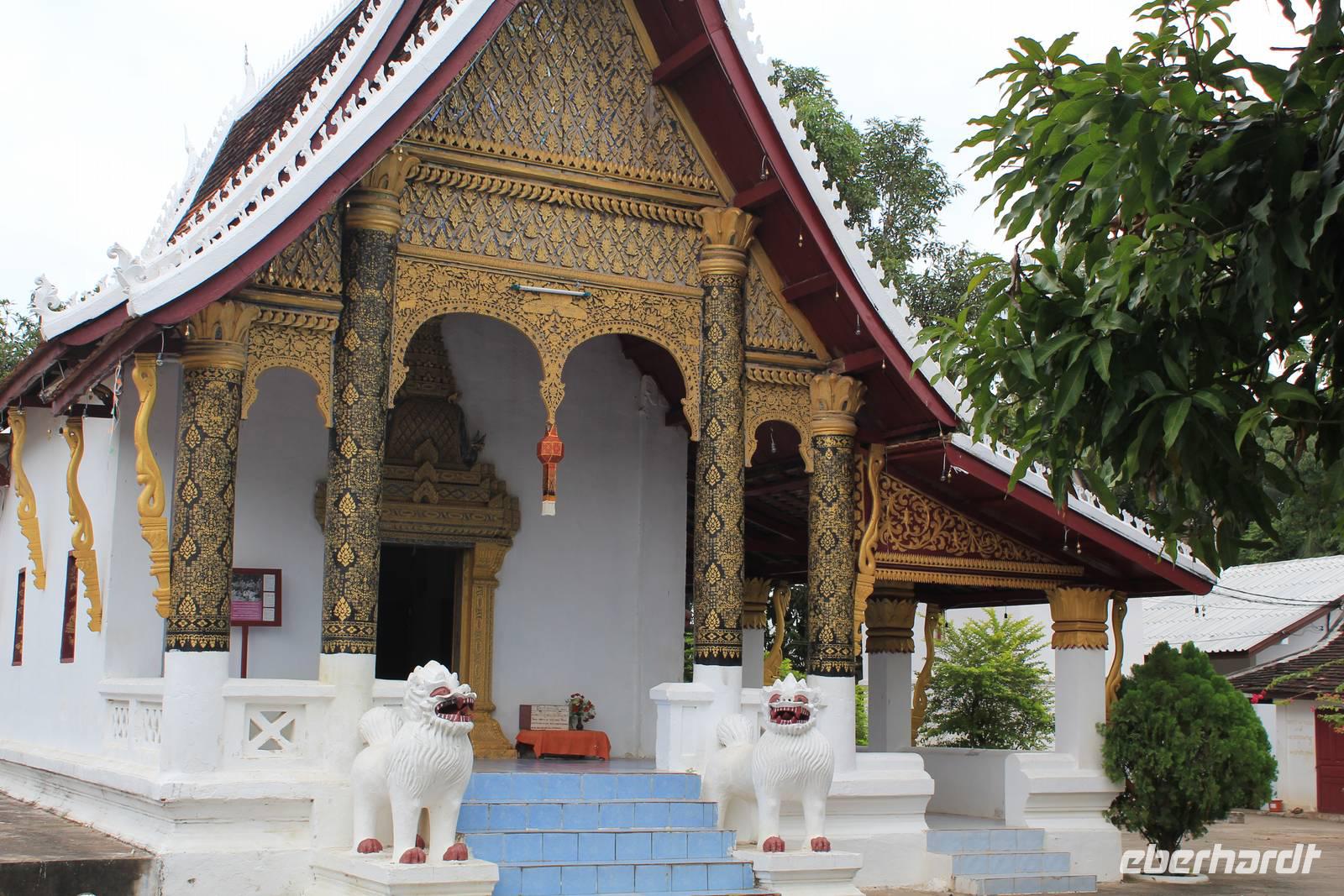 Nach einer kleinen Mittagspause in einem französischen Café schauen wir uns den Tempel Wat Sene, mit seiner riesigen vergoldeten Buddha-Statue genauer an. Dieser wird von zwei goldenen Löwen bewacht und besticht vor allem mit seinen kunstvollen Reliefschnitzereien an den Giebeln und den Tür- und Fensterflügeln.