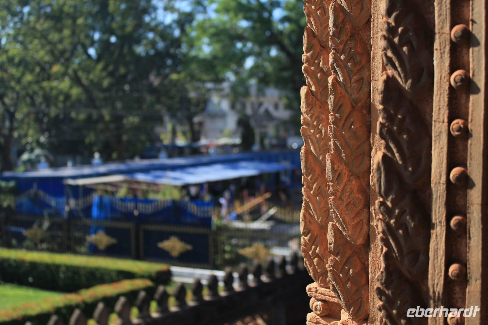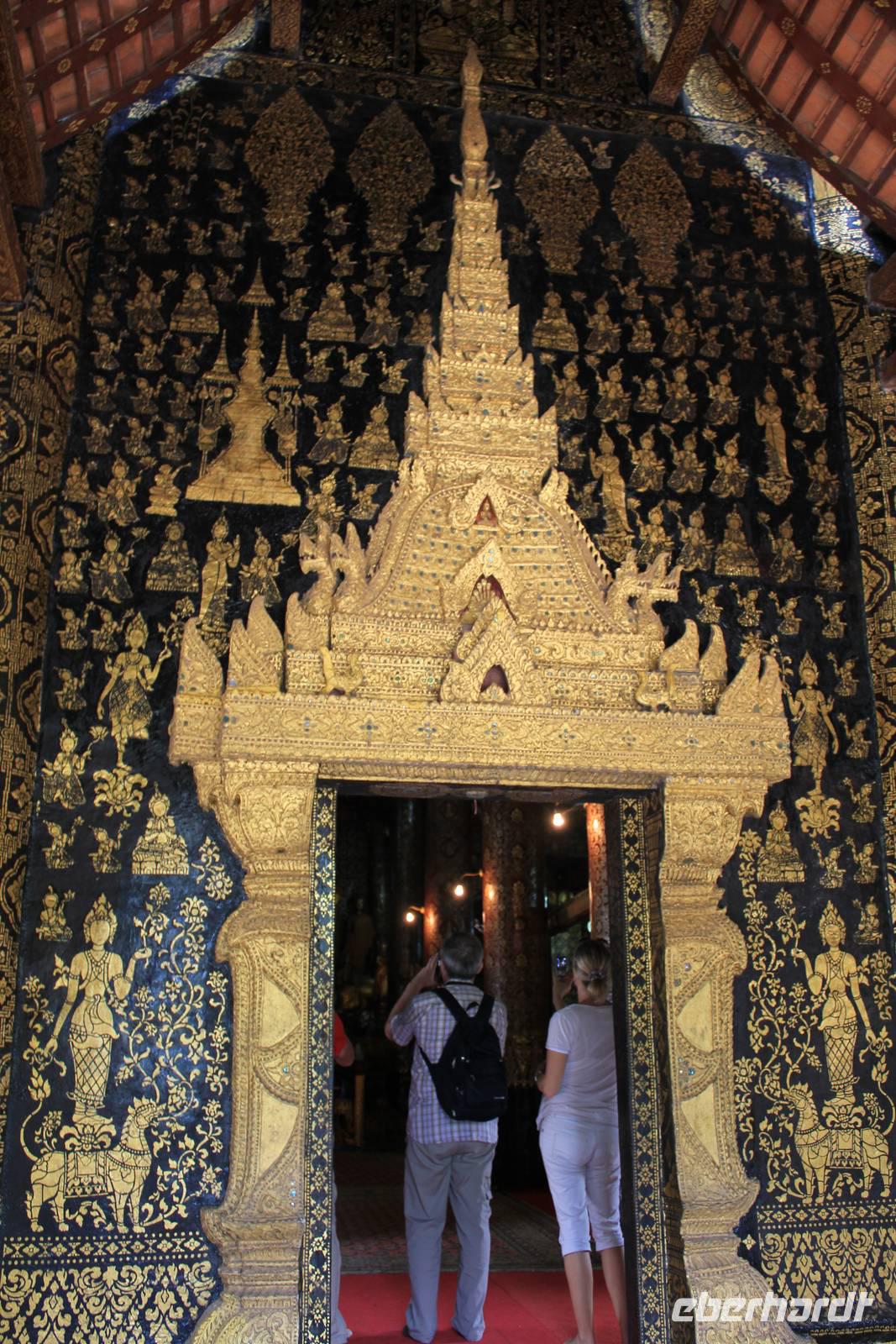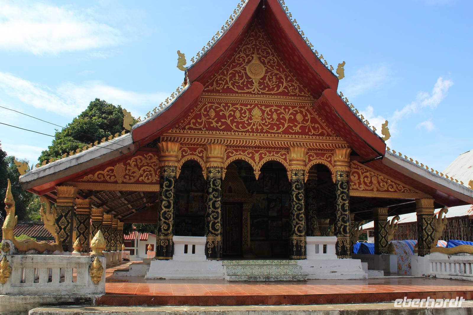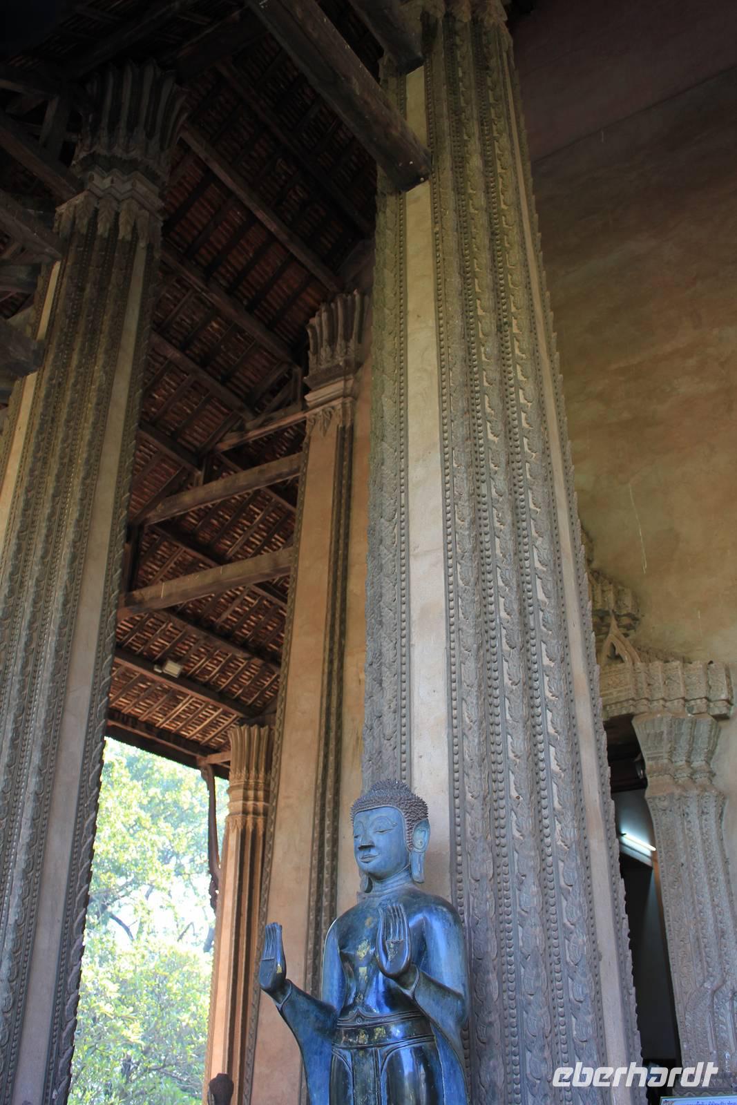 Nach einer kleinen Mittagspause in einem französischen Café schauen wir uns den Tempel Wat Sene, mit seiner riesigen vergoldeten Buddha-Statue genauer an. Dieser wird von zwei goldenen Löwen bewacht und besticht vor allem mit seinen kunstvollen Reliefschnitzereien an den Giebeln und den Tür- und Fensterflügeln.