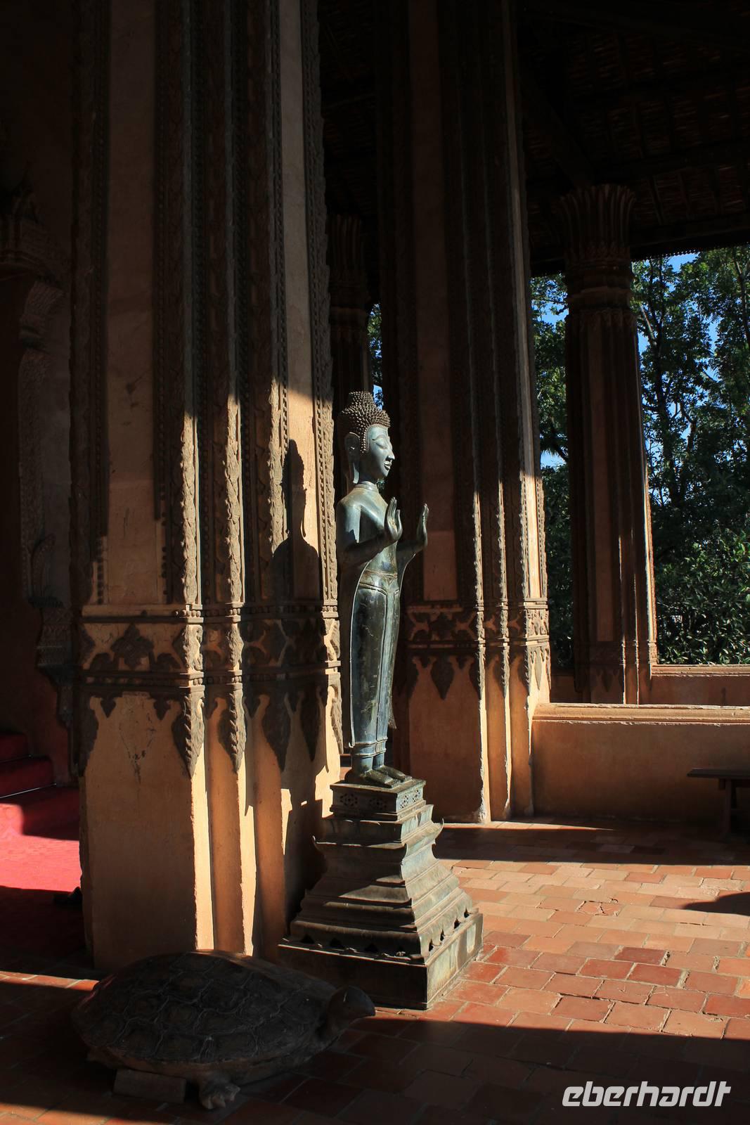Ausgeschlafen und mit neuer Energie starten wir heute in den Tag und wollen zunächst die Hauptstadt Vientiane bei einer Stadtrundfahrt näher kennenlernen. Unser erstes Ziel ist der Wat Ho Phra Keo, der als einstiger Wohnsitz des Smaragd-Buddhas (= Phra Keo) errichtet wurde, welchen König Setthathirath während seiner Regentschaft aus Chiang Mai mitbrachte. Heute aber thront die kleine berühmte Statue aus grüner Jade als Nationalheiligtum der thailändischen Buddhisten in Bangkok. Wir treffen auf die in morgendlich warmes Sonnenlicht getauchte, mit prachtvollen Stuckarbeiten und Holzschnitzereien verzierte Pagode und lassen uns von Yang so einiges über die Lehre des Buddhismus und die Bedeutung der einzelnen Buddha-Statuen in verschiedensten Positionen erklären. Außerdem bewundern wir die den Tempel in Form eines Wandelganges umgebende Skulpturengalerie und im Inneren finden wir die nationalen Kunstschätze vergangener Zeiten vor.