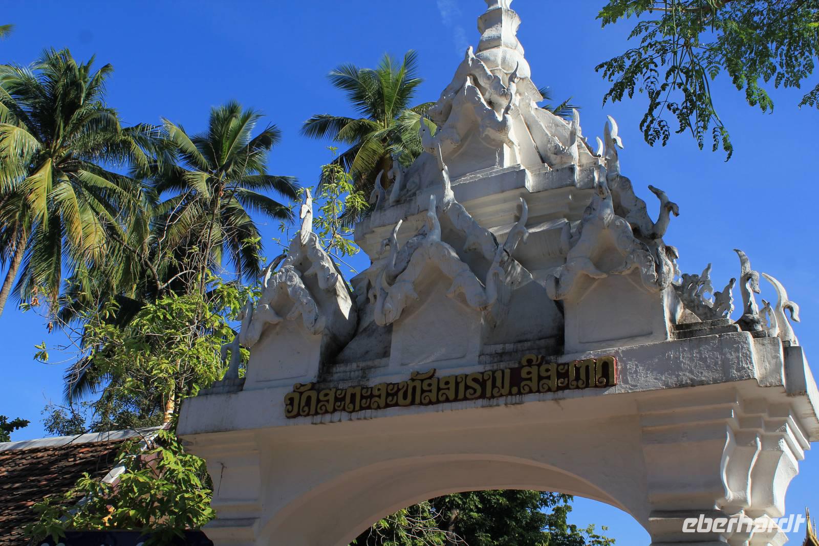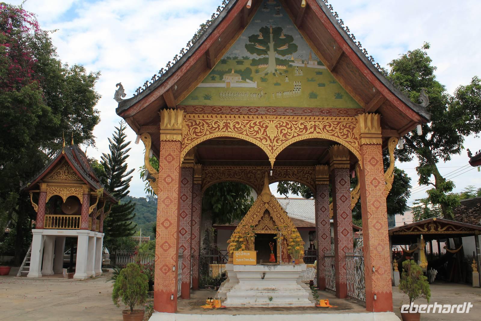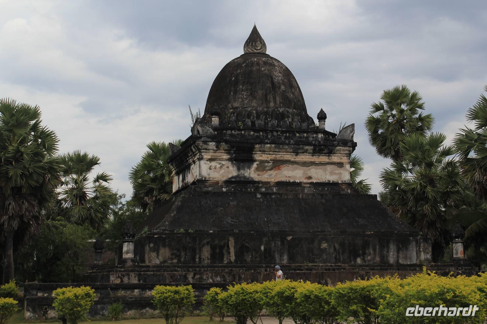 Mit dem „Riesen-Tuk-Tuk" geht es ein paar Meter weiter zum Wat May, einer der größten und schönsten Sakralbauten der Stadt. Direkt gegenüber dem ehemaligen Königspalast, beherbergte er einst die Buddha-Statue Pha Bang, das Nationalheiligtum von Laos. Letzter Tempel für heute soll der Wat Visounarath sein, dessen Inneres mit hunderten kleinen und großen Buddha-Statuen geschmückt ist. Hier sehen wir am Eingang auch einen Bodi-Baum, unter dem einst Sirtharta Gautama, später Buddha genannt, die Erleuchtung erlangte. Unter ihm thront die „Mutter Gottes" - „Thorani", die von den Menschen um mehr Wasser angebetet wird, wenn es zu trocken im Lande ist. Auf dem Gelände befindet sich weiterhin der massive That Mak Mo oder auch Wassermelonen-Stupa genannt, aus dem Jahr 1914.