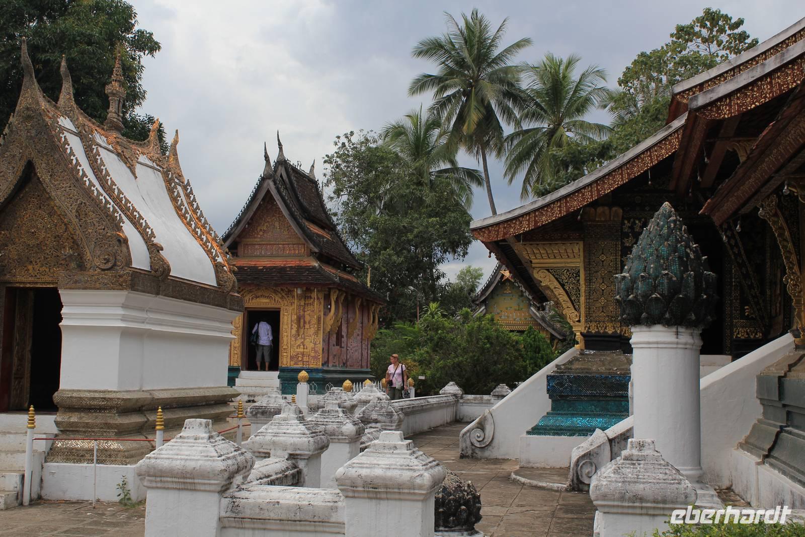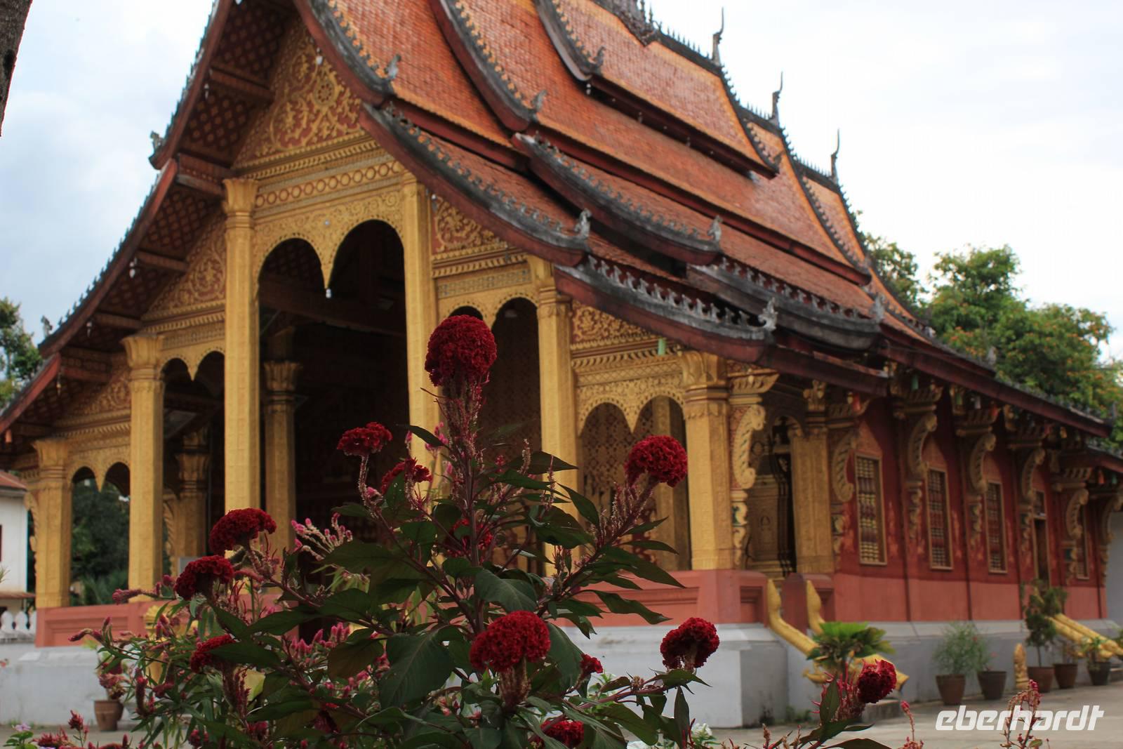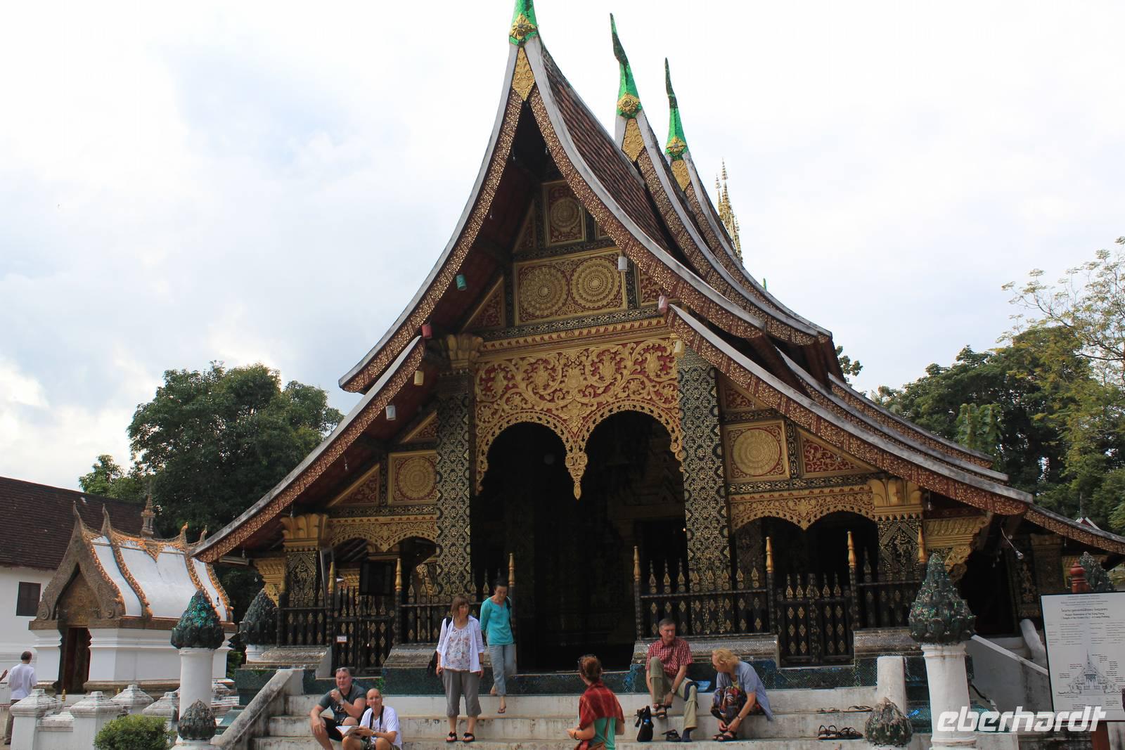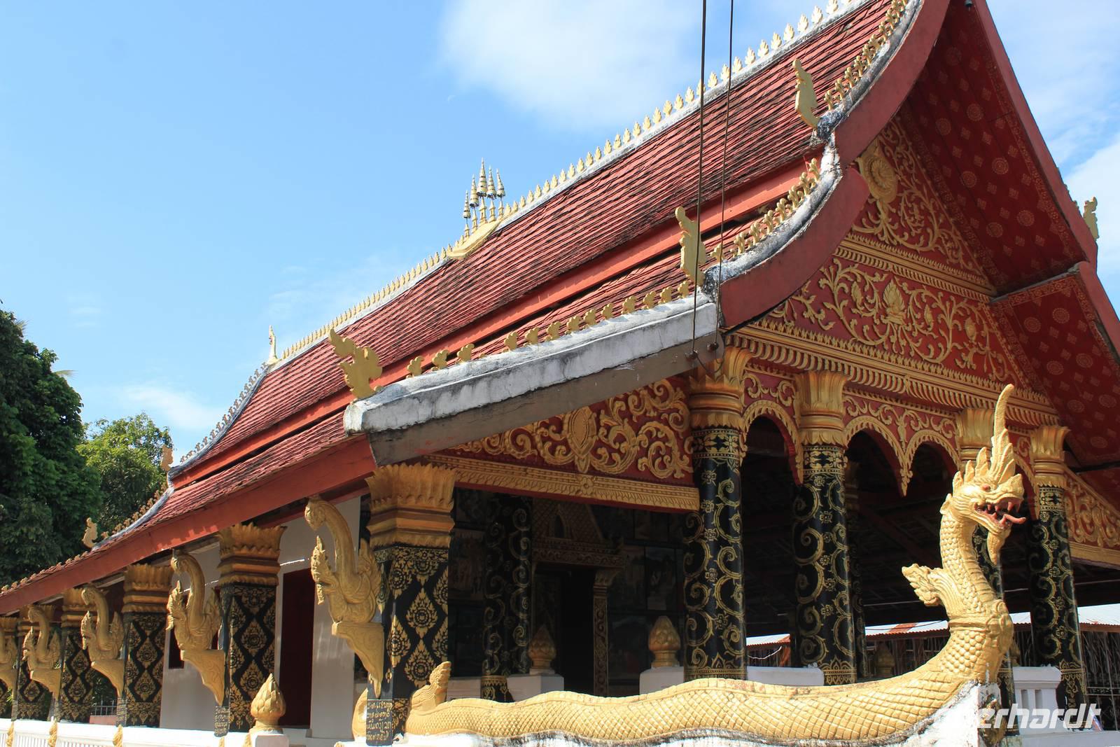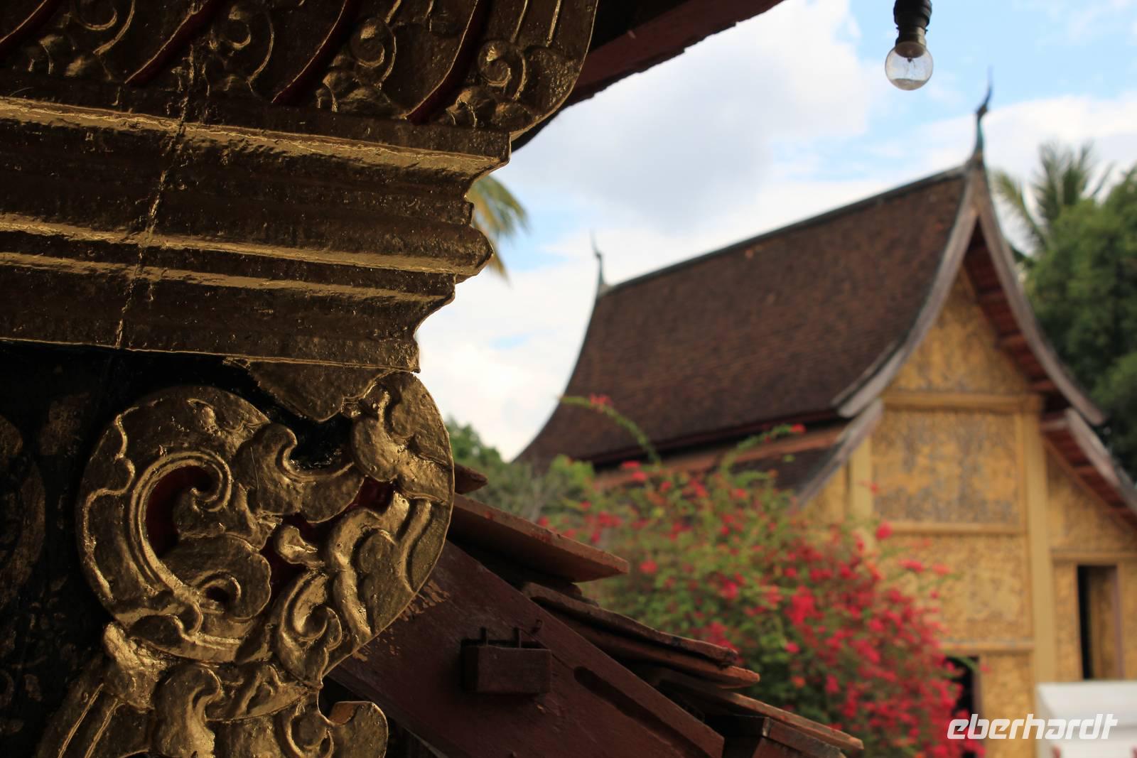 Kurz vor unserem Ziel, dem Wat Xieng Thong, stärken wir uns noch mit einer frischen Kokosnuss und dann kann der Tempelmarathon beginnen! Der „goldene Stadttempel" liegt herrlich oberhalb des Zusammenflusses von Mekong und Nam Khan und beeindruckt uns vor allem mit seiner kühn geschwungenen Dachkonstruktion! Sehr elegant wirkend, mit bunt glänzenden Ziegeldächern ist er ein tolles Beispiel der Architekturkunst des laotischen Nordens. Matt leuchten das Gold der holzgeschnitzten Giebel und das Rot der Tempelsäulen in der Sonne und umringt ist die Pagode von Kapellen mit Buddha-Statuen, einer Geistertrommel, einem goldenen achteckigen Stupa und dem Wohngebäude der Mönche.