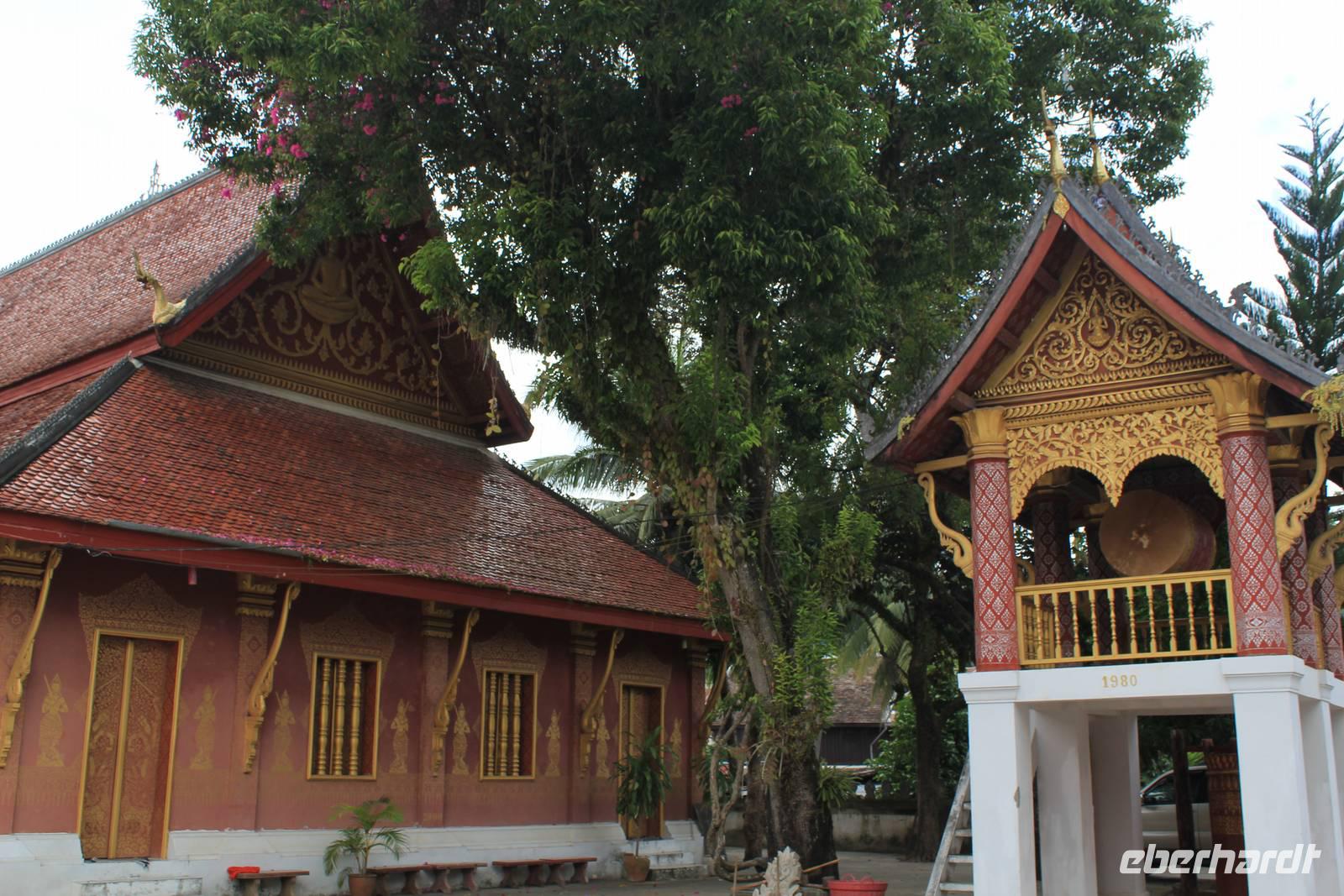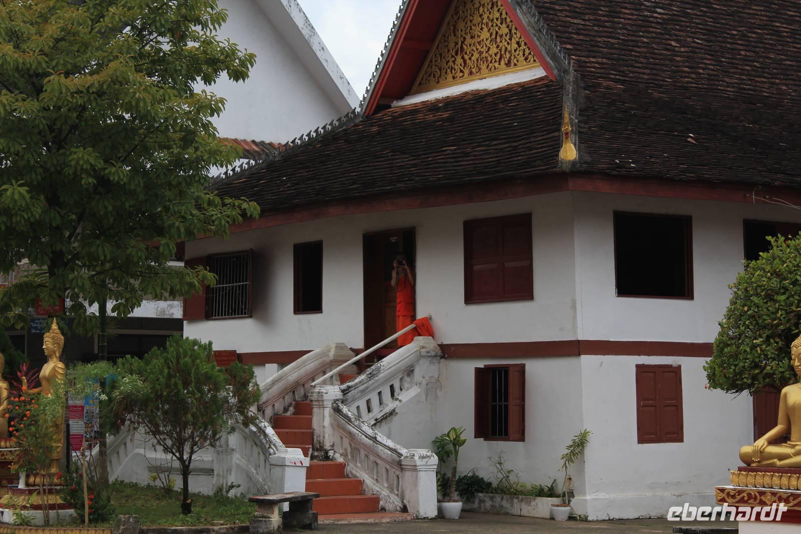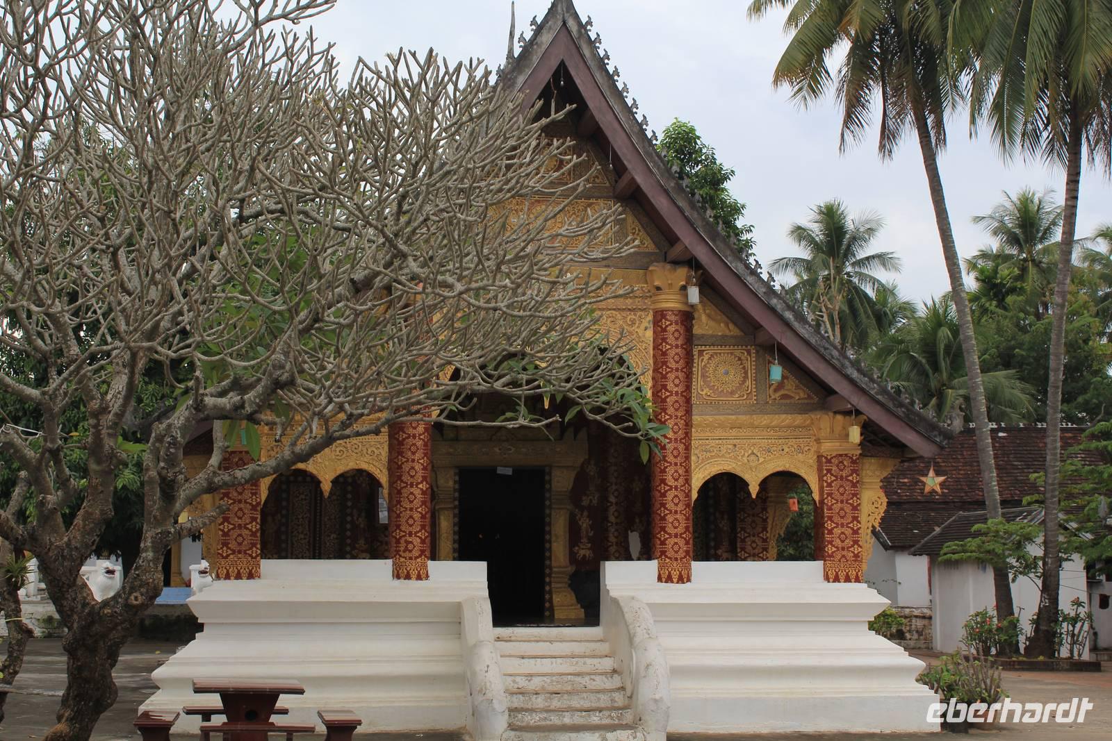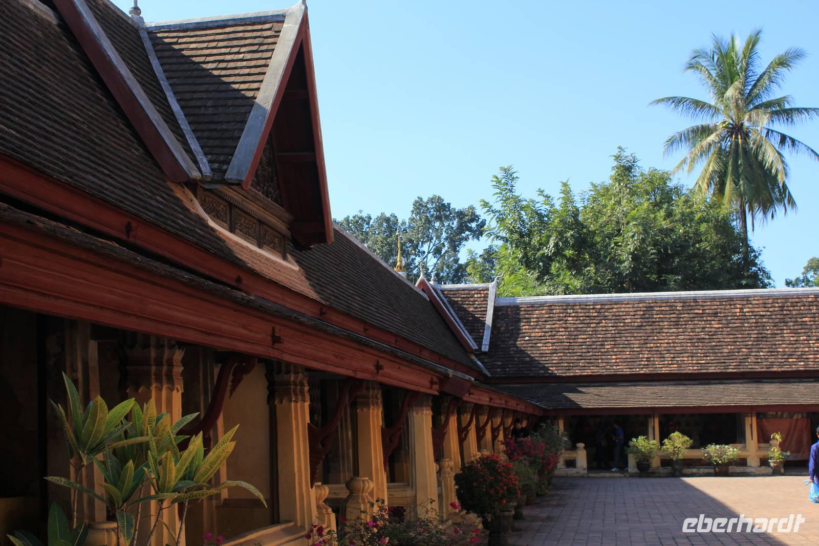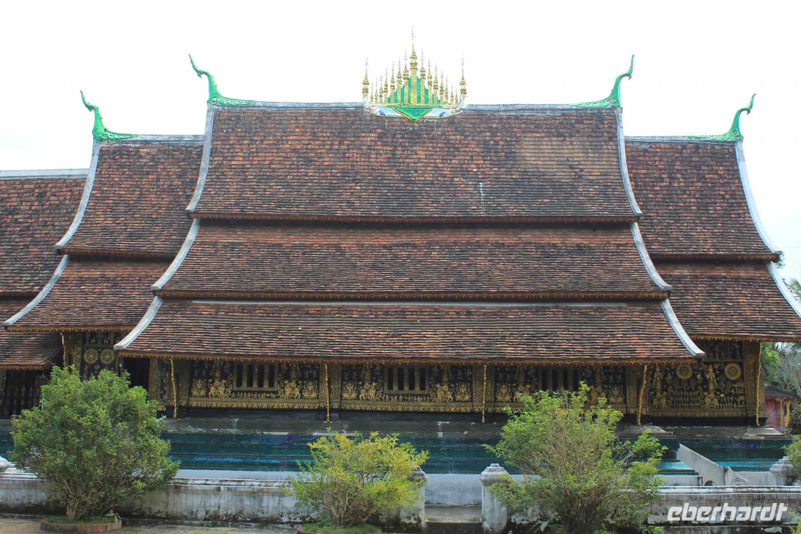 Kurz vor unserem Ziel, dem Wat Xieng Thong, stärken wir uns noch mit einer frischen Kokosnuss und dann kann der Tempelmarathon beginnen! Der „goldene Stadttempel" liegt herrlich oberhalb des Zusammenflusses von Mekong und Nam Khan und beeindruckt uns vor allem mit seiner kühn geschwungenen Dachkonstruktion! Sehr elegant wirkend, mit bunt glänzenden Ziegeldächern ist er ein tolles Beispiel der Architekturkunst des laotischen Nordens. Matt leuchten das Gold der holzgeschnitzten Giebel und das Rot der Tempelsäulen in der Sonne und umringt ist die Pagode von Kapellen mit Buddha-Statuen, einer Geistertrommel, einem goldenen achteckigen Stupa und dem Wohngebäude der Mönche.