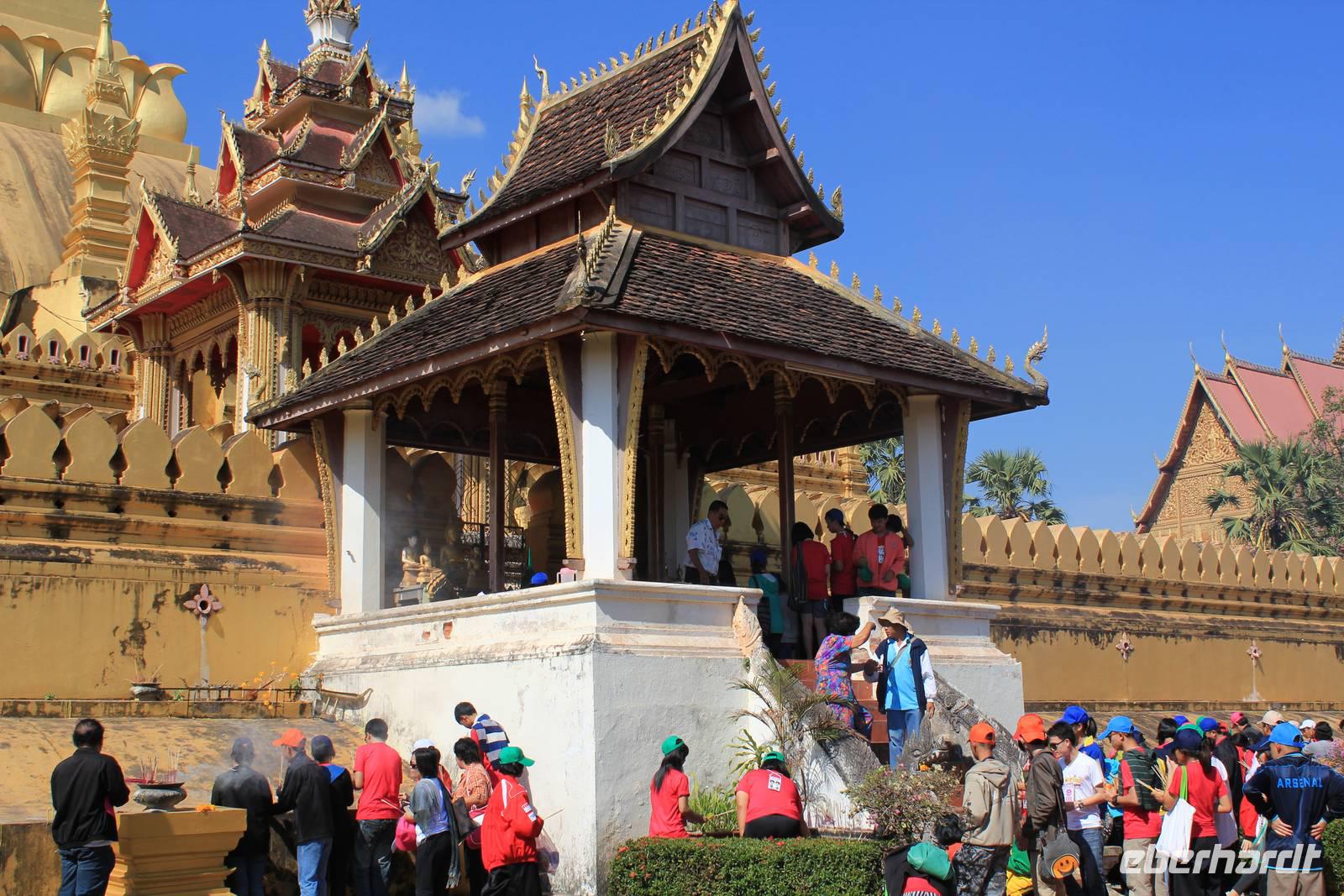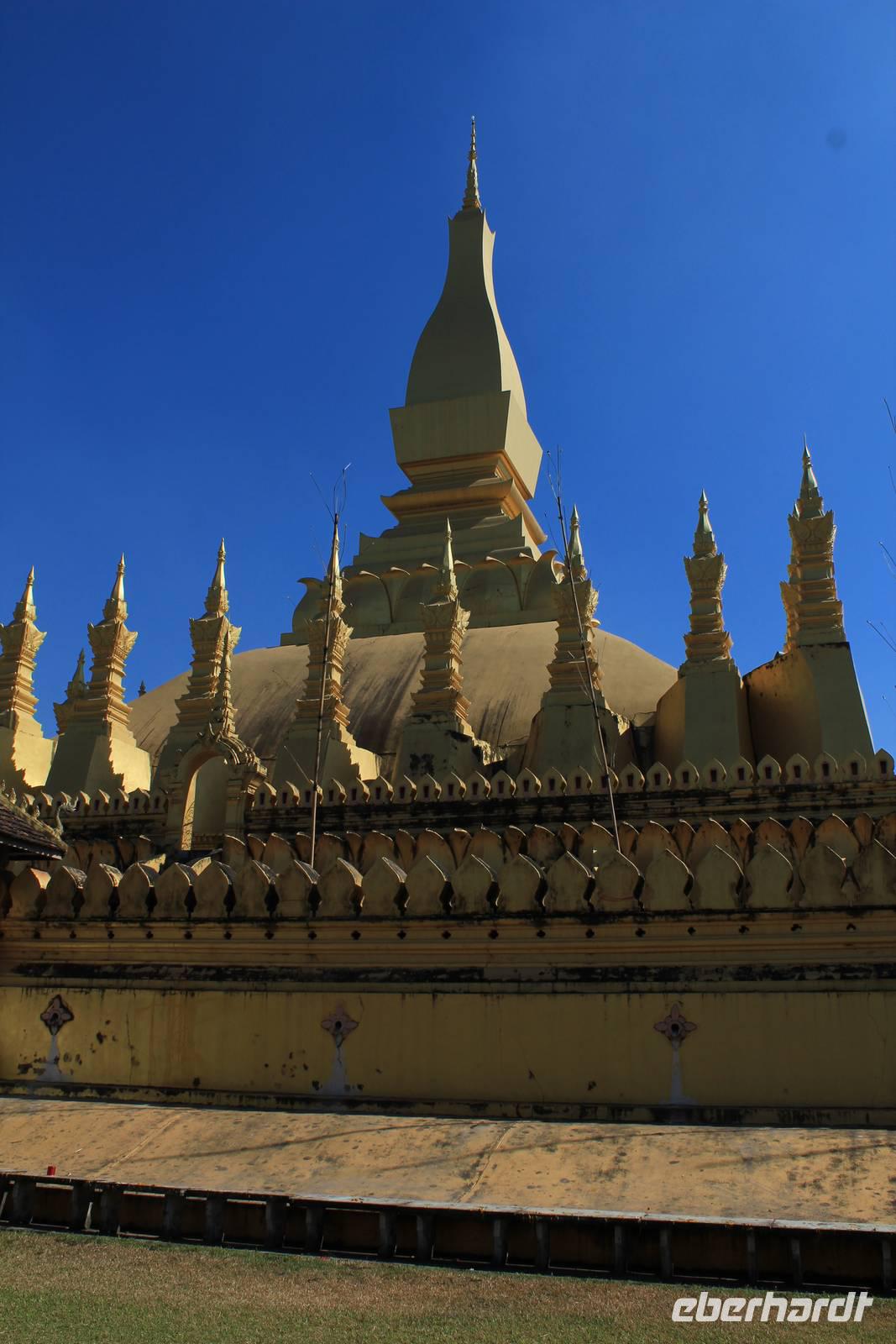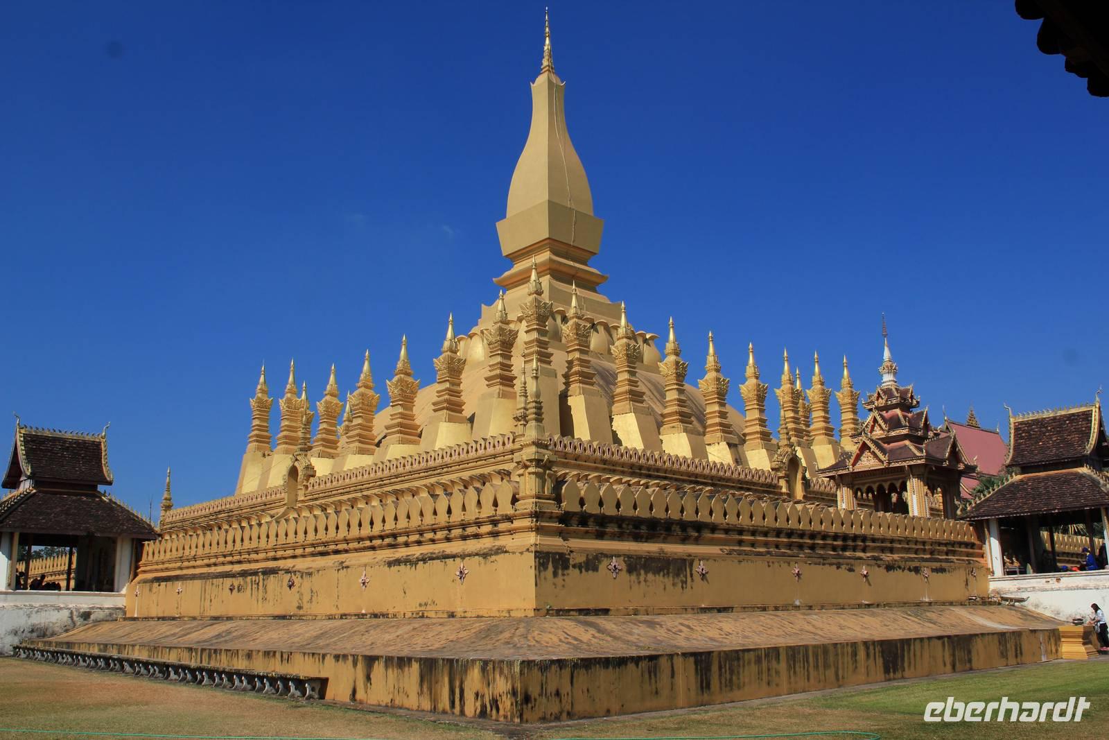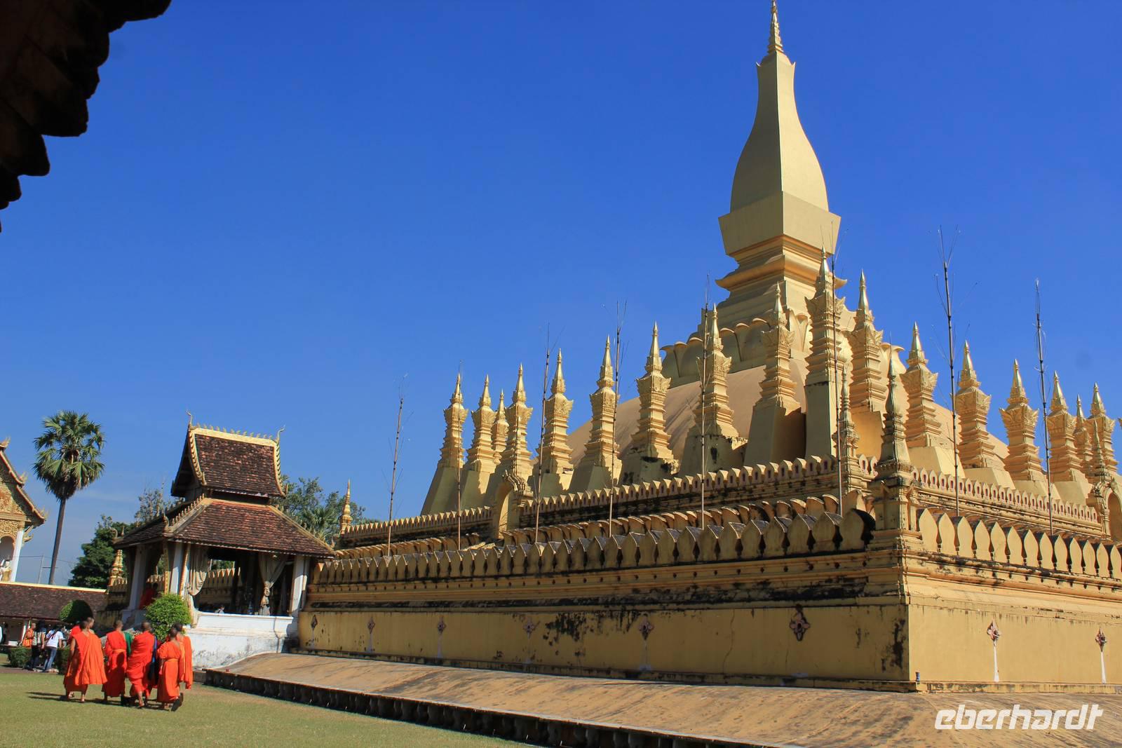 Es geht nun ein paar Kilometer raus aus dem Stadtzentrum, zum That Luang Stupa. Das aus dem 3. Jh. stammende Nationalmonument ist sogar im Staatswappen abgebildet und ist seit Menschengedenken eine der bedeutendsten buddhistischen Pilgerstätten von Laos. Auch wir sehen bei unserem Besuch Mönche und andere Gläubige mit Räucherstäbchen, Studentenblumen und gefalteten Händen betend am Fuße der heiligen Stätte. Gold schimmernd hebt sich die Spitze der Stupa über die Ebene und nach jedem Torbogen, den wir bei unserem Spaziergang um das Nationalsymbol durchqueren, bietet sich uns ein neues herrliches Fotomotiv.