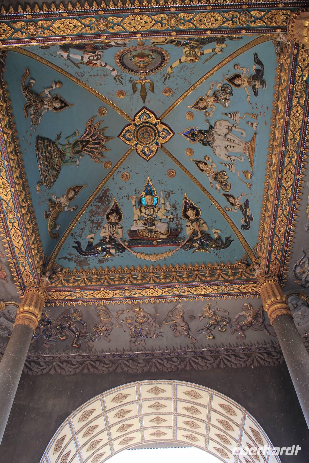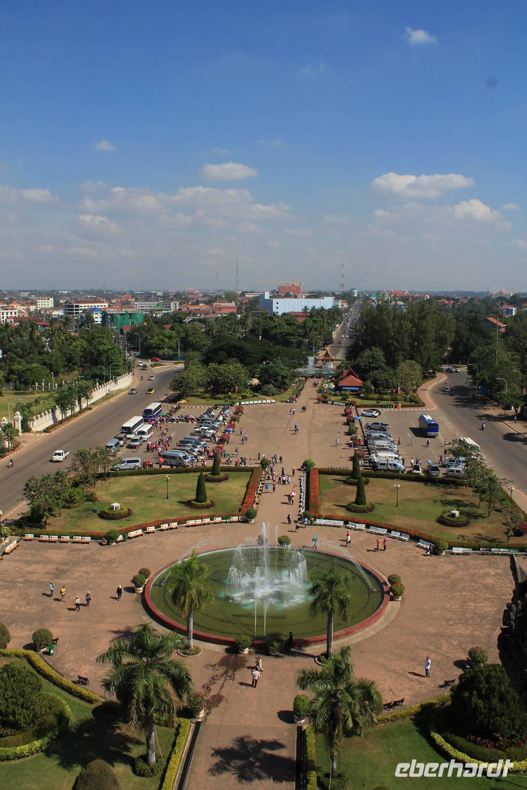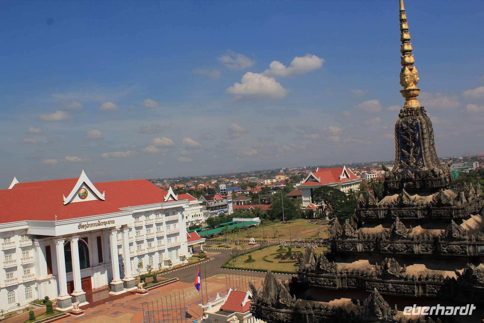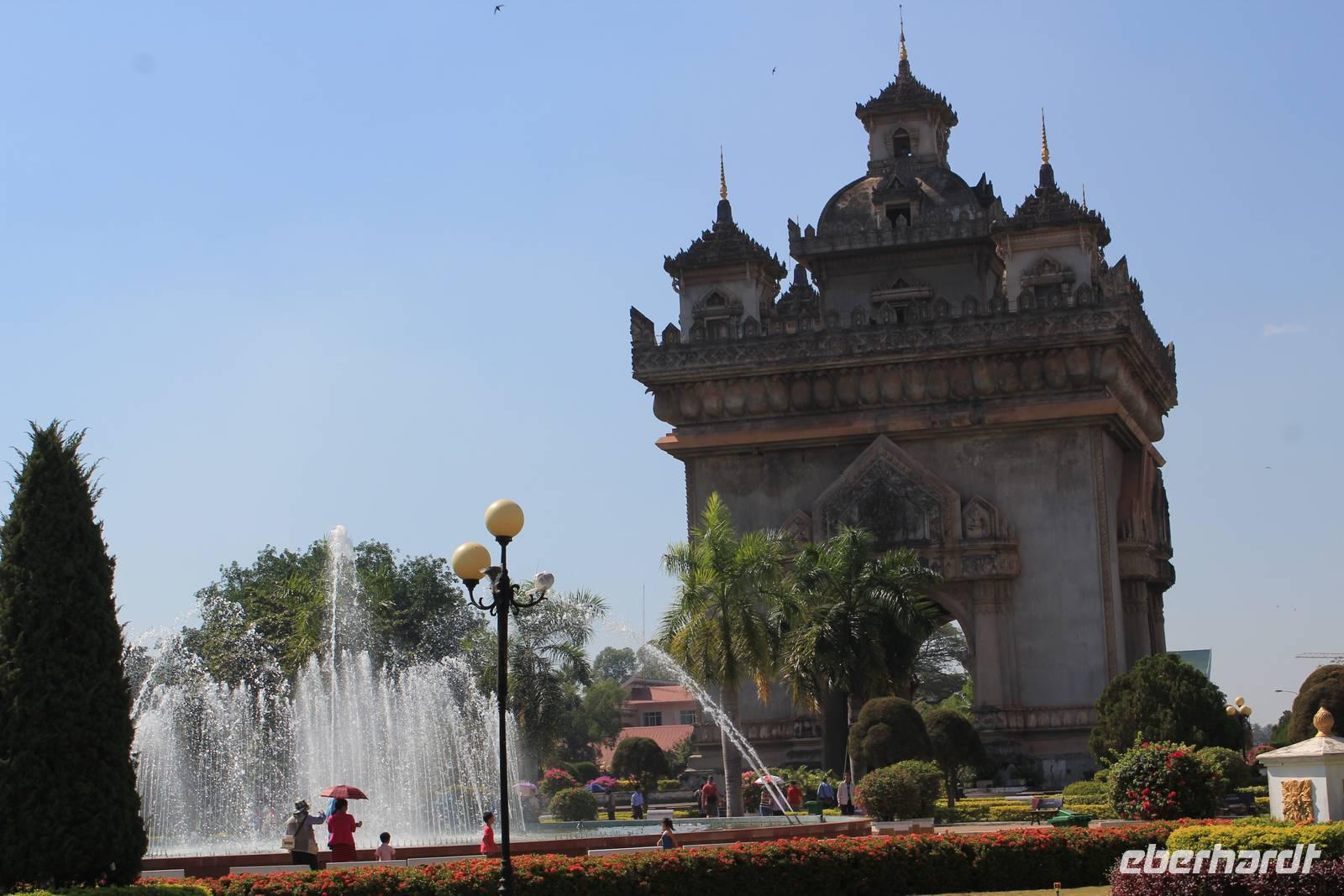 Unser 4. Stopp in Vientiane gilt dem imposanten Monument Phatu Xay, dem Siegertor, das zu Ehren der Gefallenen beim Unabhängigkeitskrieg gegen Frankreich 1949 erbaut wurde. Der Triumphbogen erinnert tatsächlich an sein Vorbild in Paris, ist jedoch mit Elefantenköpfen und pagodenartigen Türmchen verziert. Durch das Treppenhaus („ist gut für den...Allerwertesten") steigen wir in die Höhe und lassen den Blick über die Stadt, bis hin zum Mekong schweifen. Ein großartiger Rundumblick bei inzwischen 35 Grad!