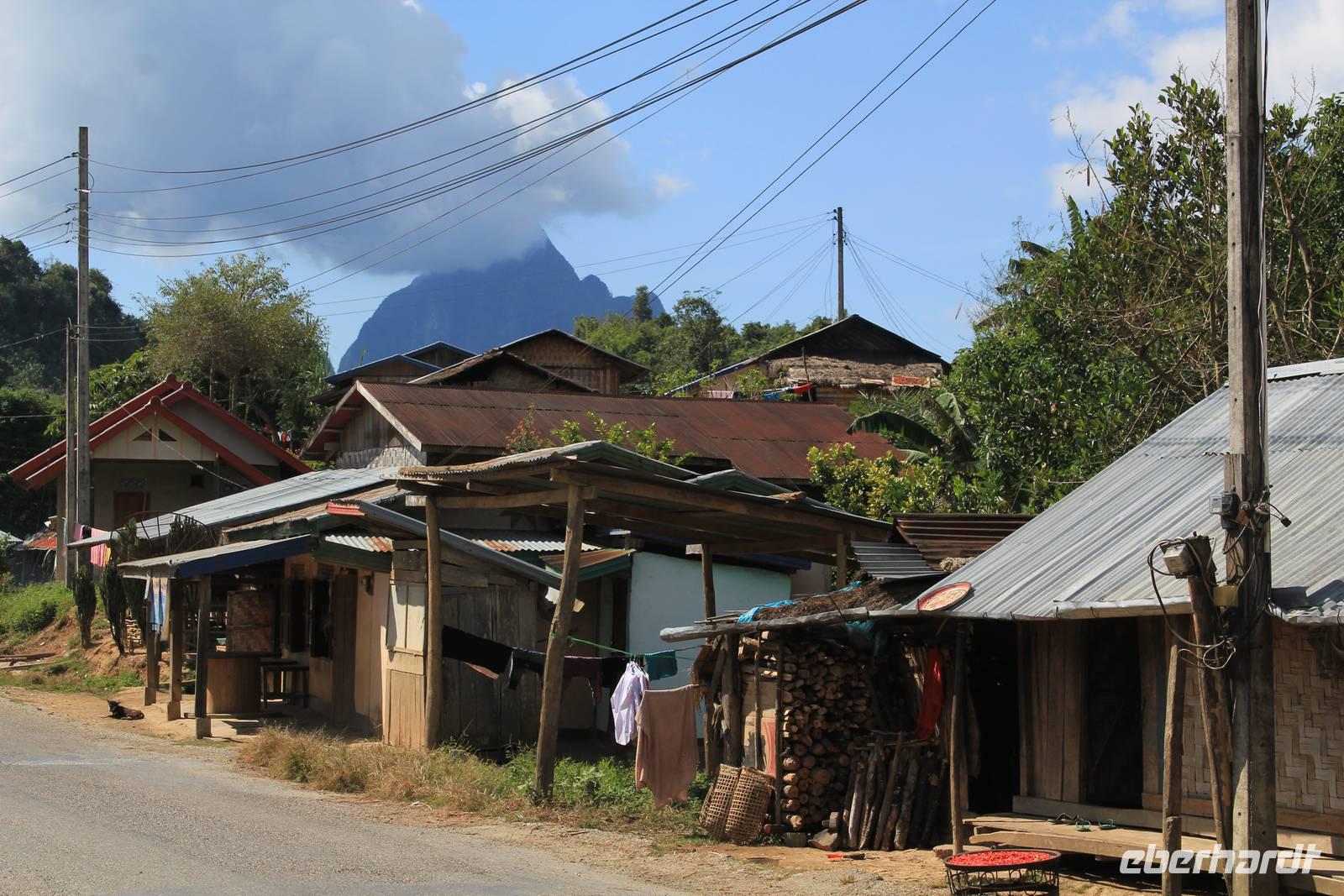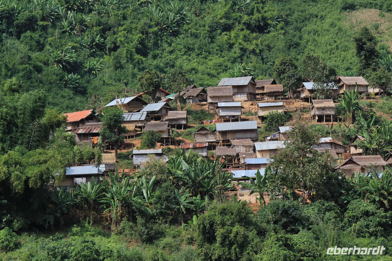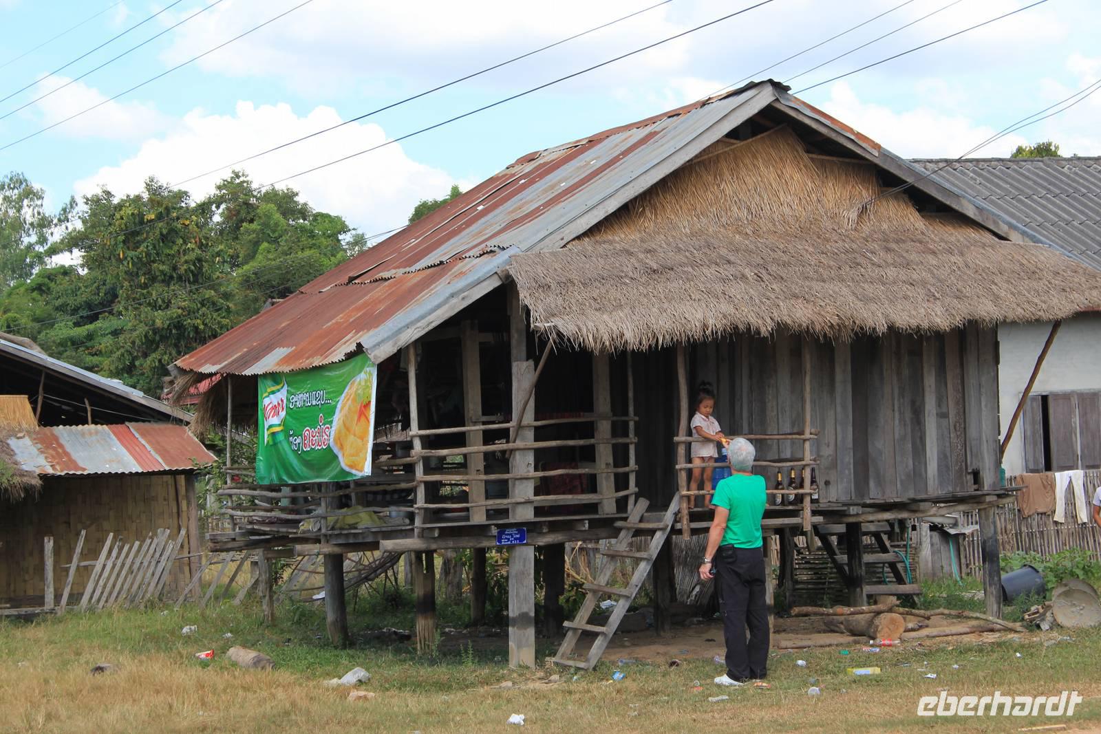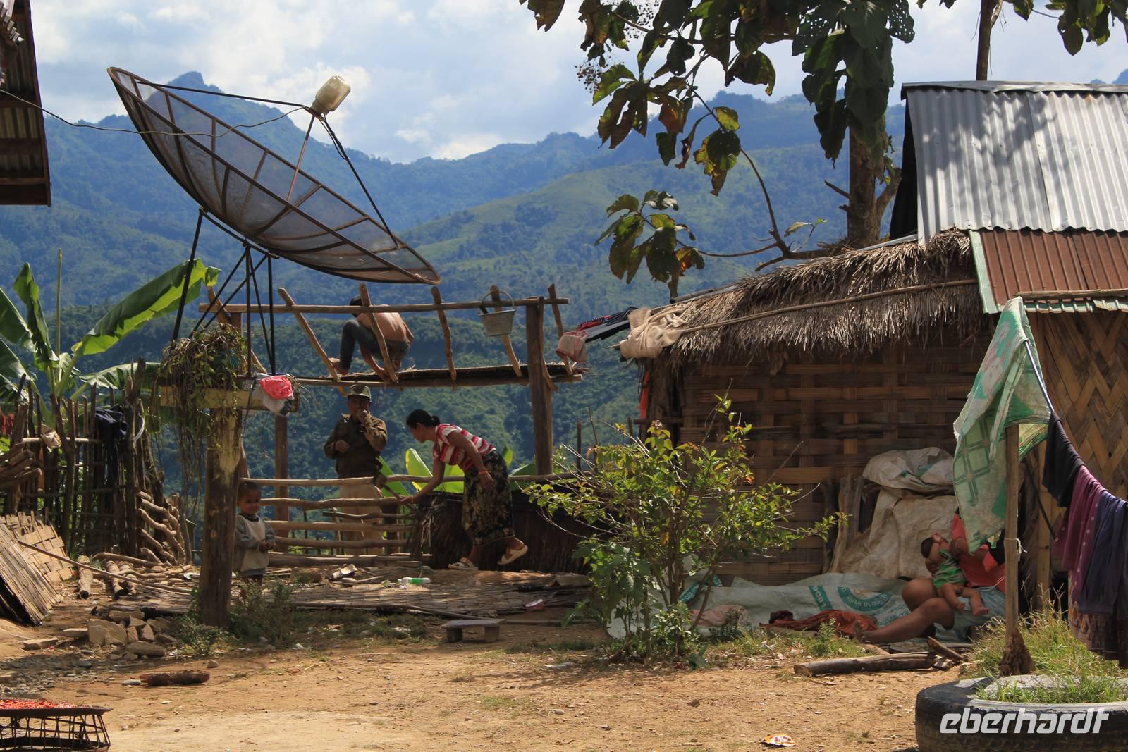 Ab jetzt geht es bergauf! Wir wollen das nordöstliche Hochland Laos' erklimmen und unser Bus schraubt sich schnaufen Serpentine um Serpentine nach oben. Über holprige Straßen und diversen Hindernissen wie Kühen, Hunden oder Mopeds ausweichend, geht es für uns bis auf 1.900 Meter hinauf. Auf unserer schunkelnden Fahrt begegnen wir immer wieder kleinen Bergdörfern, in denen Stämme der 15% Minderheiten in Laos leben. Und das in einfachsten Lehm- und Bambushütten, mit einer Feuerstelle neben dem Haus und Matten aus Stroh im Inneren. Das durchschnittliche Jahreseinkommen in Laos liegt bei 1.300 USD, was erst mal unglaublich wenig erscheint, doch wenn man bedenkt, dass die hiesigen Völkchen nahezu ohne Einkommen leben, ergibt sich ein Bild.