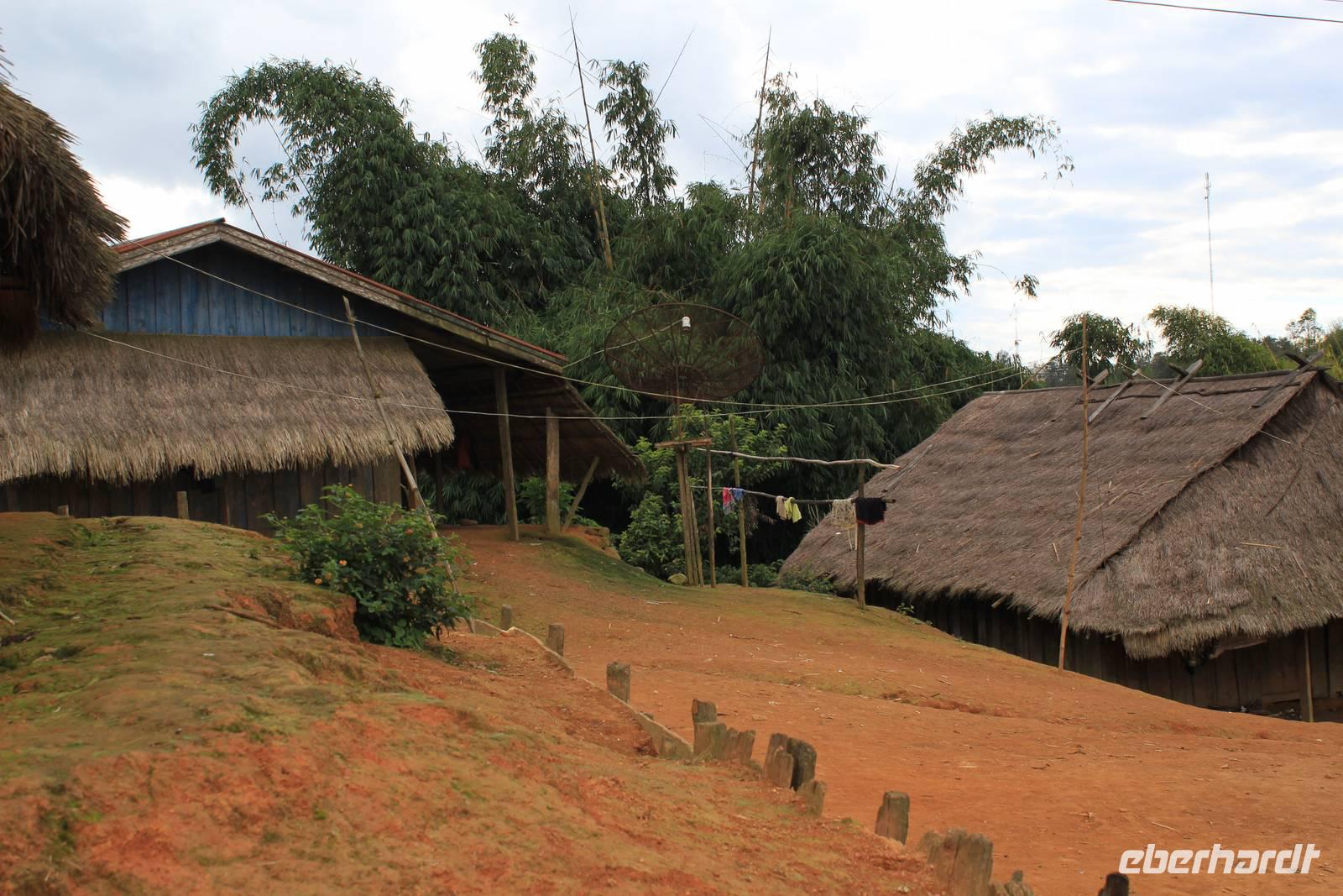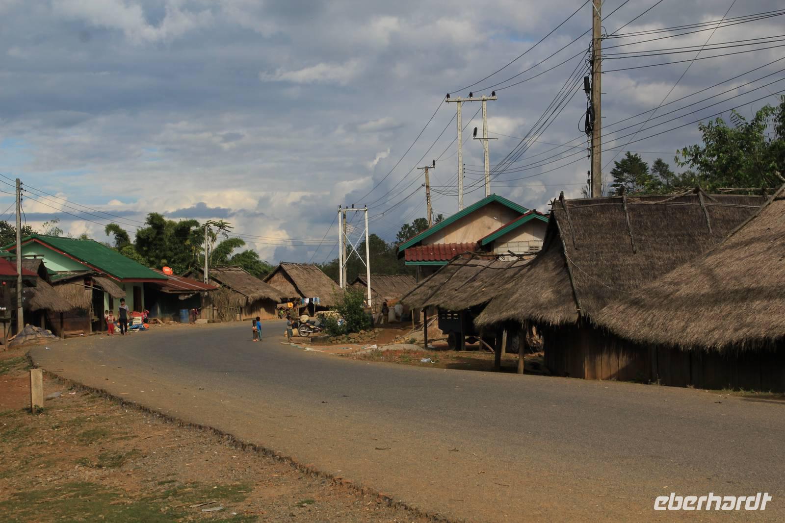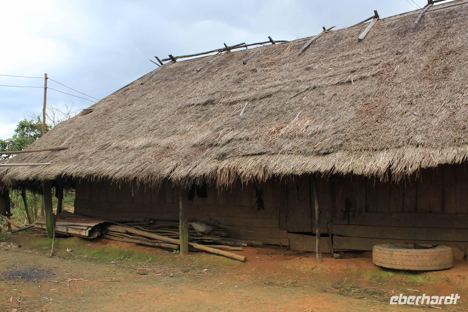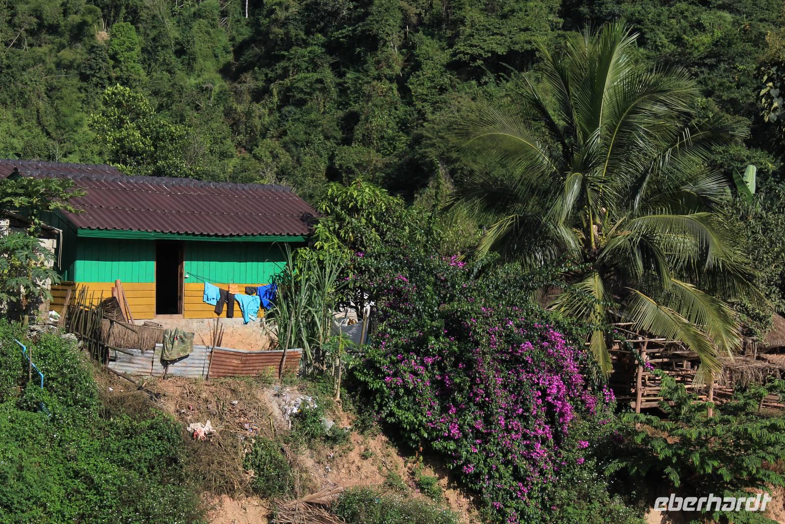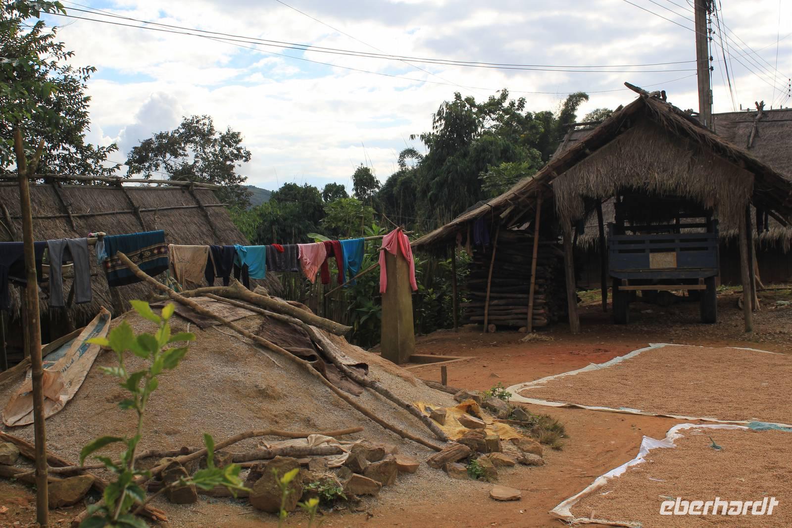 Ab jetzt geht es bergauf! Wir wollen das nordöstliche Hochland Laos' erklimmen und unser Bus schraubt sich schnaufen Serpentine um Serpentine nach oben. Über holprige Straßen und diversen Hindernissen wie Kühen, Hunden oder Mopeds ausweichend, geht es für uns bis auf 1.900 Meter hinauf. Auf unserer schunkelnden Fahrt begegnen wir immer wieder kleinen Bergdörfern, in denen Stämme der 15% Minderheiten in Laos leben. Und das in einfachsten Lehm- und Bambushütten, mit einer Feuerstelle neben dem Haus und Matten aus Stroh im Inneren. Das durchschnittliche Jahreseinkommen in Laos liegt bei 1.300 USD, was erst mal unglaublich wenig erscheint, doch wenn man bedenkt, dass die hiesigen Völkchen nahezu ohne Einkommen leben, ergibt sich ein Bild.