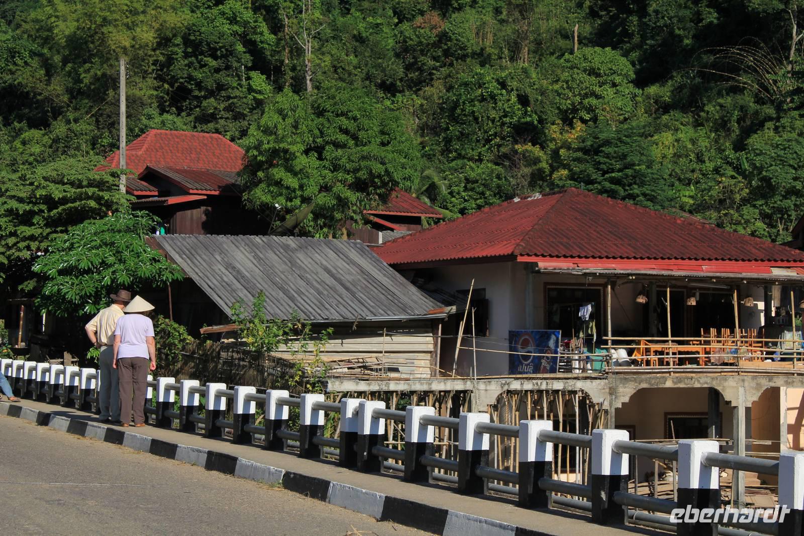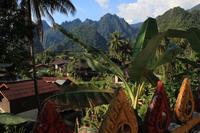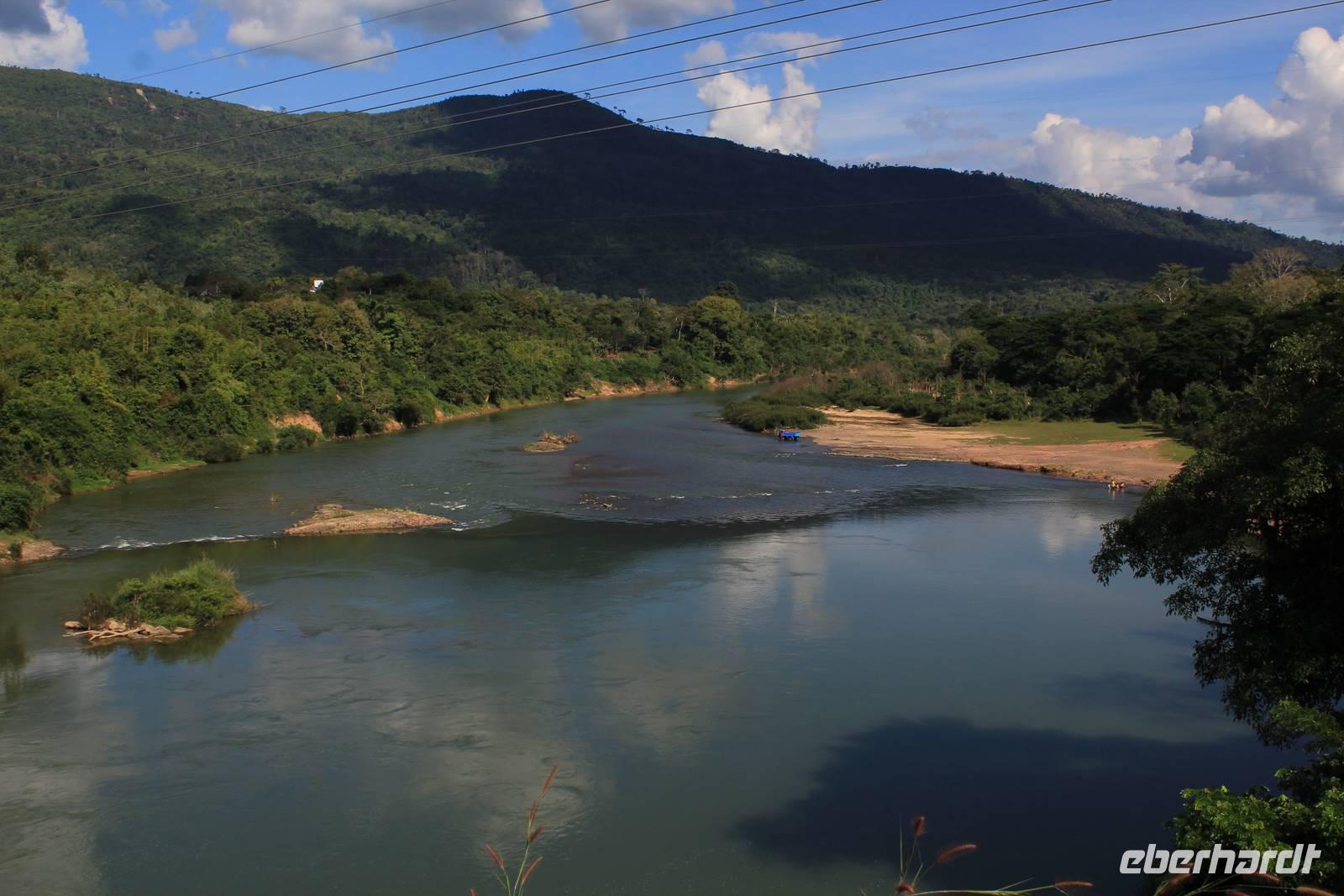 Eine Mittagspause machen wir in einem laotischen Restaurant, in dem wir uns gebratenen Reis und Nudeln schmecken lassen! Bei unserer Weiterfahrt wird die Landschaft zunehmend hügeliger, ja fast schon bergig! Die wunderschöne Karstlandschaft, bedeckt mit dichtem saftig grünem Urwald, ist gespickt mit bunten Dörfchen und Märkten, die sich beständig durch die Landschaft ziehen.
