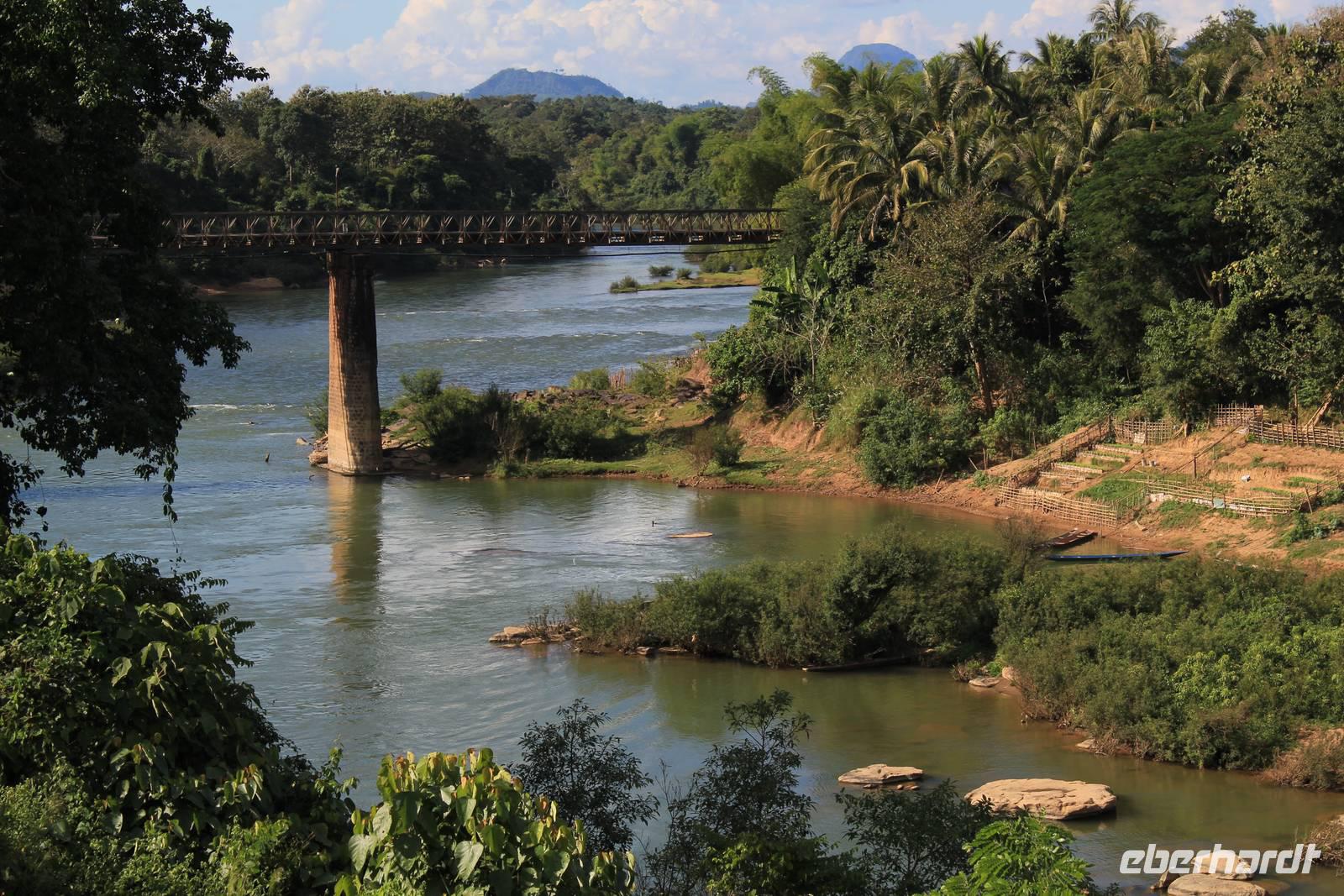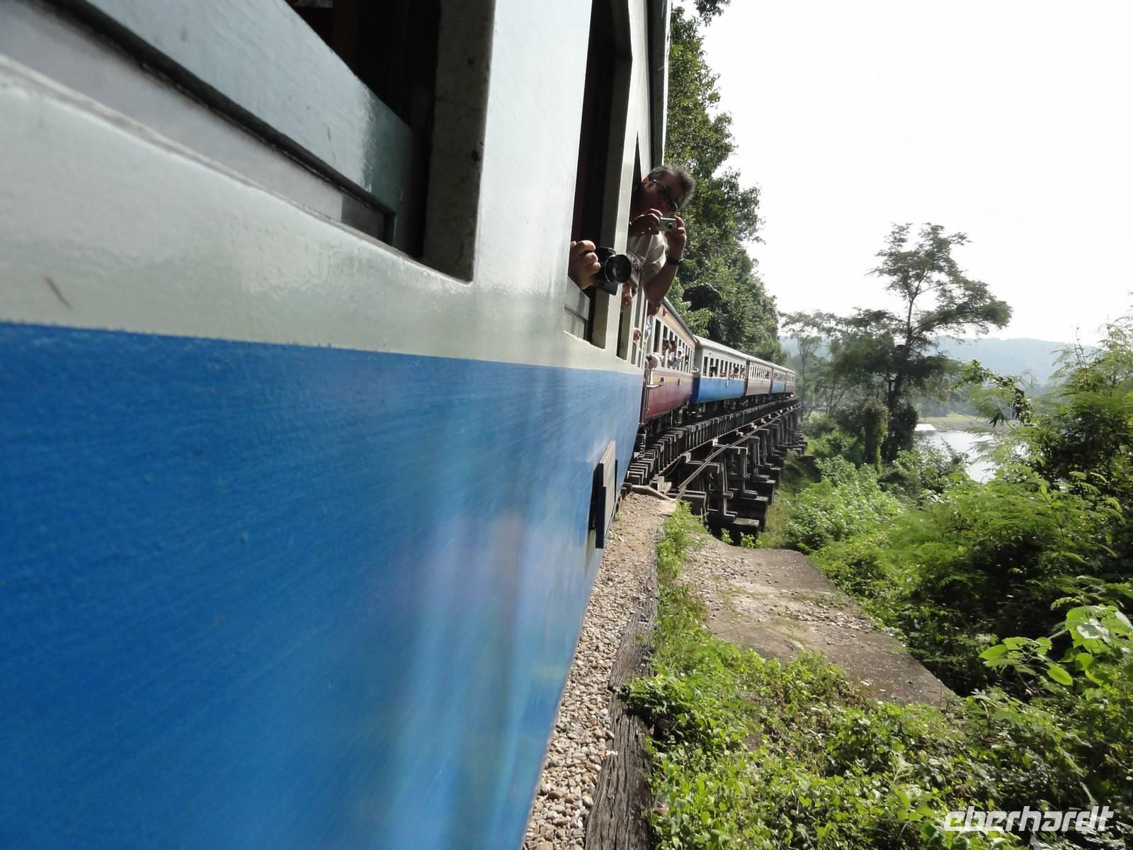 Wo wir einmal bestürzt und betroffen sind, besuchen wir gleich noch den Soldatenfriedhof, der an die 6.982 Gefallenen erinnert, die während des Krieges ihr Leben ließen. Danach geht es nun endlich zur Brücke am Kwai, deren Originalkonstruktion aus Teakholz bestand. Heute finden wir hier eine Nachbildung aus Stahl vor. Wir bummeln über den Platz, knipsen unsere Fotos und warten auf den legendären „Todeszug", der dann auch mit fast 1 Stunde Verspätung eintrifft (gehört der etwa zur Deutschen Bahn...?) In guten 2 Stunden rattern wir geräuschvoll durch die grüne Landschaft, vorbei an Zuckerrohr-, Reis- und Maniokfeldern. Immer wieder passieren wir kleine Dörfchen und von Zeit zu Zeit eröffnet sich uns der Blick auf den Fluss. Unsere Fahrt endet in Nam Tok - Endstation & Mittagspause!
