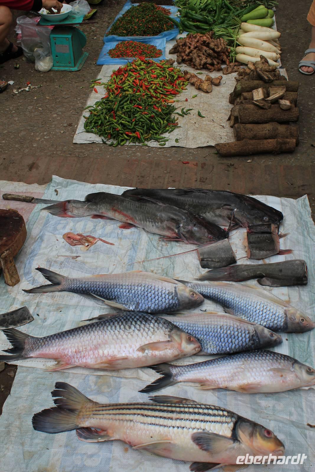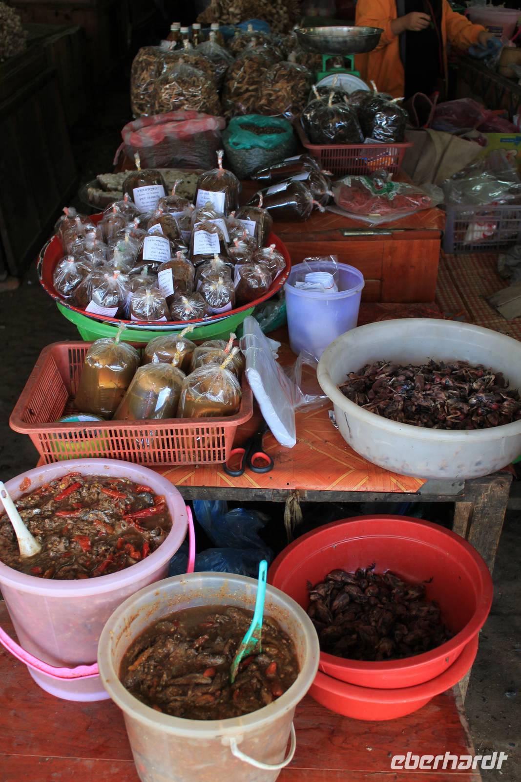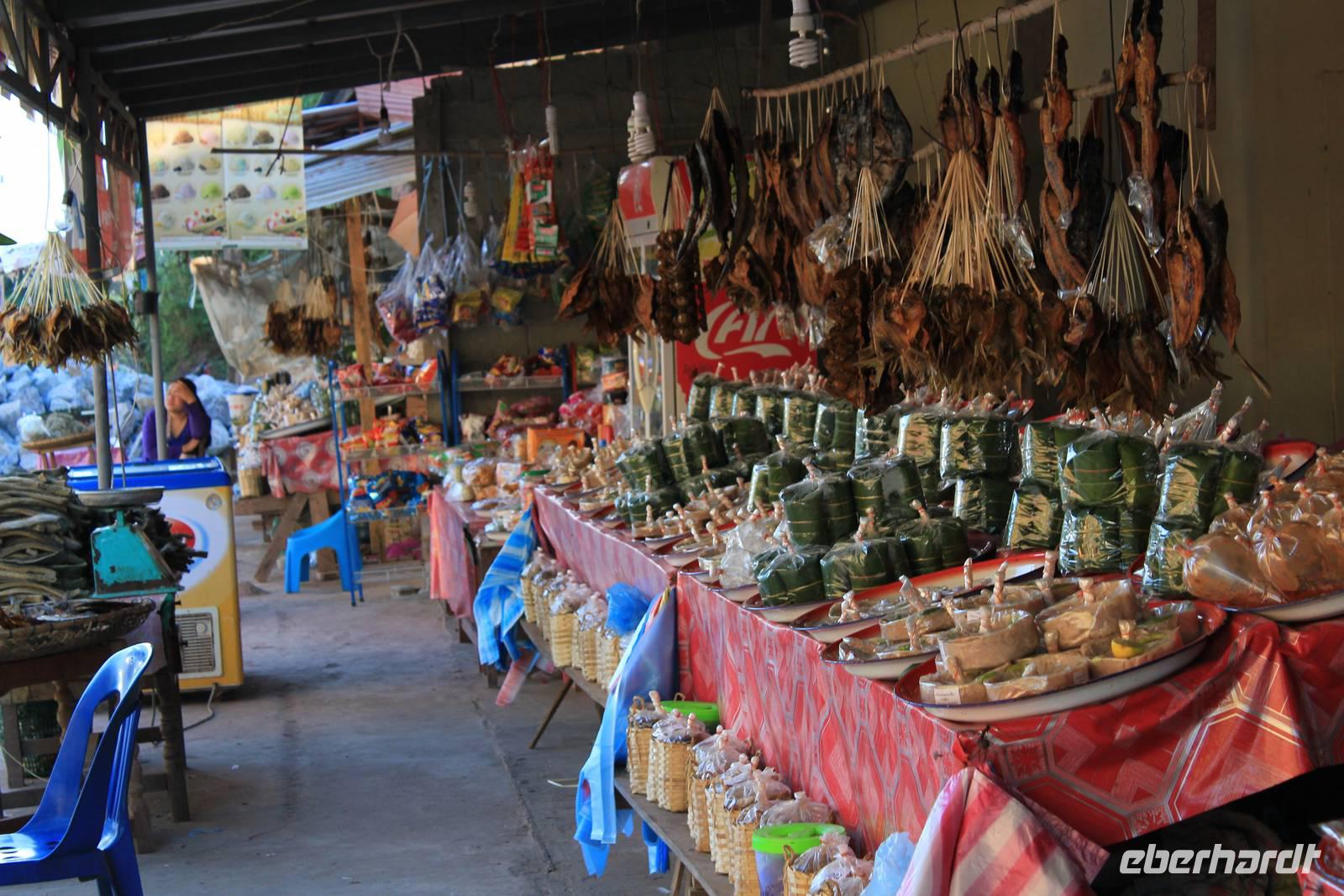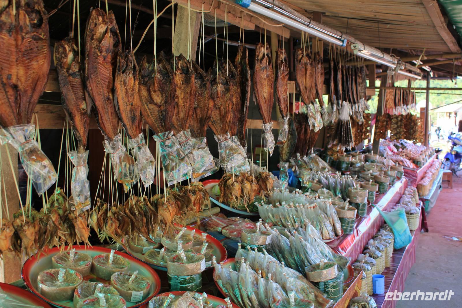 An einem Fischermarkt kommen wir in den Genuss den zum Verkauf angebotenen frischen, getrockneten und eingelegten Fisch des naheliegenden Stausees zu begutachten. Doch damit nicht genug! Auch noch quakende Frösche, rohes von Fliegen umschwirrtes Fleisch und noch mit Fell überzogene Büffelstreifen verkaufen die Händler(innen) emsig!
