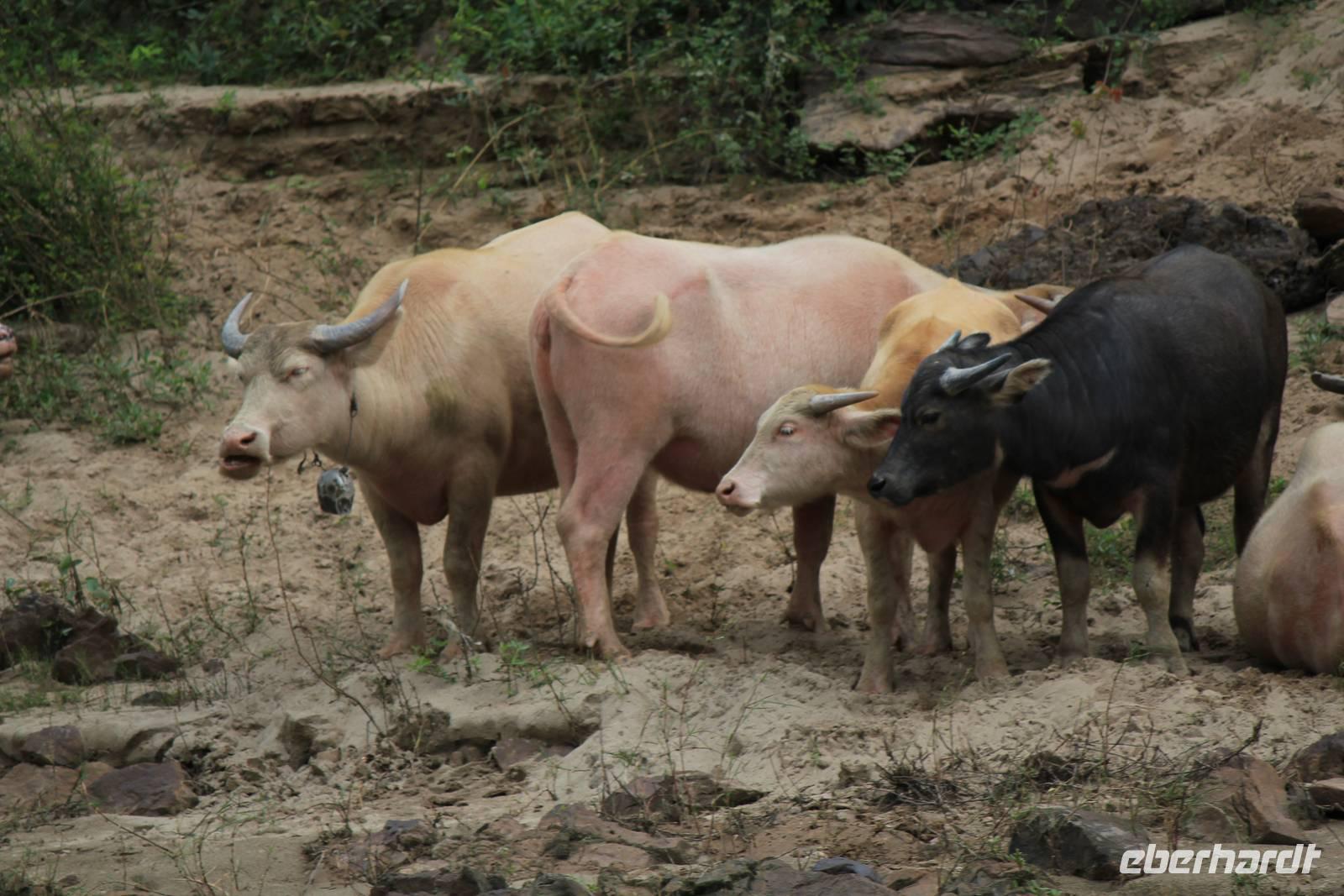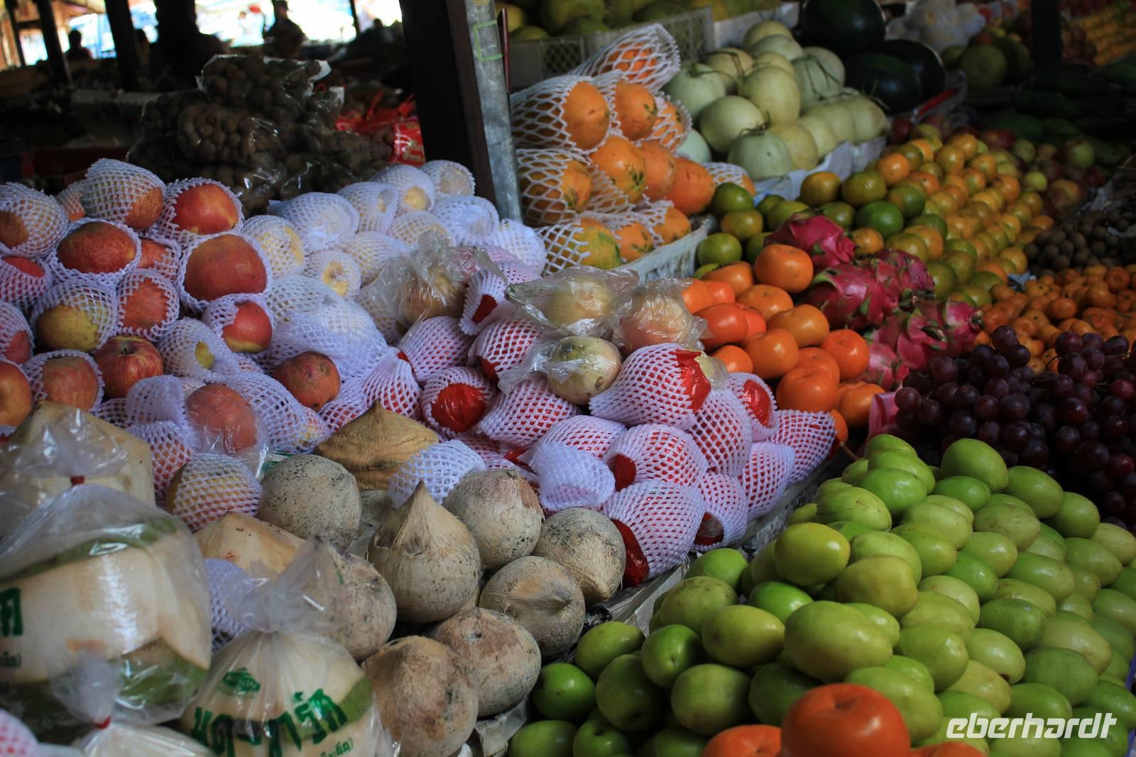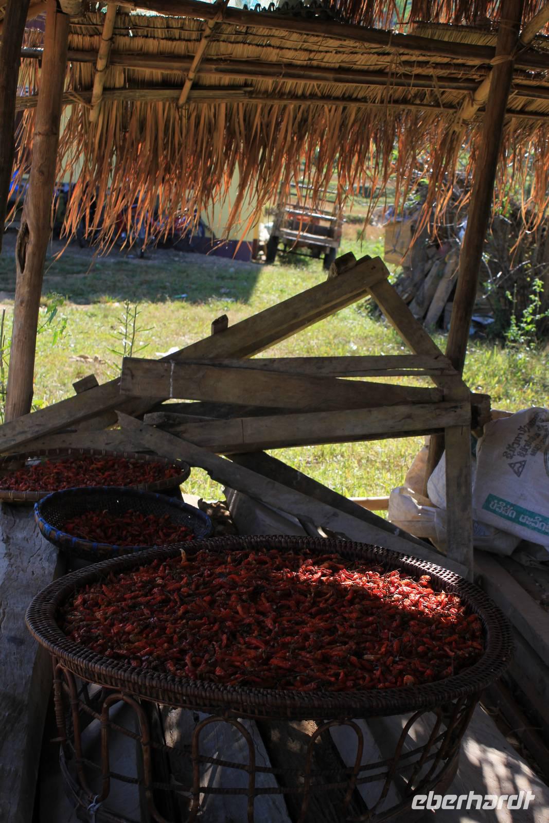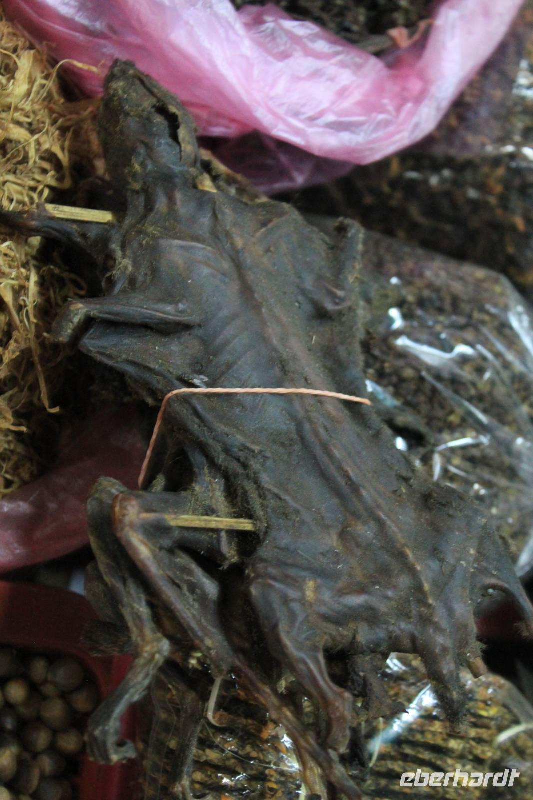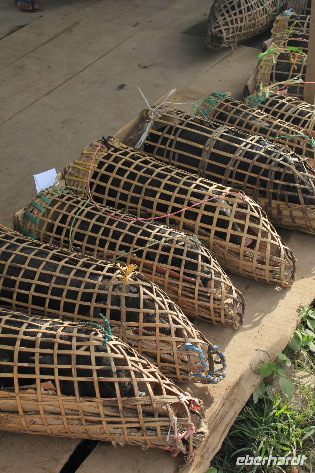 An einem Fischermarkt kommen wir in den Genuss den zum Verkauf angebotenen frischen, getrockneten und eingelegten Fisch des naheliegenden Stausees zu begutachten. Doch damit nicht genug! Auch noch quakende Frösche, rohes von Fliegen umschwirrtes Fleisch und noch mit Fell überzogene Büffelstreifen verkaufen die Händler(innen) emsig!