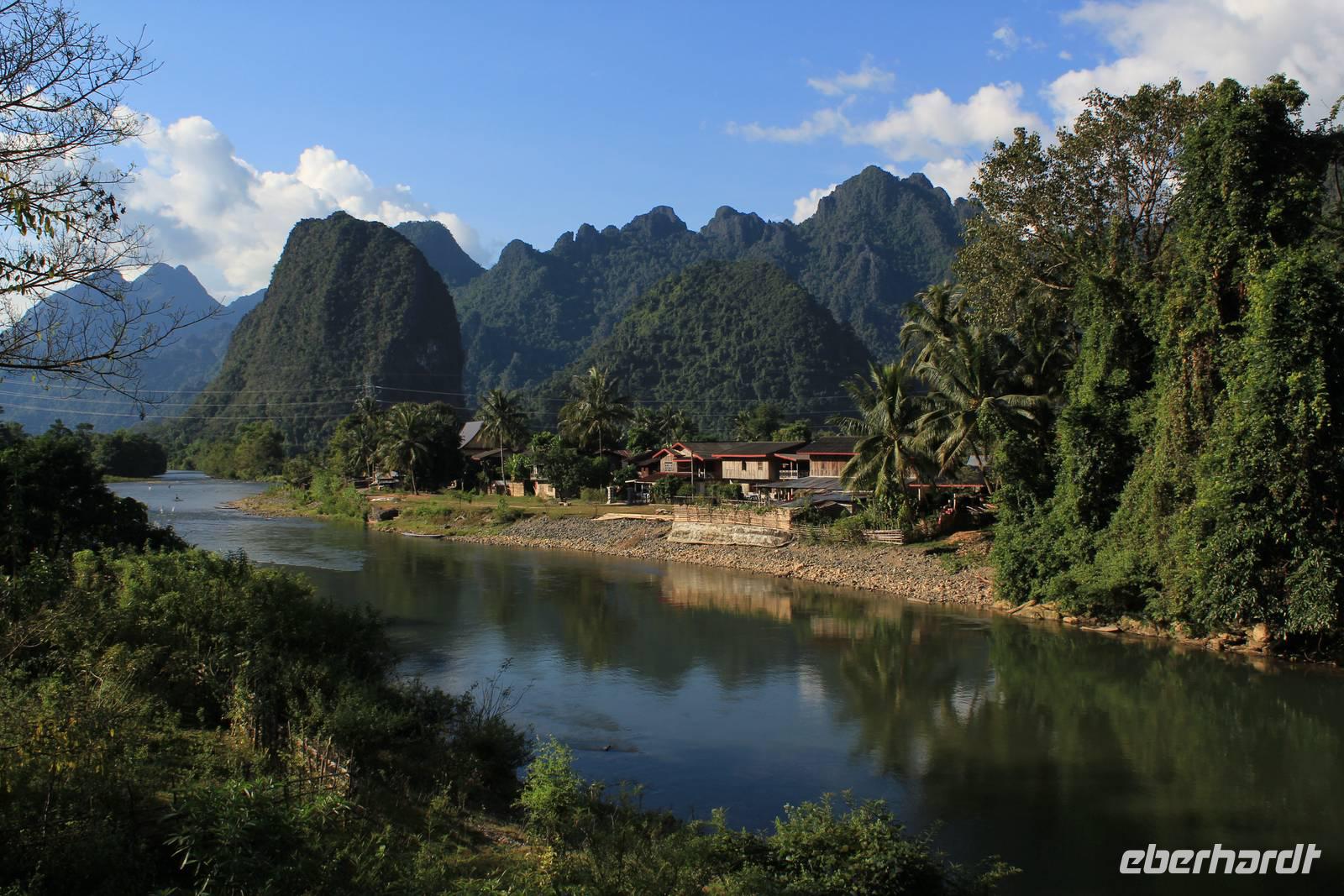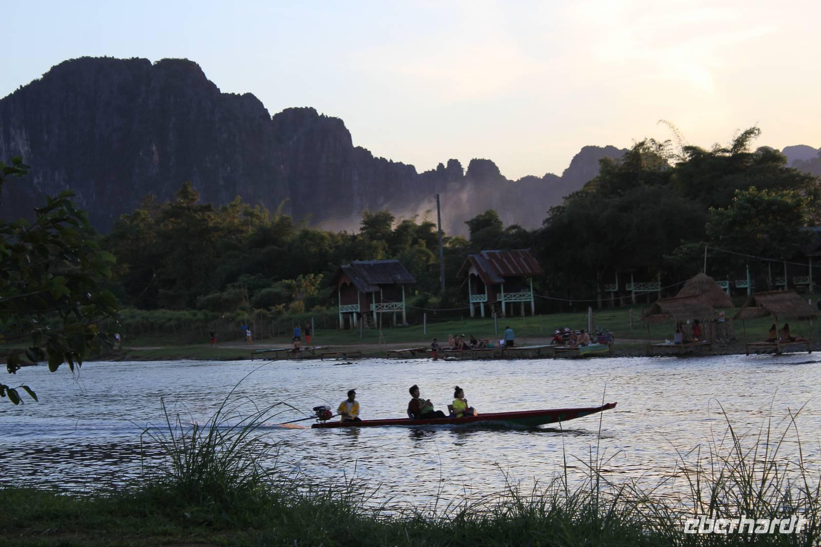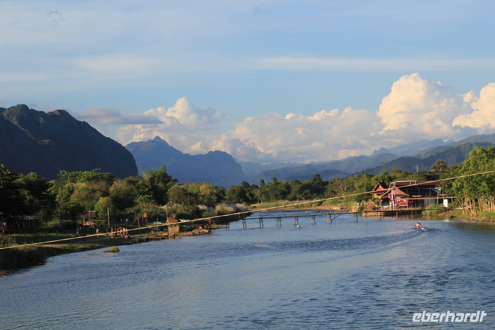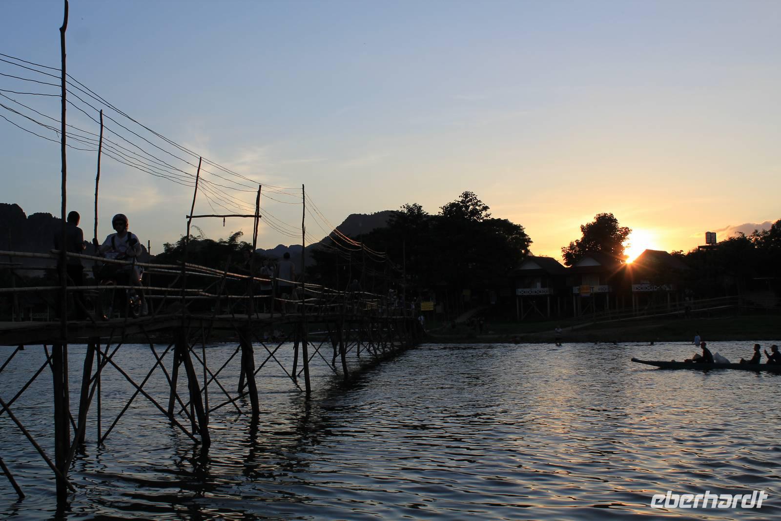 Jetzt ist es nicht mehr weit bis nach Vang Vieng, unserem Tagesziel. Das kleine Städtchen erinnert eher an ein verschlafenes Provinznest mit Gästehäusern, bunten Restaurants und Cafés, die den belebten Straßenrand zieren. Der Ort liegt wunderbar eingebettet in herrliche Kalksteinfelsen, direkt am Ufer des Nam Song Flusses. Und genau hier befindet sich auch unser Hotel „The Elephant Crossing". Pünktlich zum Sonnenuntergang unternehmen wir noch einen Spaziergang auf das andere Flussufer, erfreuen uns an der großartigen Landschaftsszene, dem bunten Treiben auf den Straßen und der wackeligen aus Holzlatten und Bambusstreben gezimmerten Hängebrücke, die den Fluss überquert .