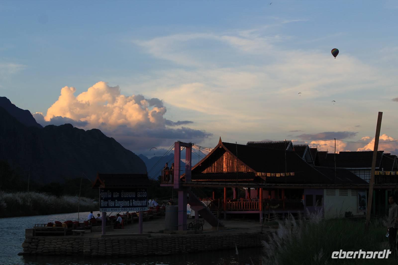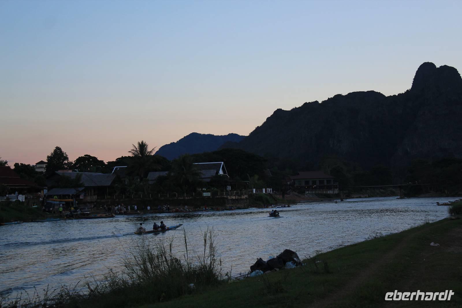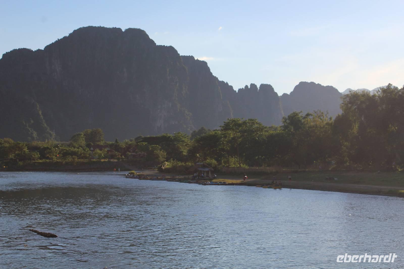Jetzt ist es nicht mehr weit bis nach Vang Vieng, unserem Tagesziel. Das kleine Städtchen erinnert eher an ein verschlafenes Provinznest mit Gästehäusern, bunten Restaurants und Cafés, die den belebten Straßenrand zieren. Der Ort liegt wunderbar eingebettet in herrliche Kalksteinfelsen, direkt am Ufer des Nam Song Flusses. Und genau hier befindet sich auch unser Hotel „The Elephant Crossing". Pünktlich zum Sonnenuntergang unternehmen wir noch einen Spaziergang auf das andere Flussufer, erfreuen uns an der großartigen Landschaftsszene, dem bunten Treiben auf den Straßen und der wackeligen aus Holzlatten und Bambusstreben gezimmerten Hängebrücke, die den Fluss überquert .