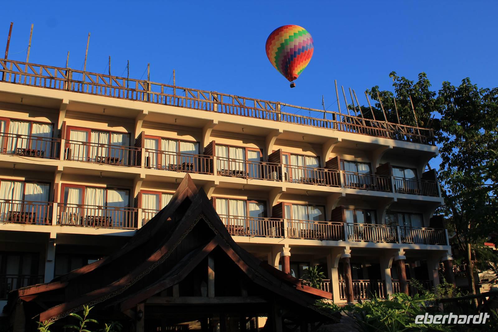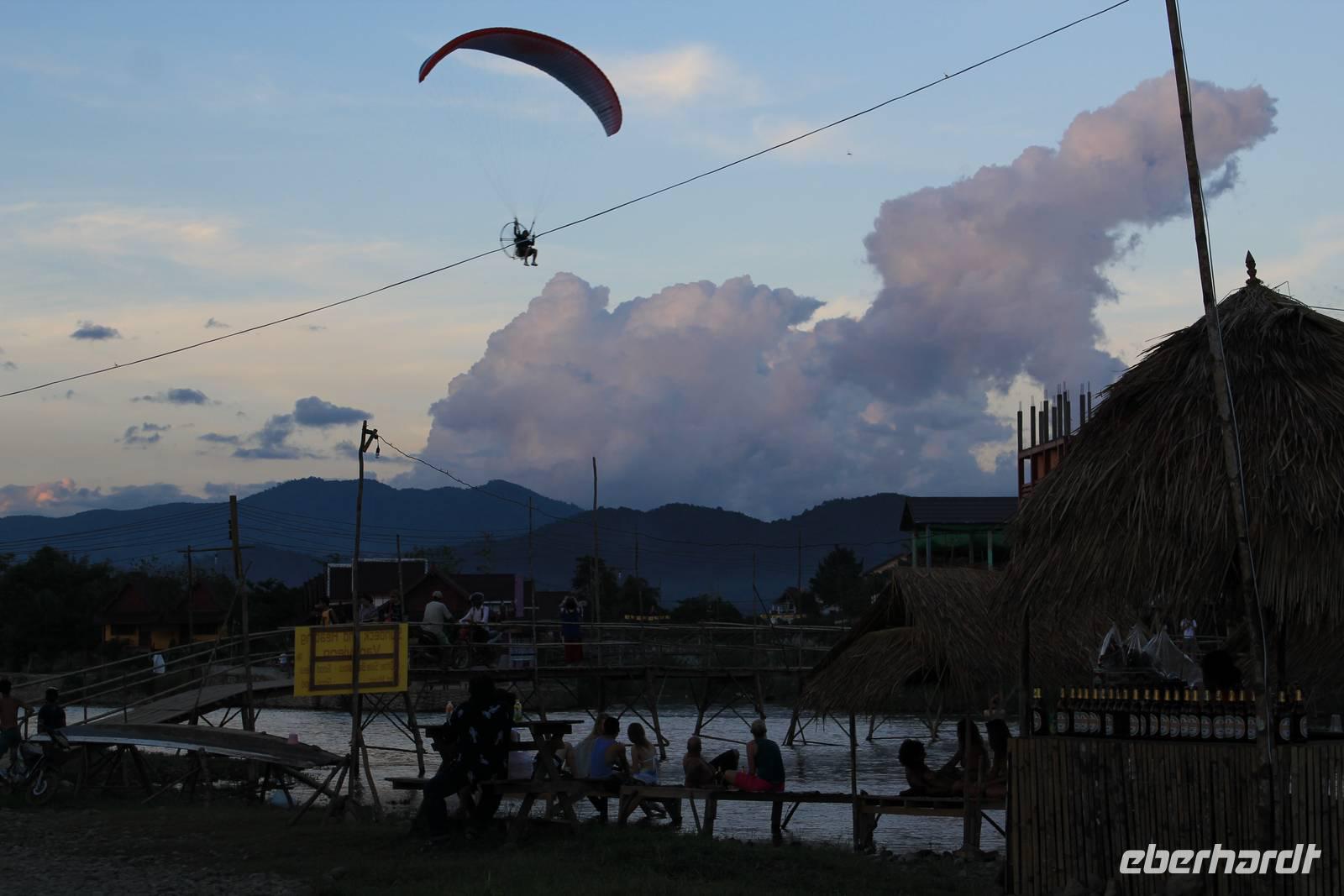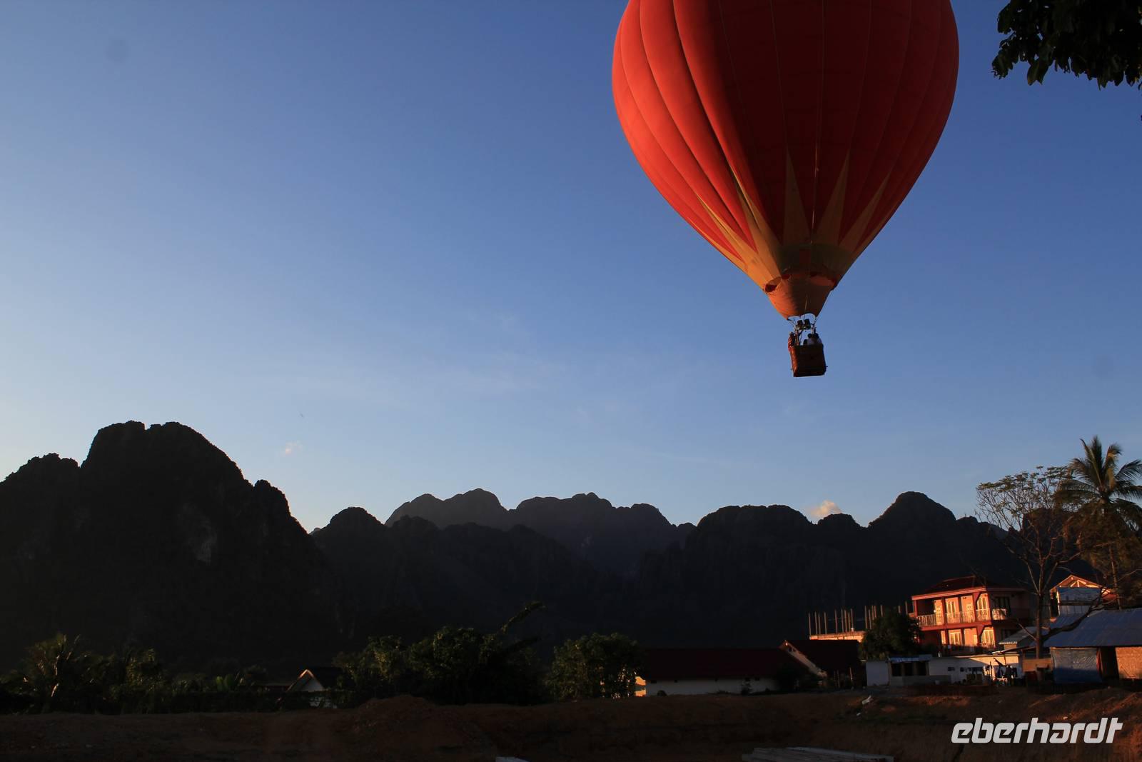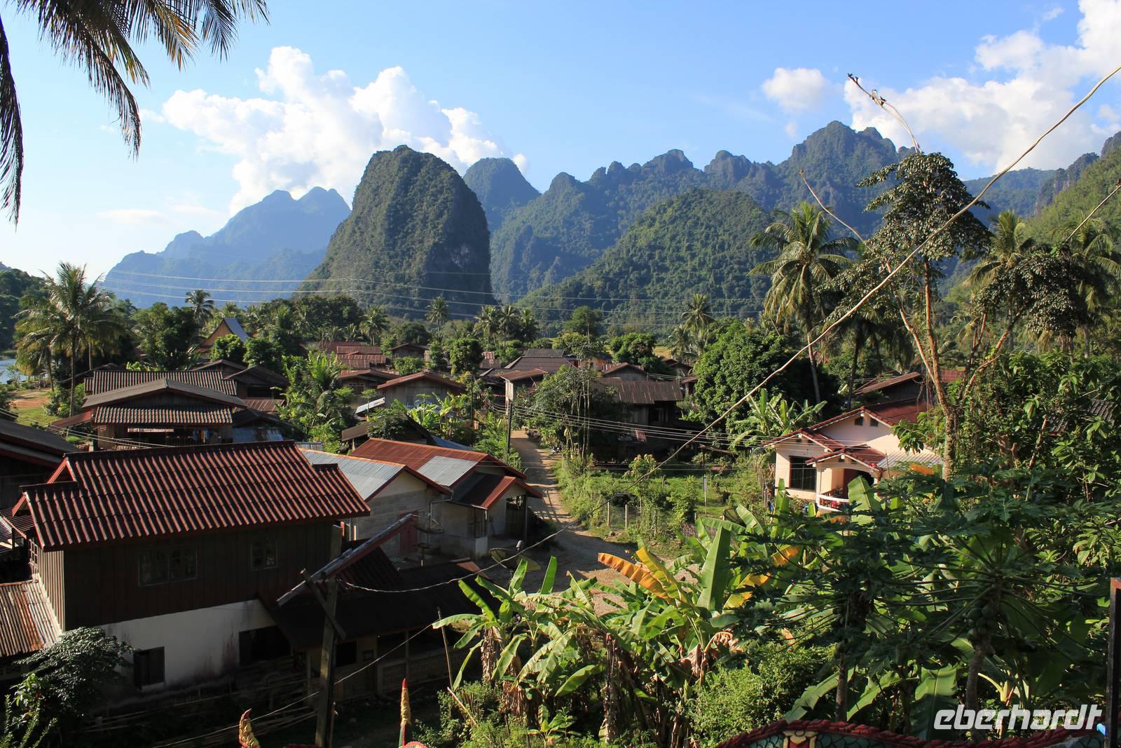 Jetzt ist es nicht mehr weit bis nach Vang Vieng, unserem Tagesziel. Das kleine Städtchen erinnert eher an ein verschlafenes Provinznest mit Gästehäusern, bunten Restaurants und Cafés, die den belebten Straßenrand zieren. Der Ort liegt wunderbar eingebettet in herrliche Kalksteinfelsen, direkt am Ufer des Nam Song Flusses. Und genau hier befindet sich auch unser Hotel „The Elephant Crossing". Pünktlich zum Sonnenuntergang unternehmen wir noch einen Spaziergang auf das andere Flussufer, erfreuen uns an der großartigen Landschaftsszene, dem bunten Treiben auf den Straßen und der wackeligen aus Holzlatten und Bambusstreben gezimmerten Hängebrücke, die den Fluss überquert .
