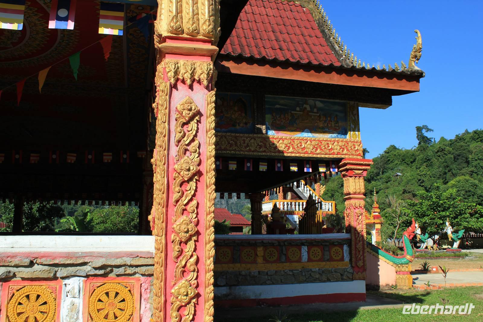 Den Tag beginnen wir mit einem Frühstück in atemberaubender Kulisse! Umringt von den bizarren Felsformationen, den Flussgeräuschen lauschend stärken wir uns für die heutigen Erlebnisse im „Land der tausend Elefanten", wie Laos einst tatsächlich hieß. Unser erster Halt gilt einer wunderschönen Klosteranlage im Dorf der Minderheit „Lao Lum", die im morgendlichen Sonnenlicht in einem ganz besonderen Glanz erstrahlt. Die goldenen, roten und weißen, nahezu futuristisch wirkenden Gebäude, verziert mit Schlangenschnitzereien, thronen hoch über dem Nam Song Fluss.