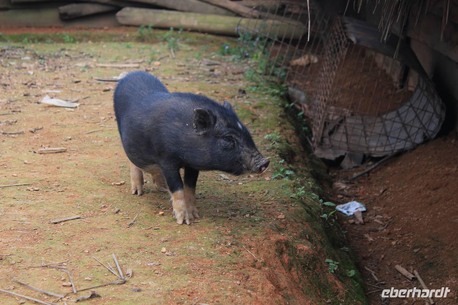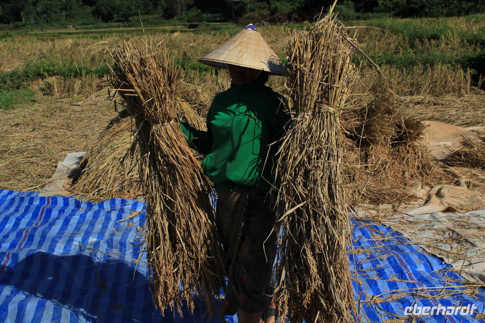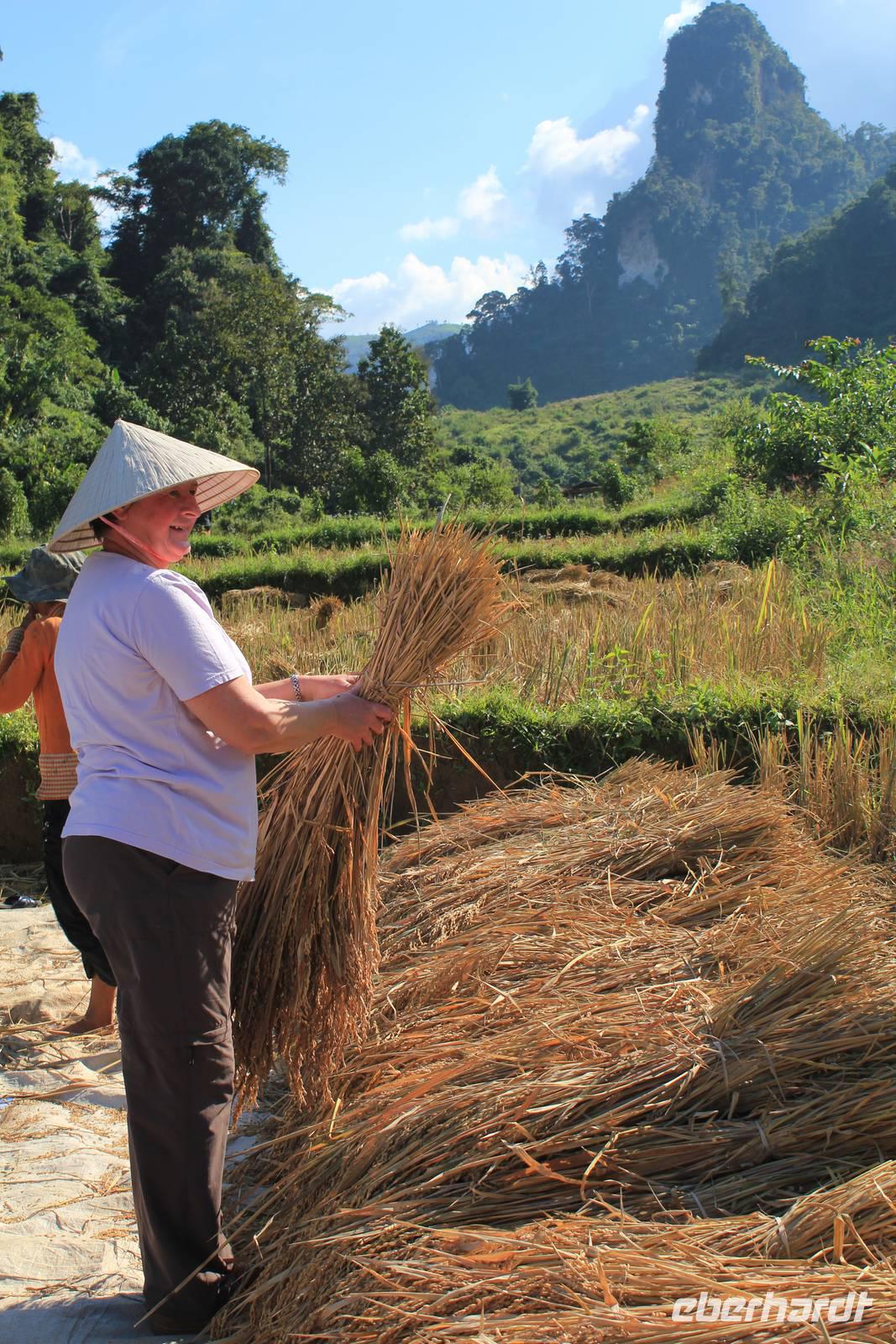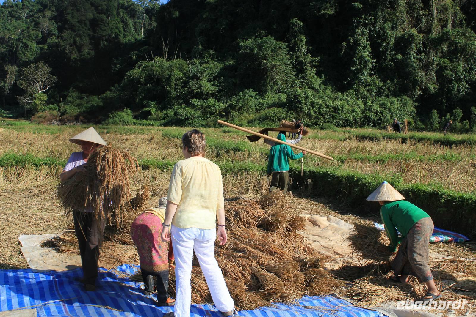 Spontan stoppen wir am Rande eines Reisfeldes, auf dem unter gleisender Sonne fleißig geerntet wird! Die Arbeiter schenken uns ihr freundliches Lächeln und tolle Fotomotive und dafür packen wir natürlich auch gern mit an! Und wenn wir heute nicht noch so viel vorhätten, würden wir auch länger bleiben, alles abwerfen und den Frauen und Männern unter die Arme greifen! Doch es sollte noch authentischer werden: wenig später besuchen wir ein Dorf der Minderheit „Kmu", die etwa auf halber Höhe in den Bergen leben. Die Bergvölker hier leben zu 100% von der Landwirtschaft und folgen einer Art Naturreligion. Es dauert keine 5 Minuten, schon sind wir umringt von einer ganzen Kinderschar! Sie strecken ihre kleinen schmutzigen Händchen nach unseren mitgebrachten Süßigkeiten aus und wollen alle was von den Gummibärchen, Bonbons und Überraschungseierfiguren abhaben! Immer mehr Kinder locken sie damit an und die Kleinen weichen uns beim Gang durch das Dorf nicht mehr von der Seite. Ein gegenseitiges fasziniertes Betrachten zwischen uns und den Kindern ist zu beobachten! Zwischen den Hütten wird gerade ein kleines Ferkel gegrillt, während junge Mädchen mit vollen Feuerholzkörben unseren Weg queren und uns mit ihren wachen dunklen Augen skeptisch mustern. Ein wahrhaftig authentisches Erlebnis, das aber gleichzeitig ein gewisses beklemmendes Gefühl zurück lässt wenn man sieht, wie zufrieden und harmonisch die Menschen hier gemeinsam leben. Wir denken unwillkürlich an unseren gewohnten Lebensstandard und rügen uns innerlich ein wenig selbst für unser gelegentliches „meckern auf sehr hohem Niveau".
