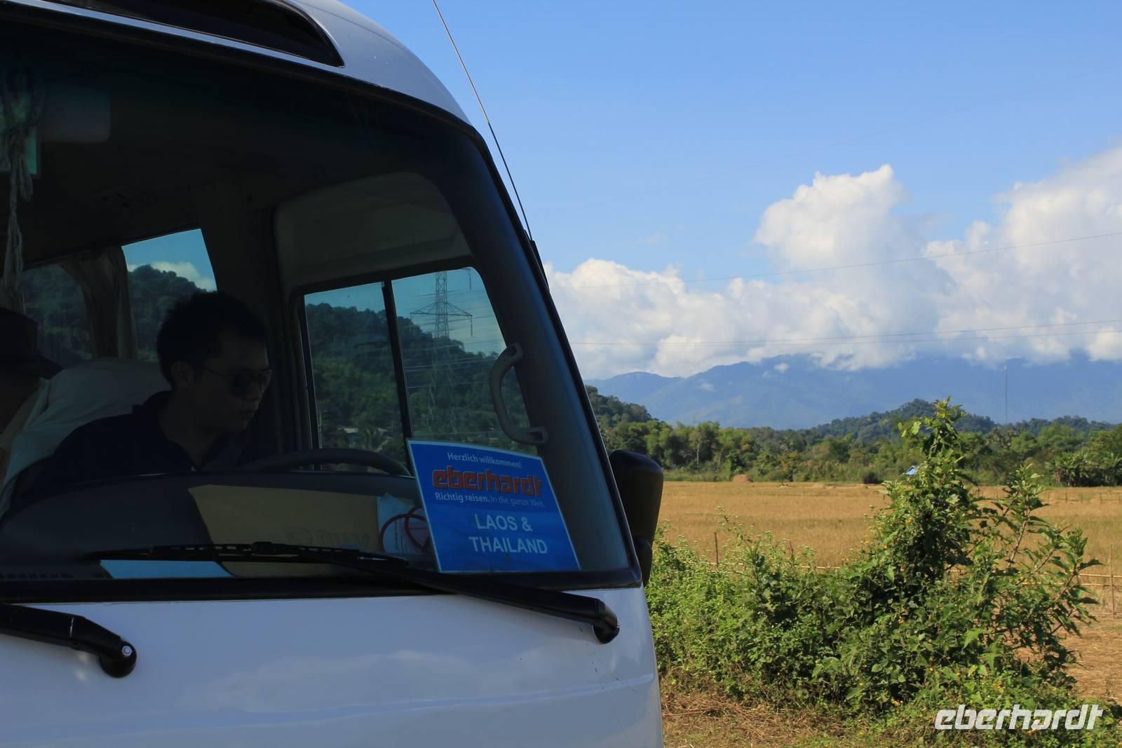 Gegen Mittag verlassen wir schließlich die Stadt und es geht raus aufs Land! Hier leben die Bewohner noch zu 80% von der Landwirtschaft und wir staunen über die Laoten, die auf ihren Motorrollern und Fahrrädern Bambusstangen, Metallteile und Baumaterialen (natürlich alles quer!) transportieren und wie unser Busfahrer Slalom um Mensch, Büffel und Tuk-Tuk fährt! Bei einigen Stopps unterwegs freunden wir uns mit der Kultur und Natur Laos' immer weiter an, so halten wir zum Beispiel bei einer großen, bunten Familienfeier, bei der uns die Einheimischen gleich zum Bleiben überreden wollen! Auch bei einer Polizeikontrolle mit einem wohl leicht angeheiterten laotischen Beamten kommen wir auf unsere Kosten.