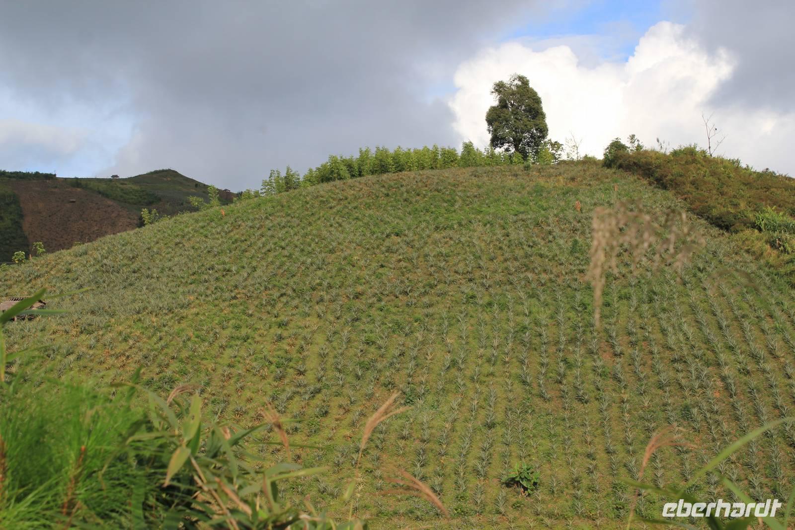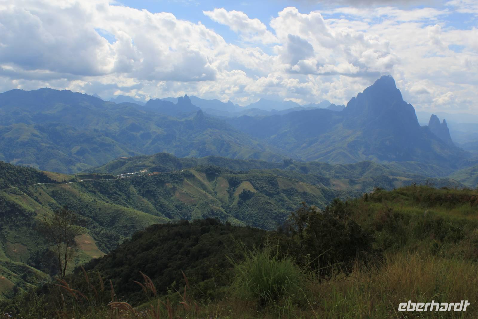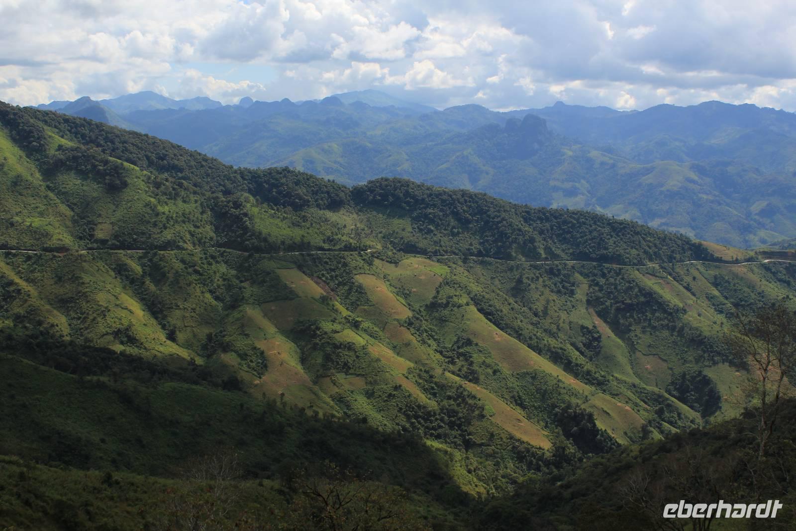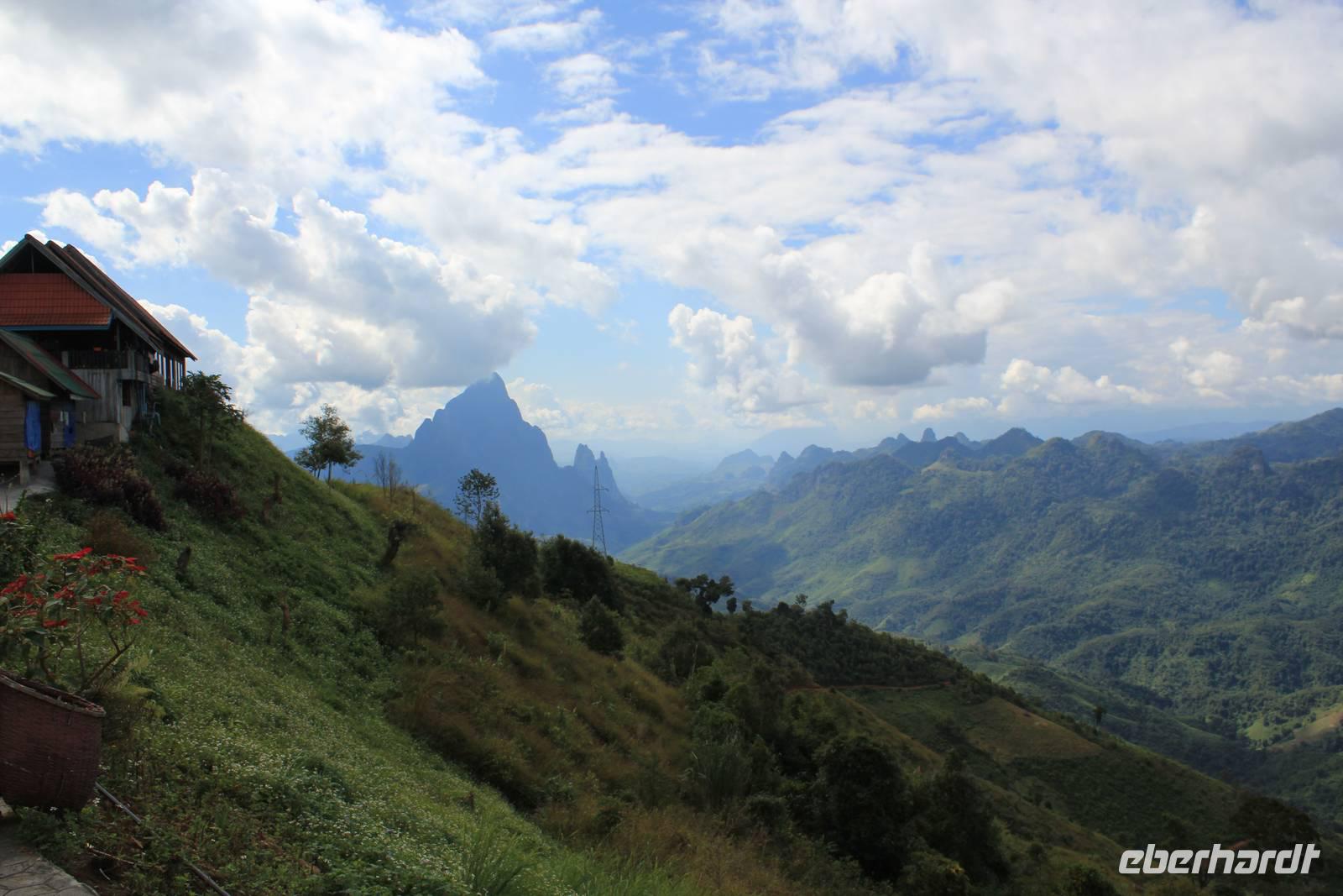 Es ist Mittagszeit und kein besserer Platz bietet sich an, als ein Restaurant hoch oben in den Bergen, mit einem sagenhaften Panorama der umliegenden Dschungelwelt! Ein paar Portionen gebratene Nudeln später führt uns unser Weg weiter durch die Berge, wobei wir viele Ananasplantagen, Reisfelder, Bananenbäume und immer wieder kleine Märkte und Dörfer passieren. Die Ursprünglichkeit von Laos könnte uns mit der heutigen Etappe nicht besser vor Augen geführt werden!