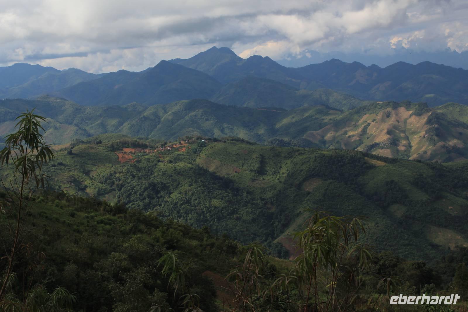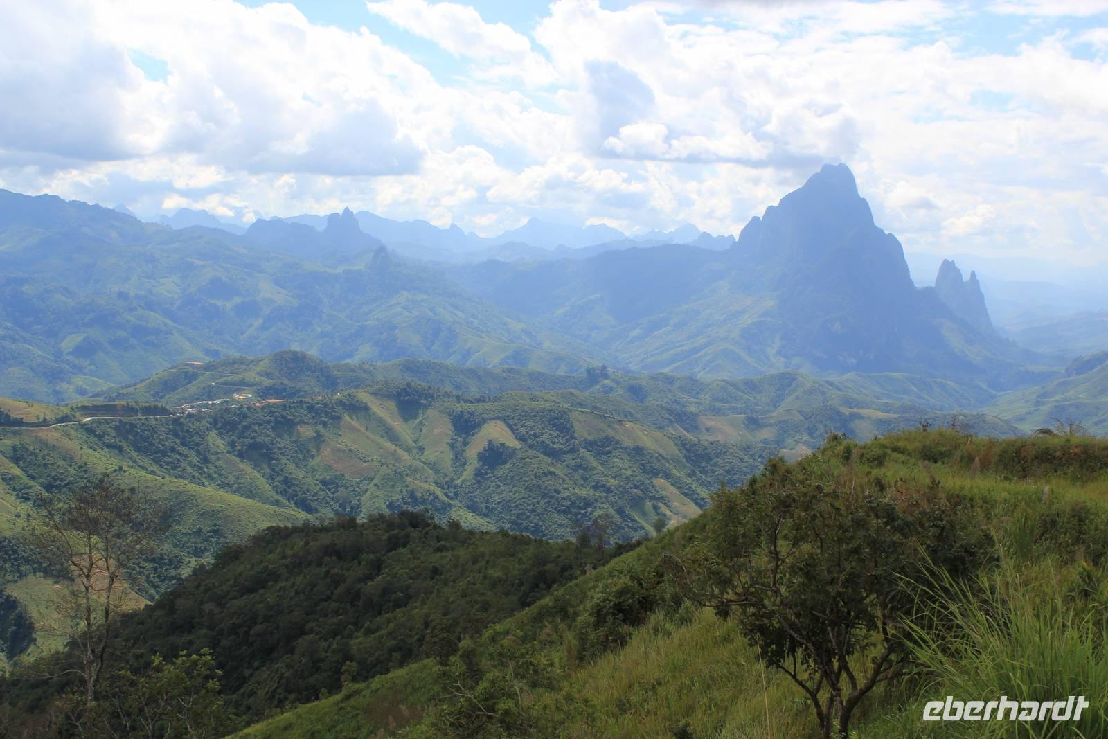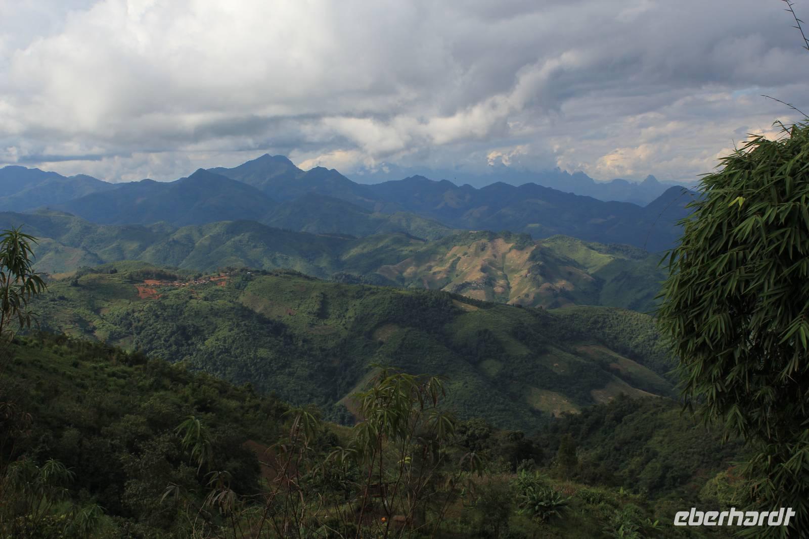 Es ist Mittagszeit und kein besserer Platz bietet sich an, als ein Restaurant hoch oben in den Bergen, mit einem sagenhaften Panorama der umliegenden Dschungelwelt! Ein paar Portionen gebratene Nudeln später führt uns unser Weg weiter durch die Berge, wobei wir viele Ananasplantagen, Reisfelder, Bananenbäume und immer wieder kleine Märkte und Dörfer passieren. Die Ursprünglichkeit von Laos könnte uns mit der heutigen Etappe nicht besser vor Augen geführt werden!