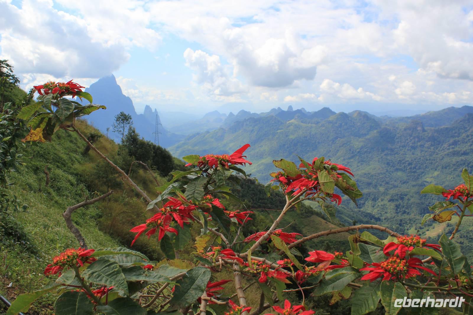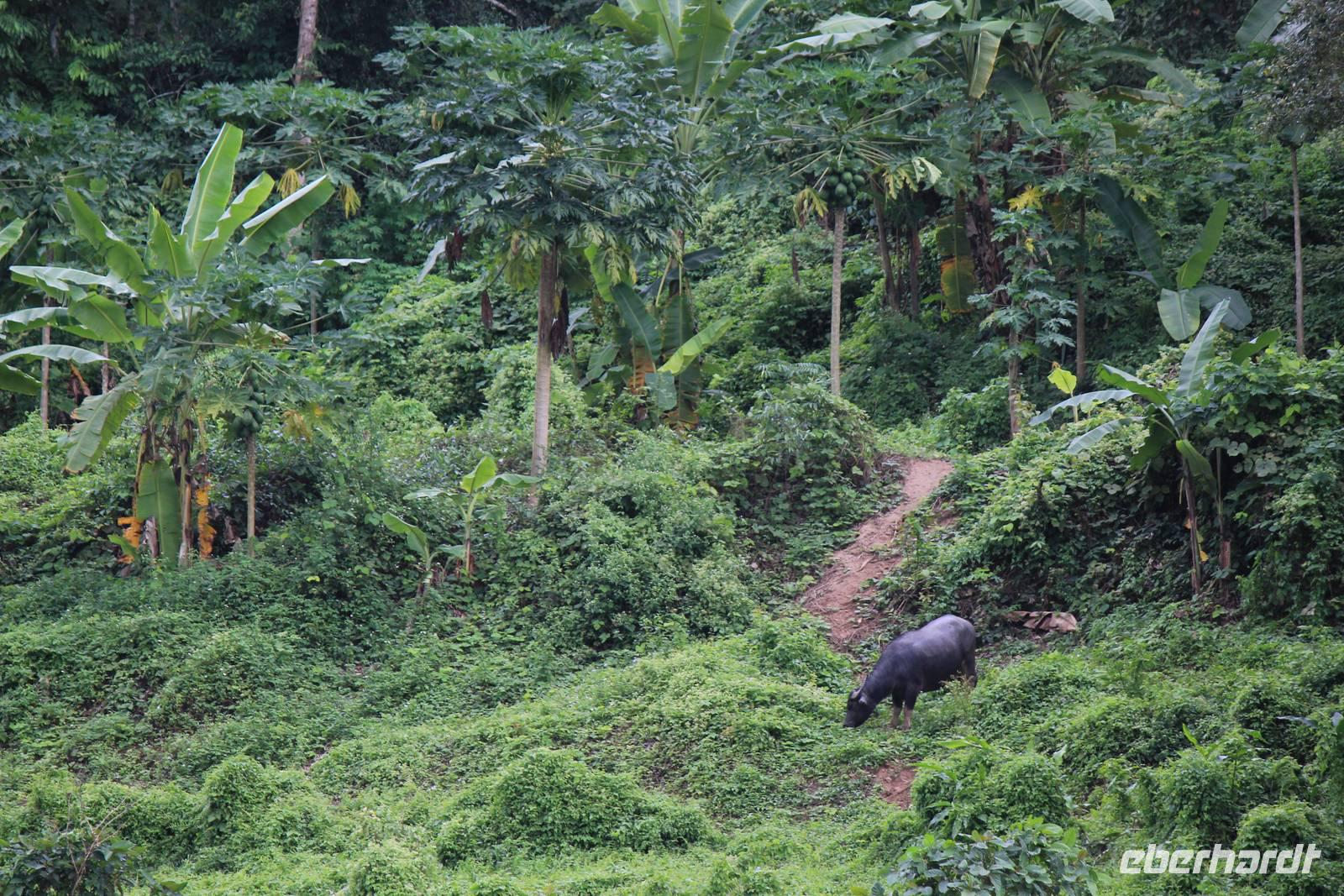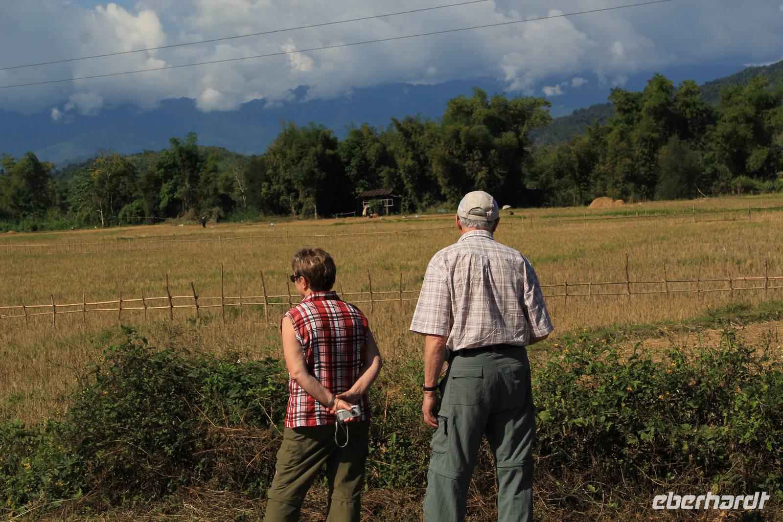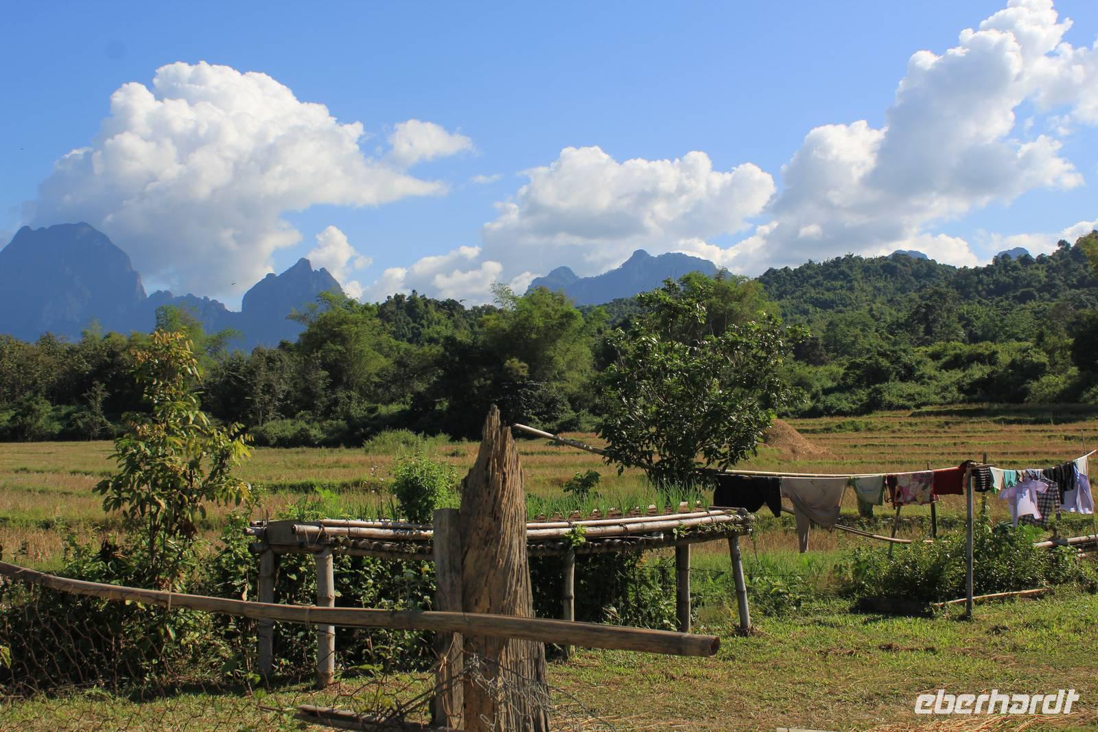 Es ist Mittagszeit und kein besserer Platz bietet sich an, als ein Restaurant hoch oben in den Bergen, mit einem sagenhaften Panorama der umliegenden Dschungelwelt! Ein paar Portionen gebratene Nudeln später führt uns unser Weg weiter durch die Berge, wobei wir viele Ananasplantagen, Reisfelder, Bananenbäume und immer wieder kleine Märkte und Dörfer passieren. Die Ursprünglichkeit von Laos könnte uns mit der heutigen Etappe nicht besser vor Augen geführt werden!