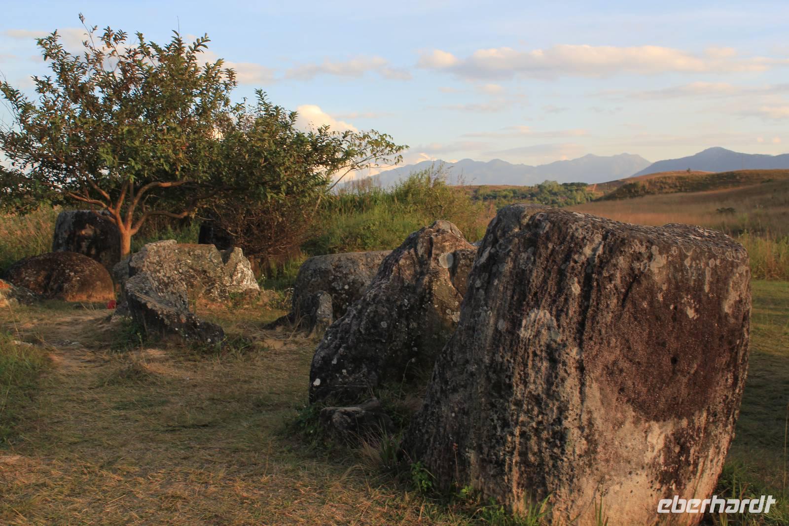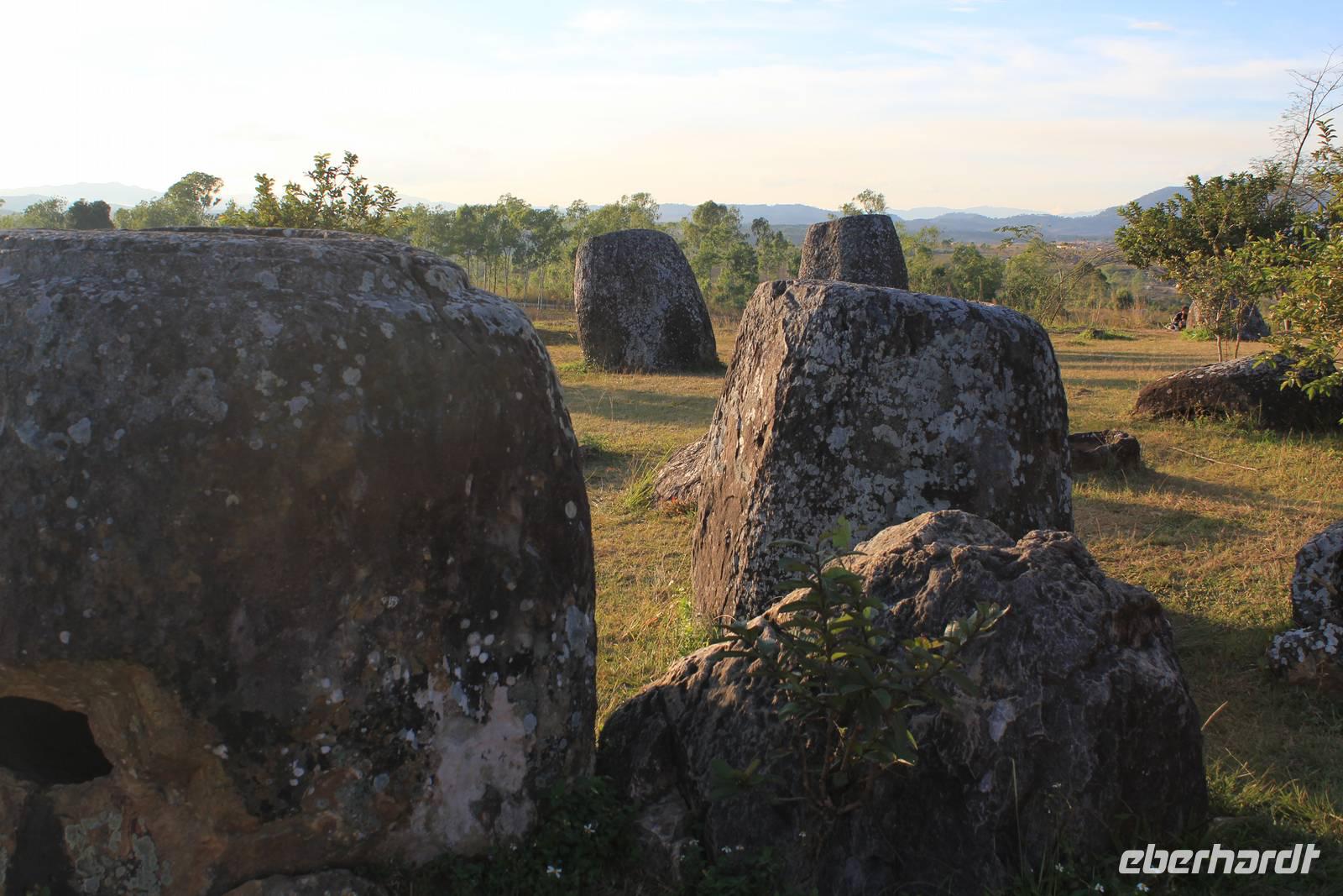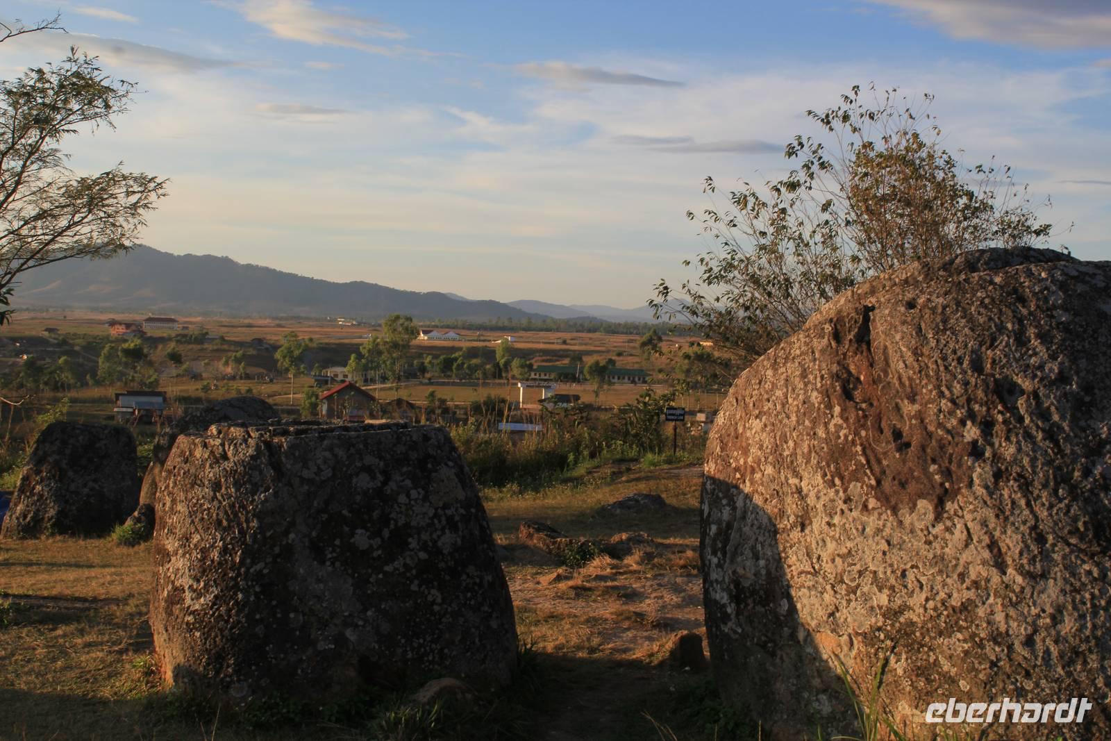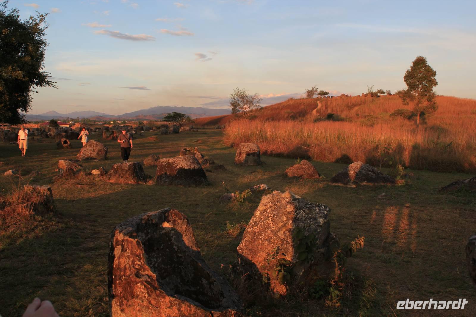 Pünktlich, als die Sonne sich gerade daran macht die Landschaft in ein warmes Abendrot zu tauchen, erreichen wir die berühmte Ebene der Tonkrüge auf der Hochebene Thang Hay in der Provinz Xieng Khuang. Bis 1973 wurde hier fast jede Stadt der Provinz durch Bombardierungen während des Indochina-Krieges zerstört. Rund 2 Tonnen Munition kamen auf einen Einwohner und bis heute sind einige Gebiete in der Umgebung noch nicht entmint.